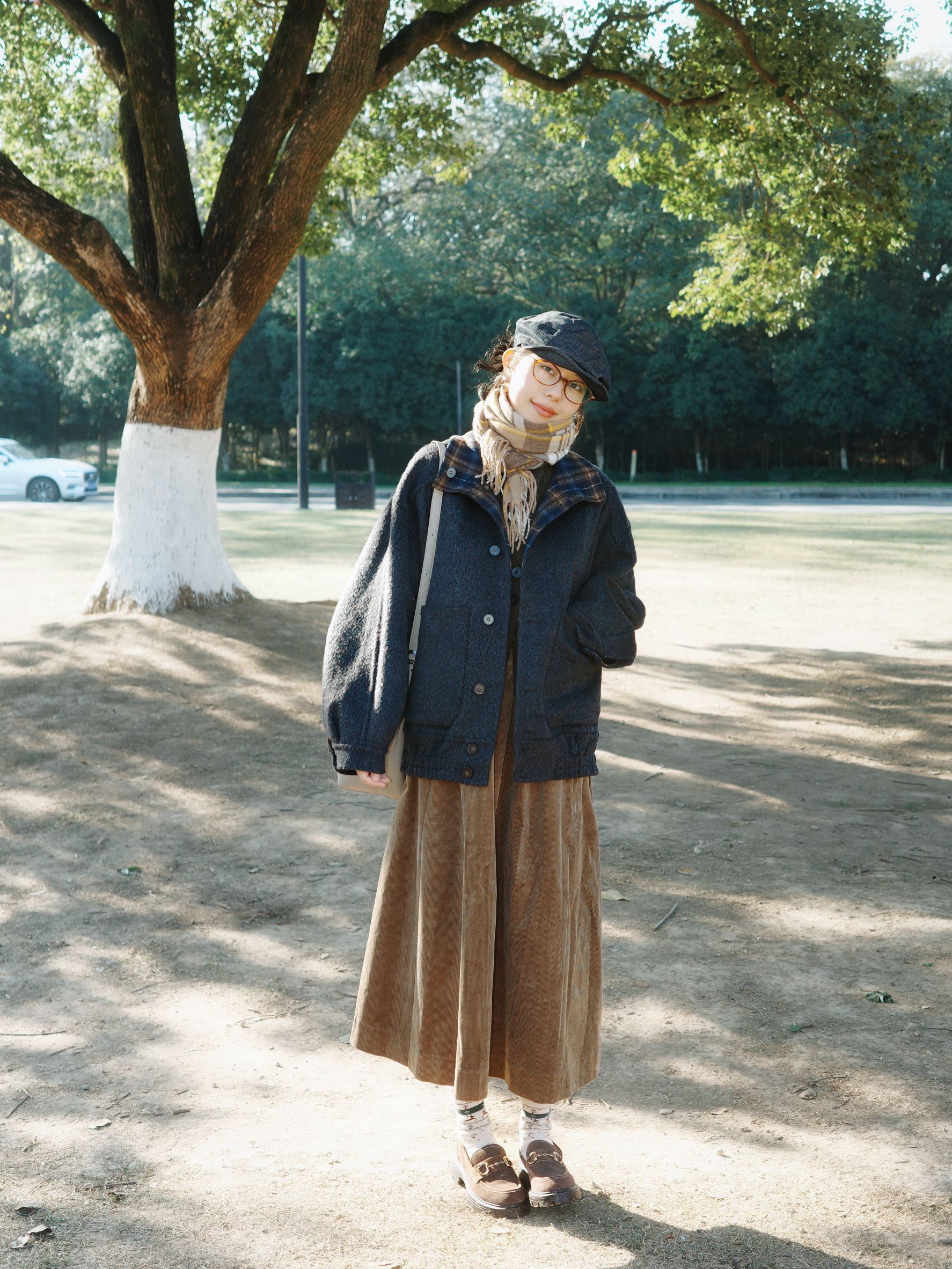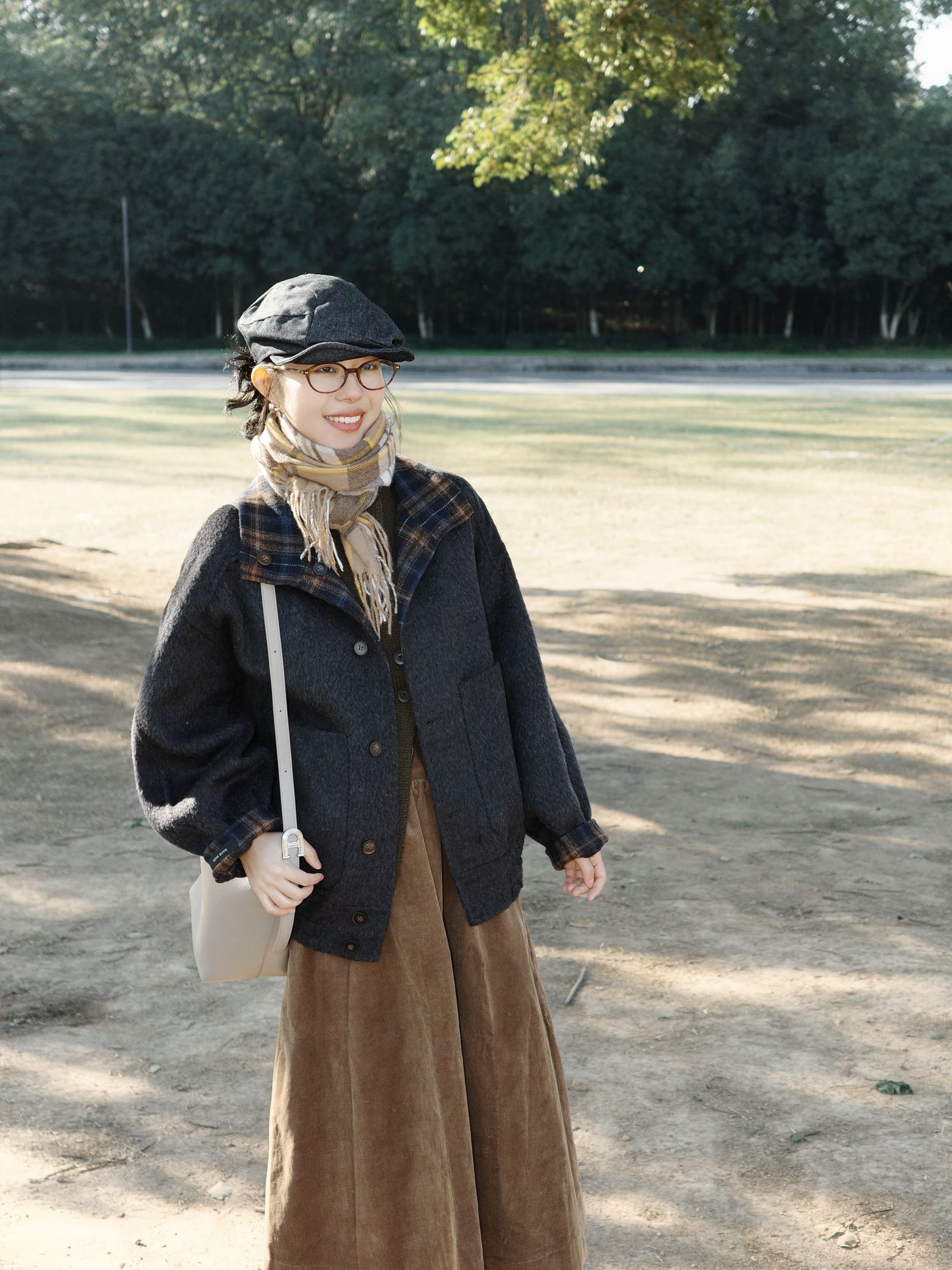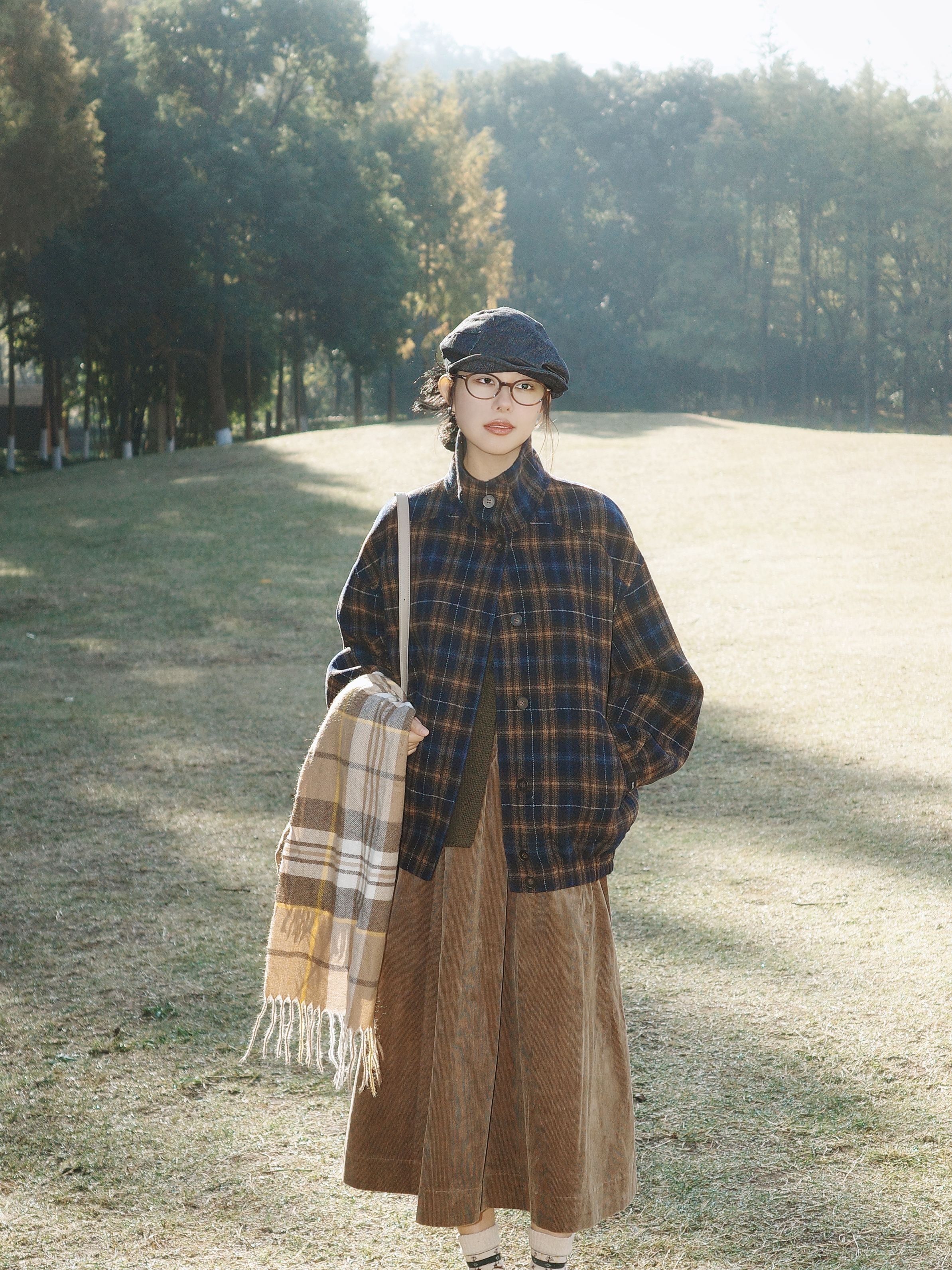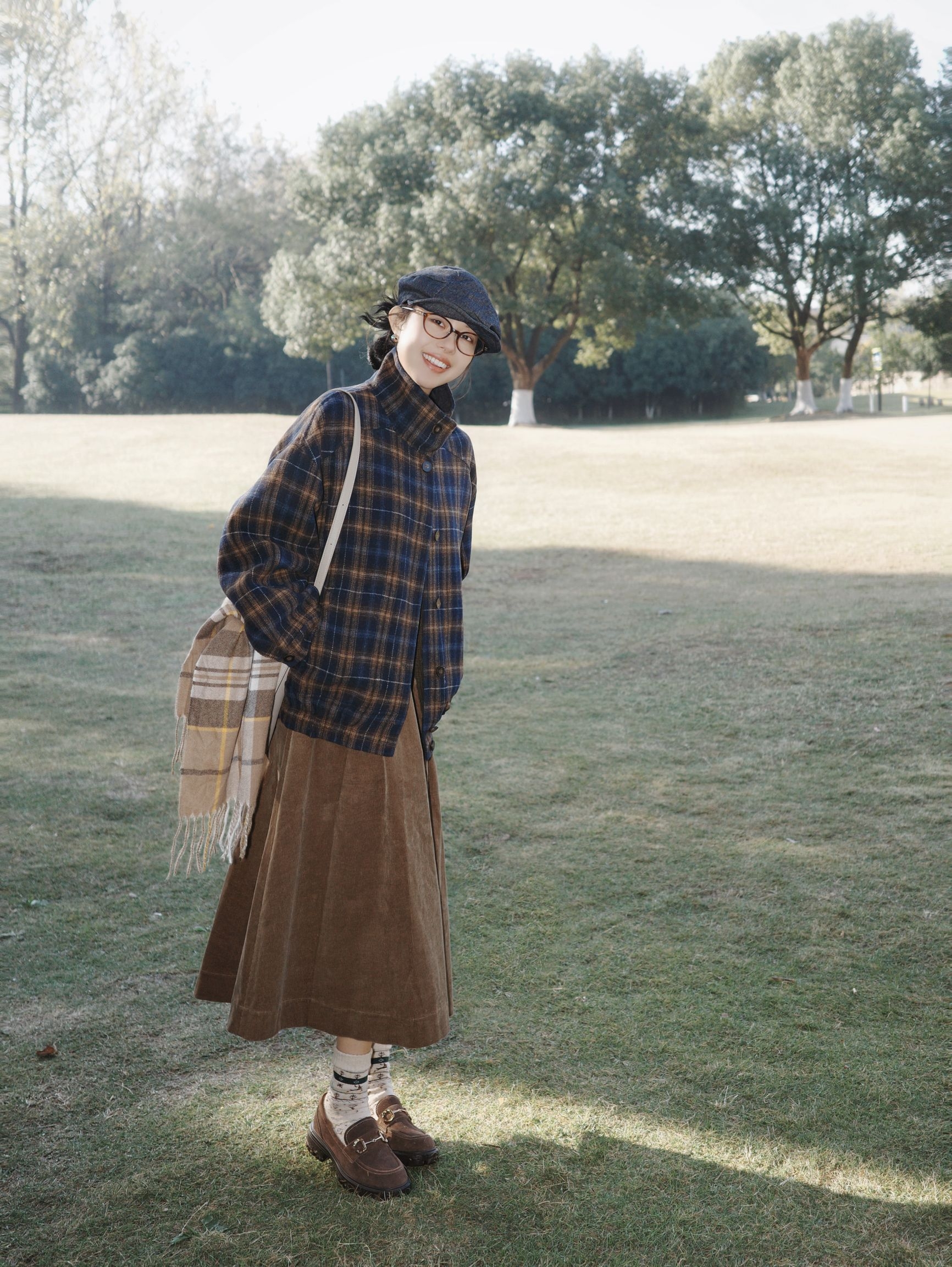 初冬在公园晒太阳的穿搭,被这件双面穿格纹外套给圈粉了~ 这件格纹双面穿外套简直是日系复古的本命款,一面是蓝棕交织的深格纹,低调又有复古味,翻到另一面穿还能解锁不同的搭配思路,软乎乎的面料摸起来超舒服,宽松的版型穿在身上完全没有紧绷感,初冬穿既能挡点小风,又不会显得臃肿。 下身搭了条焦糖色灯芯绒半裙,软糯的灯芯绒材质和初冬适配度拉满,裙摆的弧度松松的,走起来慢悠悠的特别自在。格纹围巾随意搭在包带上,...