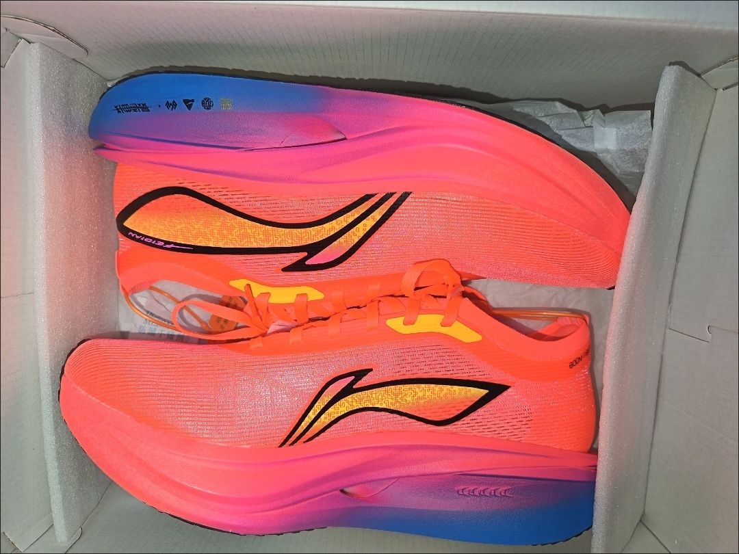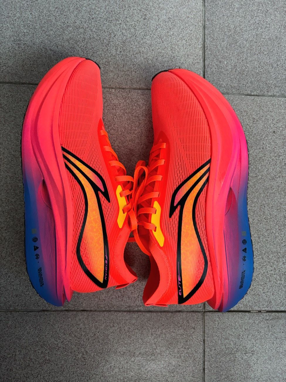 试跑3公里来唠唠飞电5 ELITE,脚感是真的弹,碳板推进感很明显,就是新鞋上脚前掌有点压脚,穿两次应该能撑开。 鞋面的渐变配色实物比图片还好看,拍了鞋底沾的跑道红胶,实打实的上脚体验~配速快的时候推进力超顶,日常训练穿也不觉得累赘,就是鞋楦偏窄,宽脚建议选大半码。