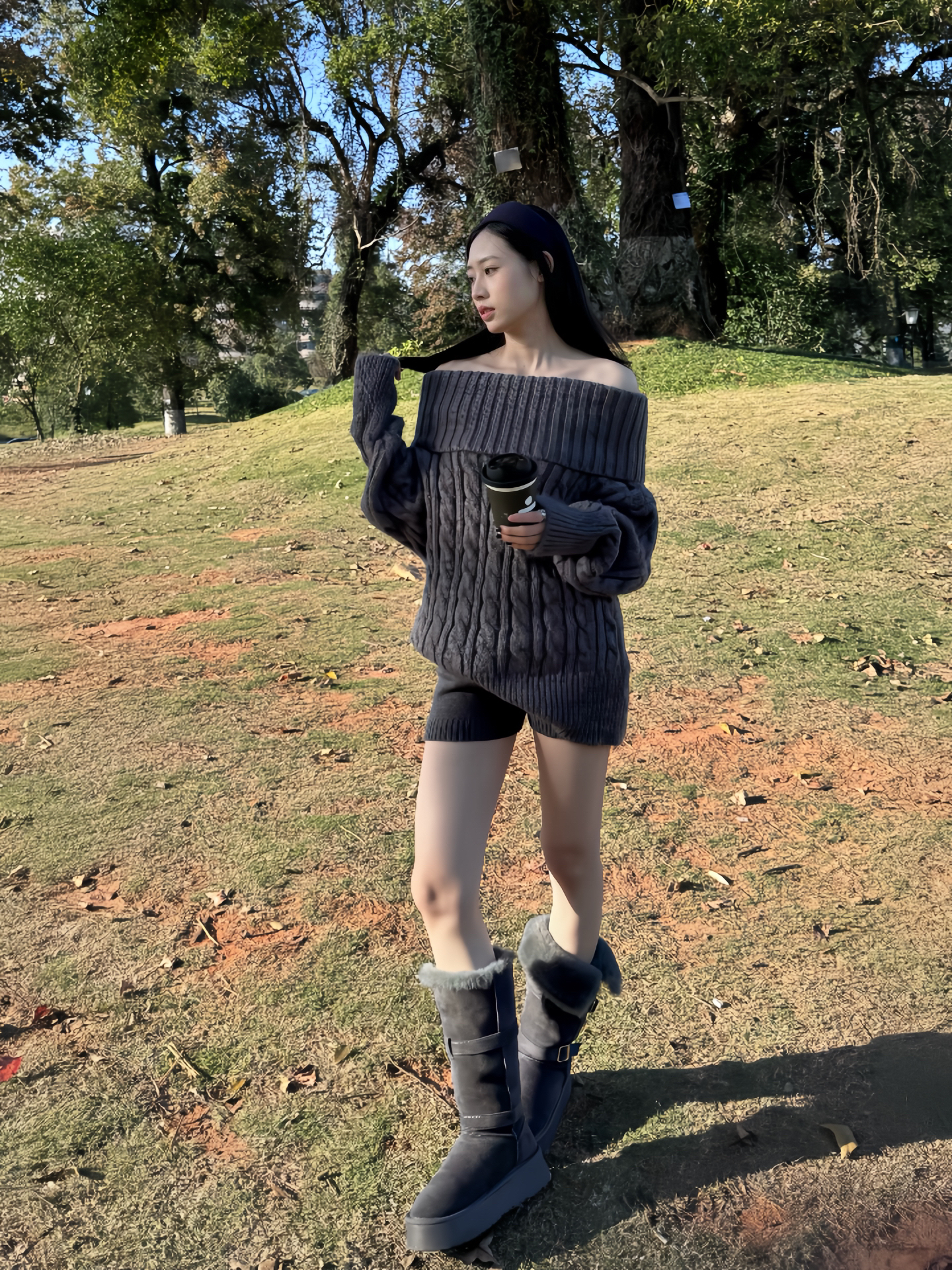 深灰绞花毛衣松松垮垮裹着肩,露肤边刚好戳中秋日的柔;同色短裤搭毛绒靴,暖得利落。往草坡一站,风裹着树影落满身,连拿杯子的姿势都透着随性,是“踩落叶都像在逛画报”的穿法~