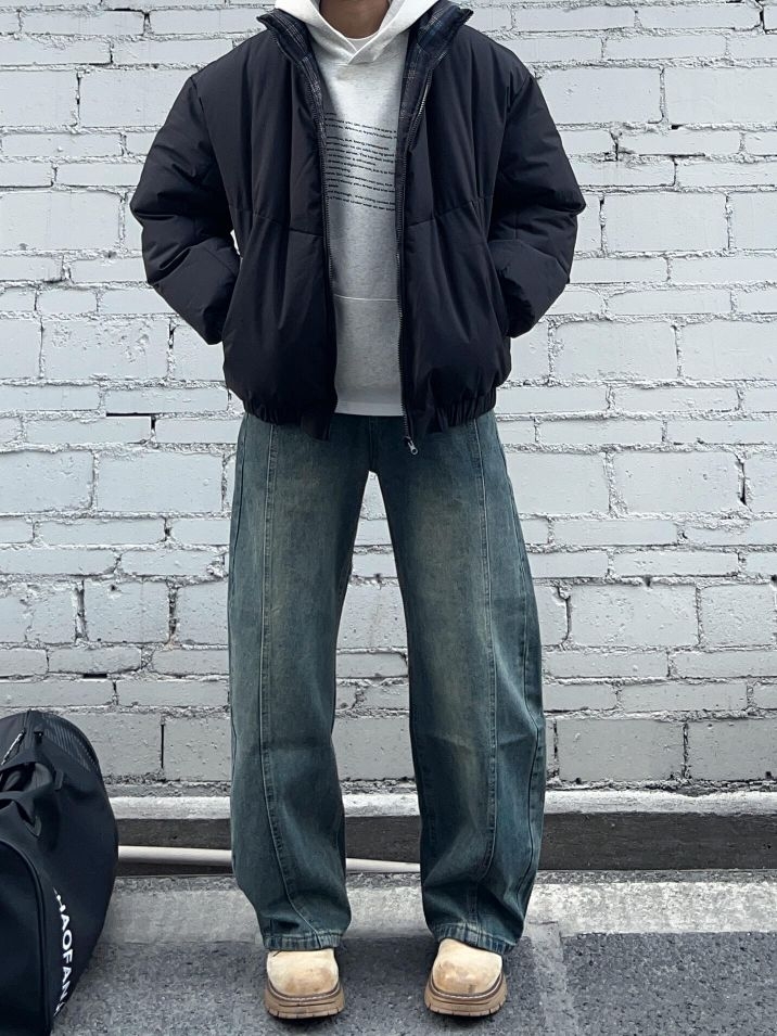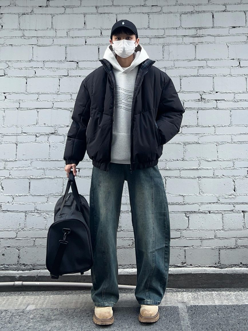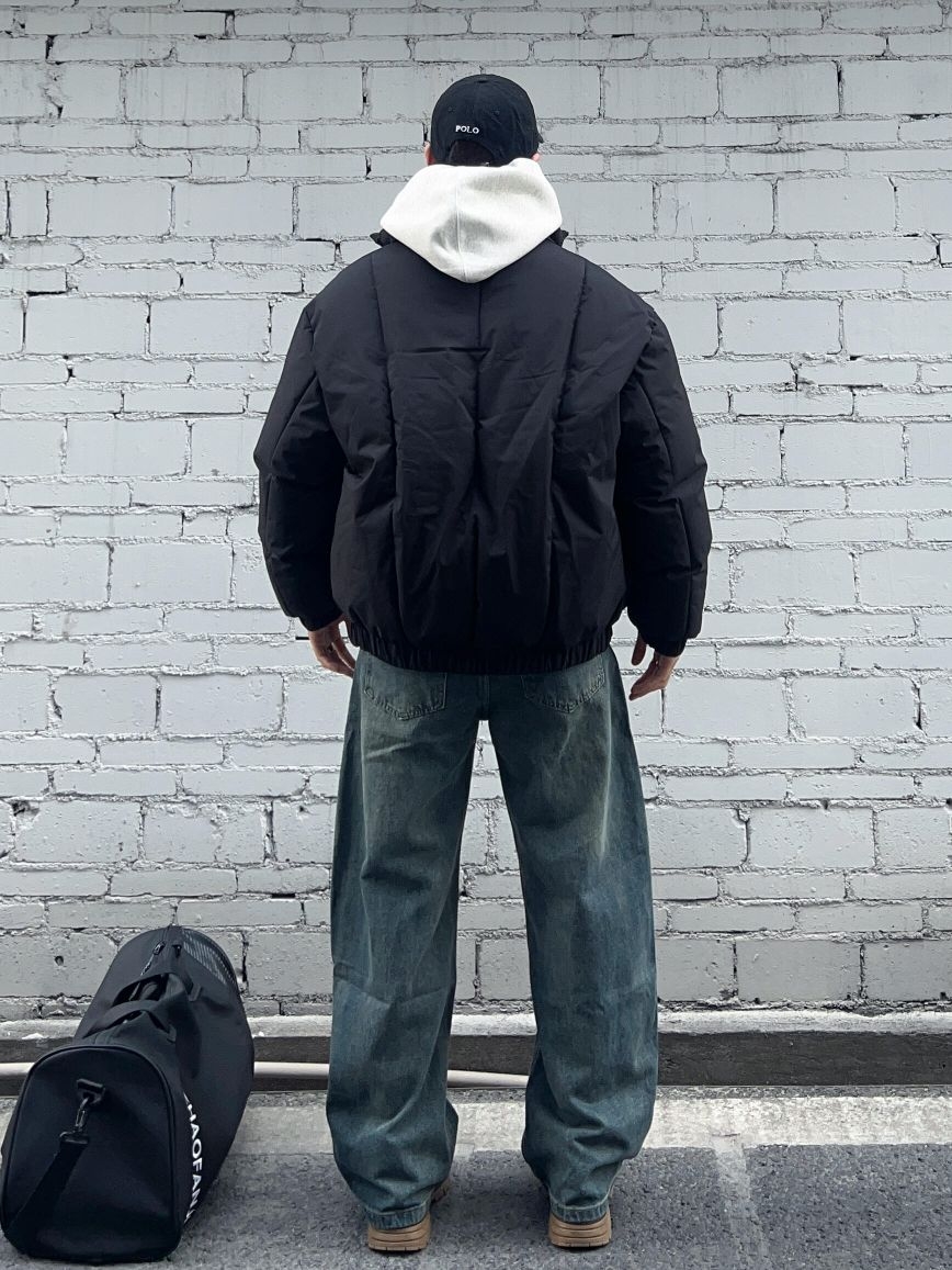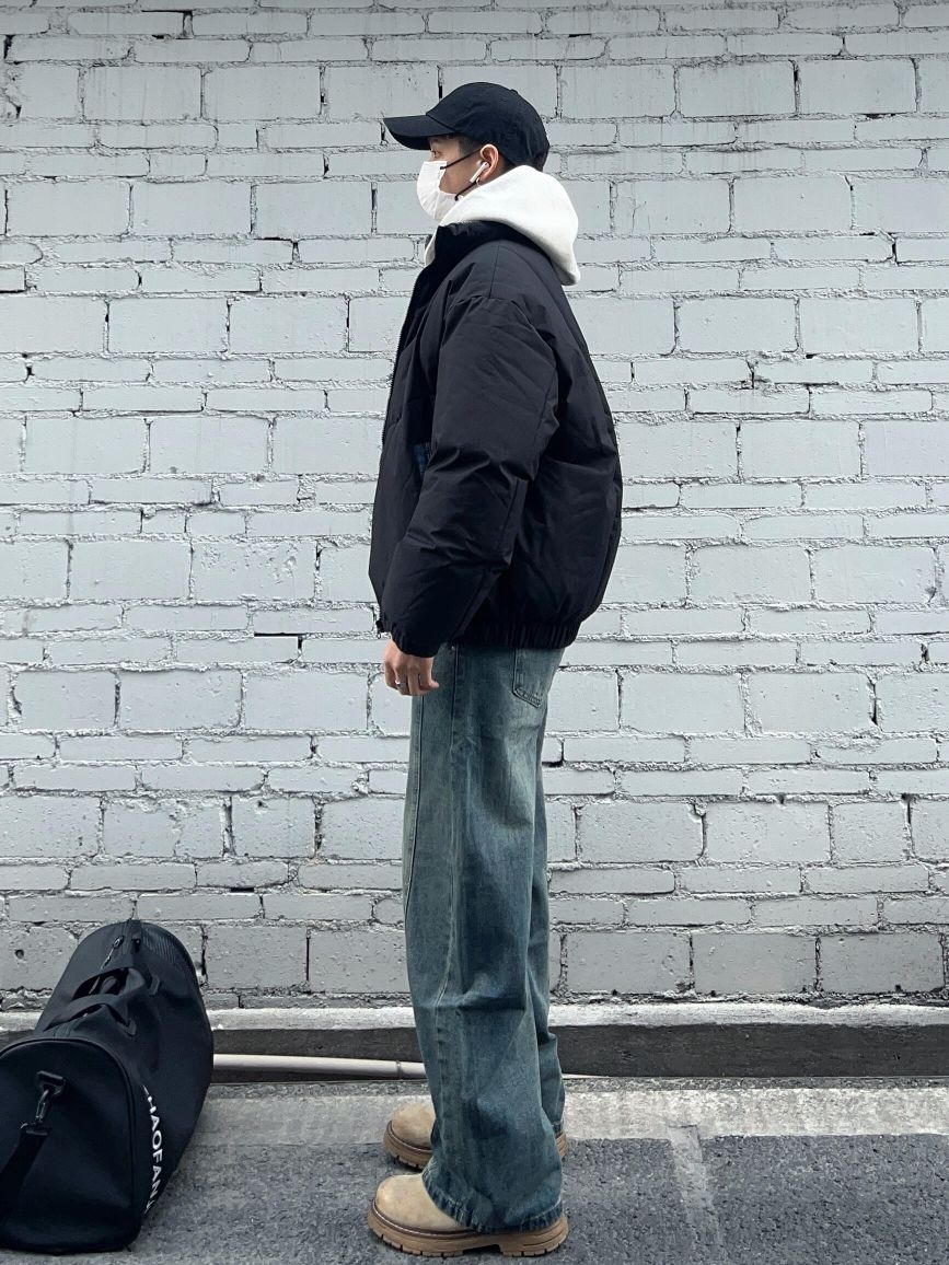 秋冬立领棉服卫衣叠穿||黑色立领棉服+怀旧蓝弯刀牛仔裤 保暖又通勤帅气的一套!