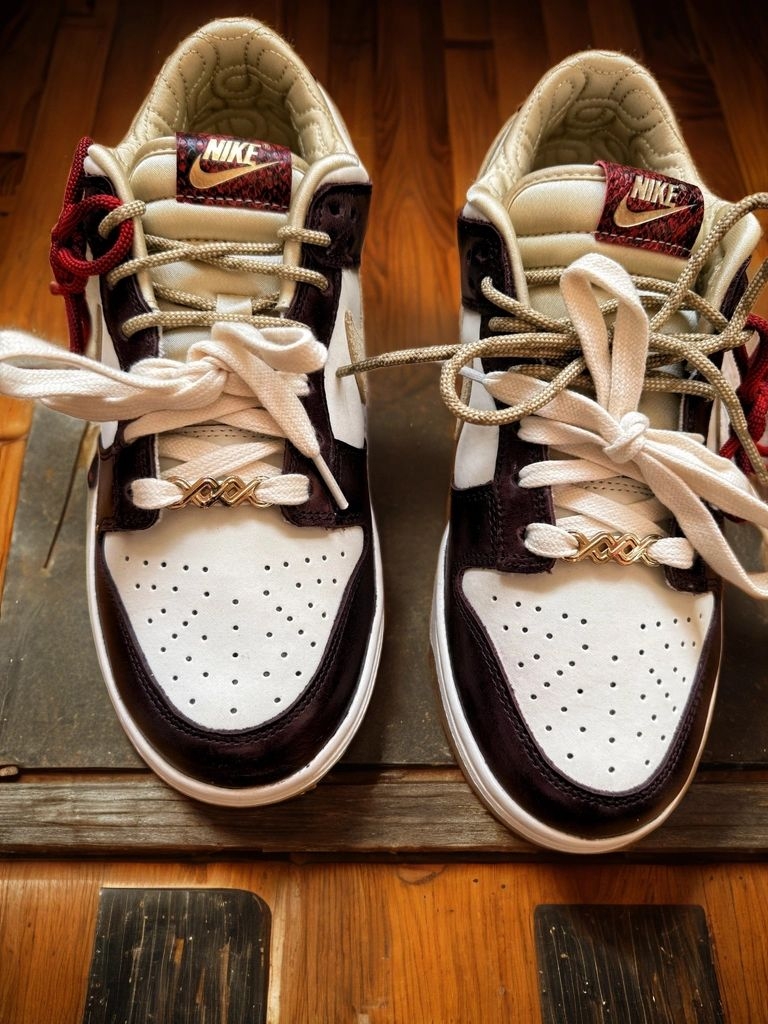 白、金、红的主色调,喜庆又高级,满满的中国风。最重要的细节在于 ‘蛇年’主题 的融入,比如鞋身上的蛇鳞纹理压纹、特殊的金属铭牌等,处处都是小心思,穿出去懂的人一眼就知道是限量款,排面十足。