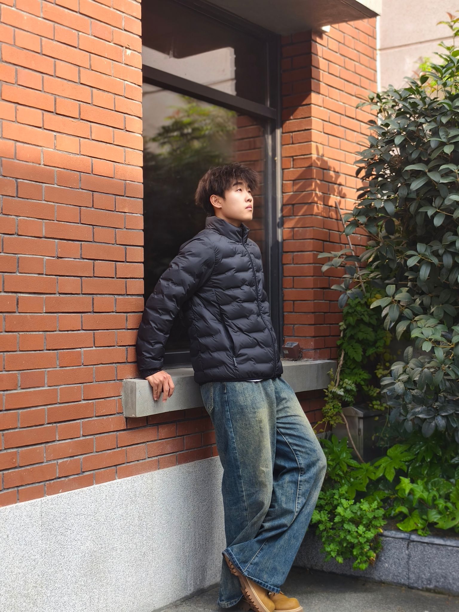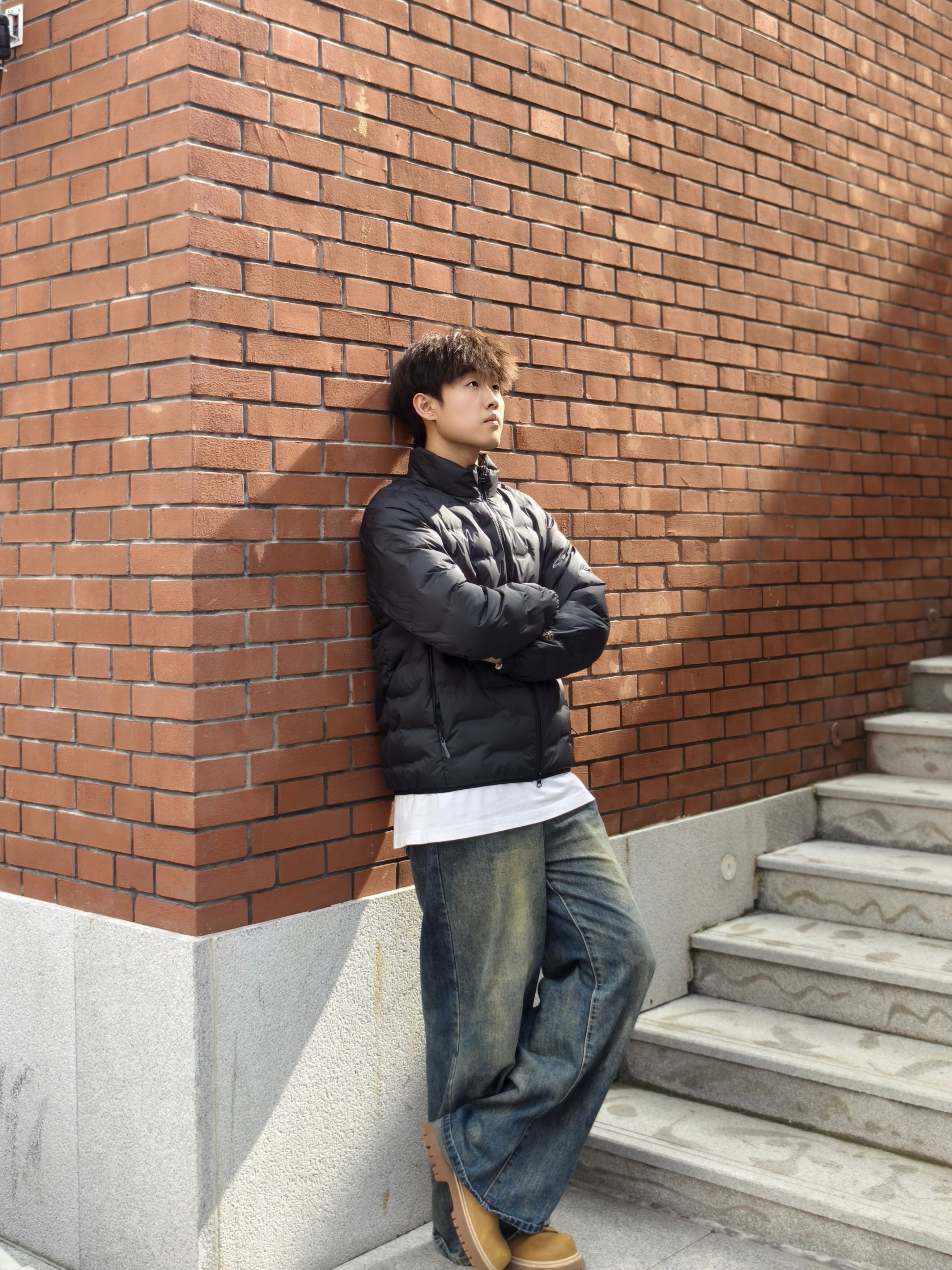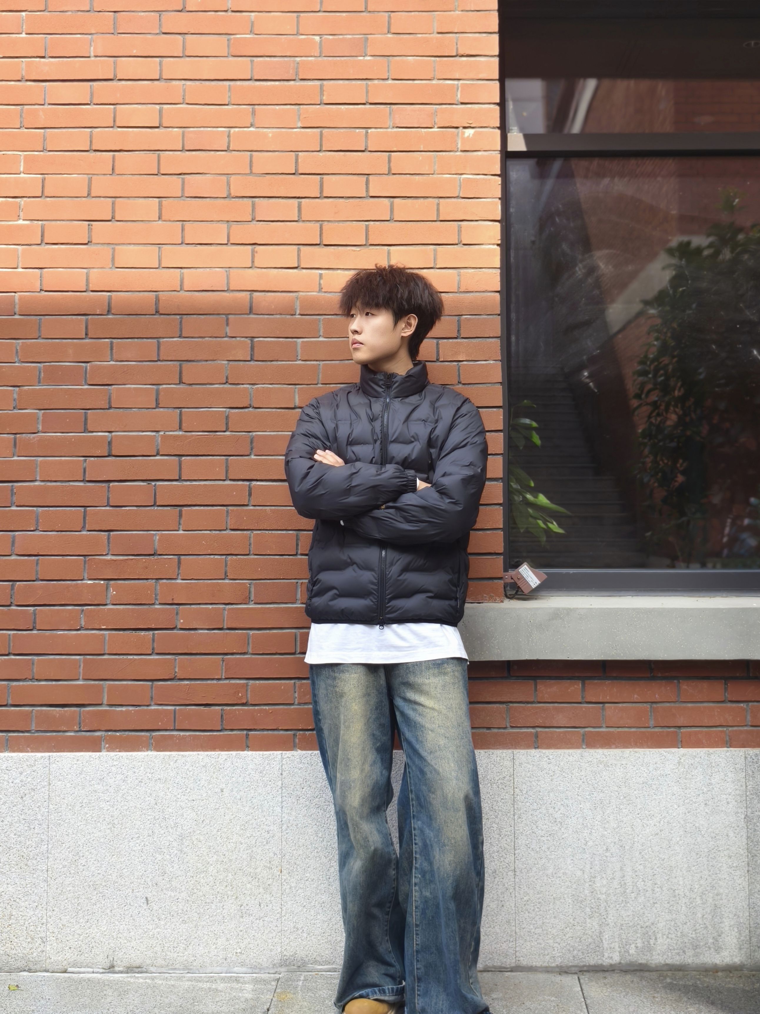 黑色轻薄羽绒服叠穿白T,下摆露边瞬间打破沉闷✨ 搭配做旧阔腿牛仔裤和大黄靴,冬日穿搭也能有街头松弛感 随便往红砖墙旁一站,氛围感直接拉满~