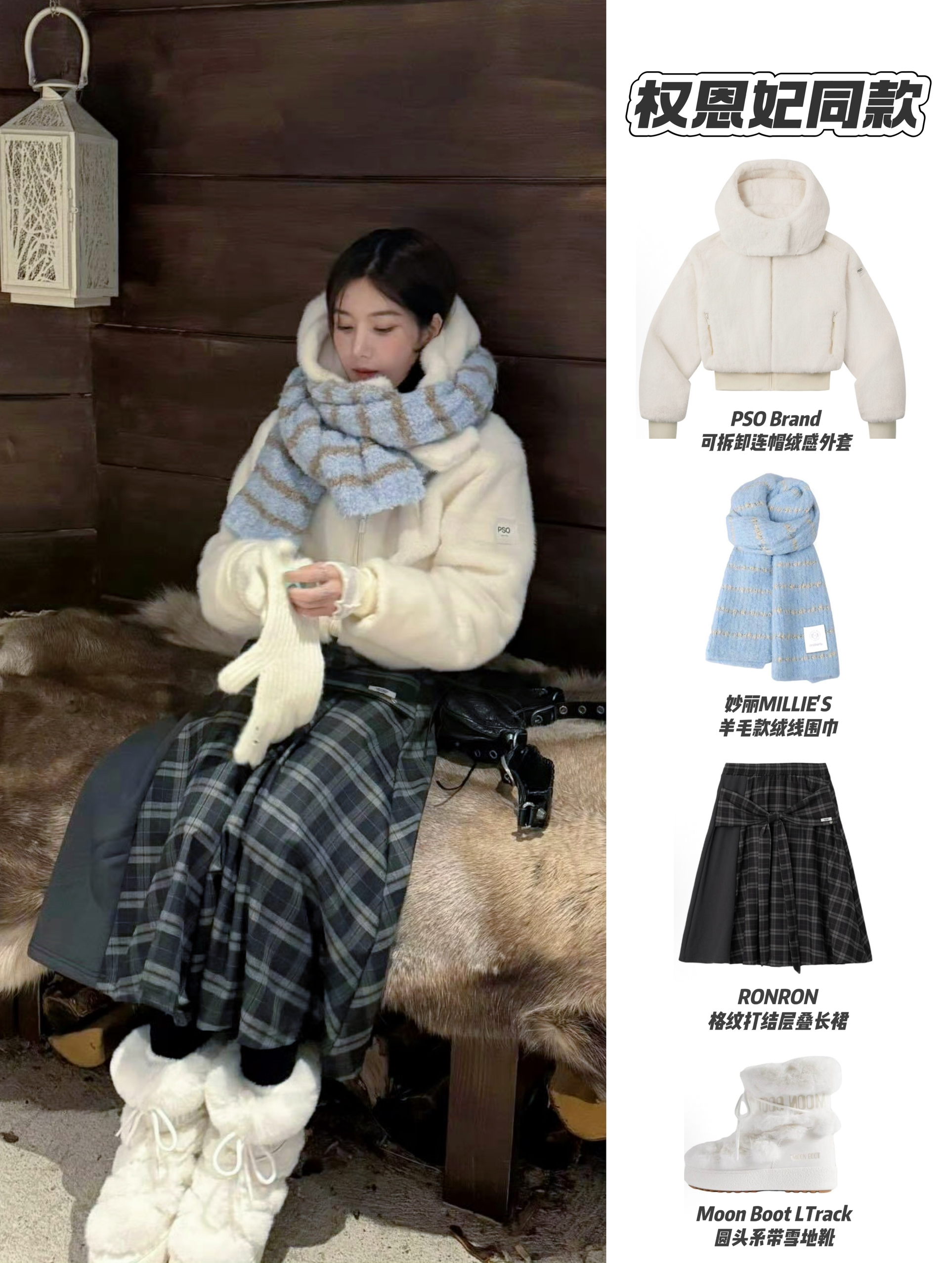 权恩妃这套雪场穿搭❄️ 把冬日温暖和松弛感拿捏得很准~ 蓬松白外套配格纹长裙 清新又有层次 浅蓝围巾添了温柔 最点睛的是Moon Boot雪地靴👢 厚底蓬松的设计和外套毛感呼应 既让整体更和谐 又把冬日的慵懒感拉满 还完美适配雪地场景 保暖又时髦