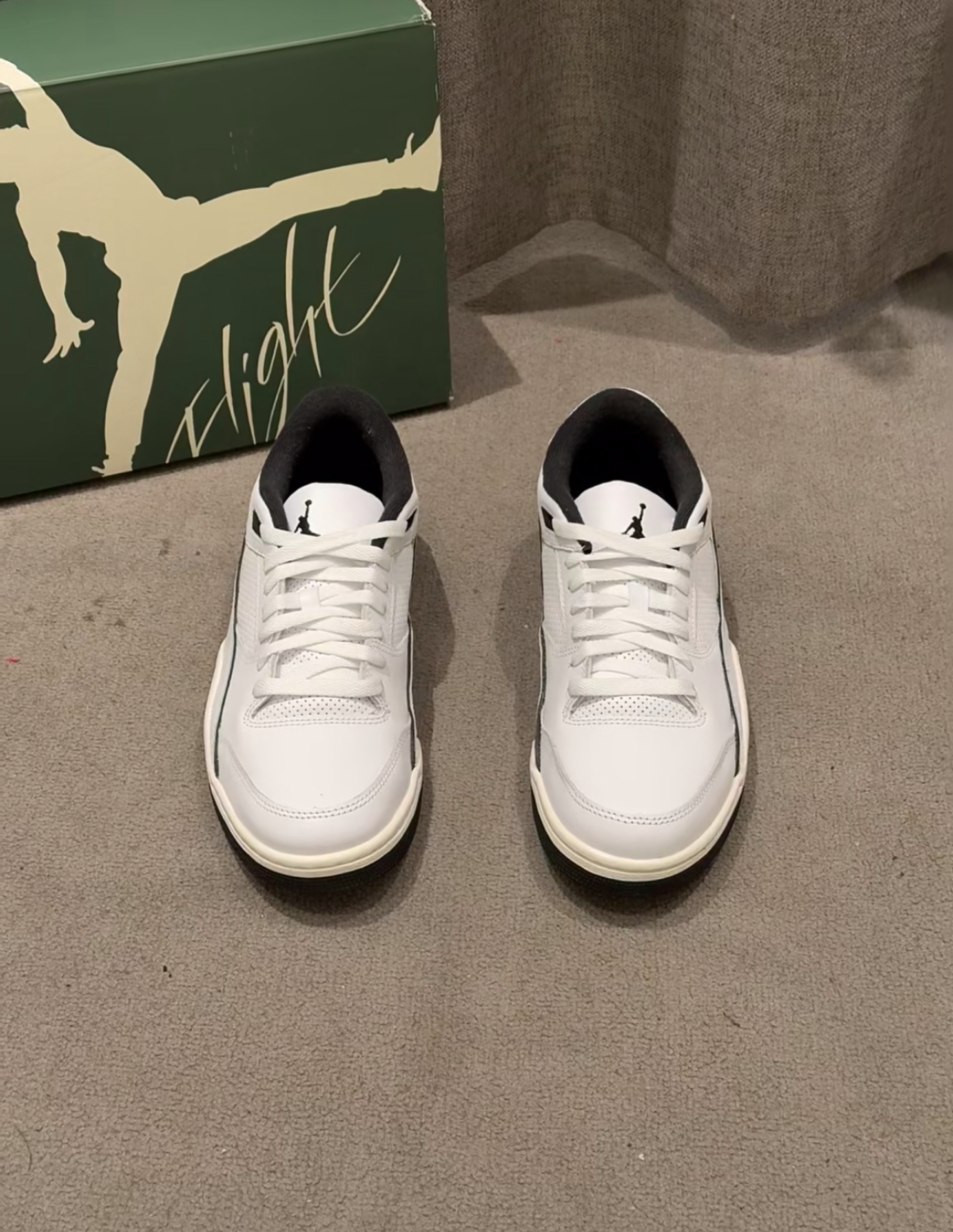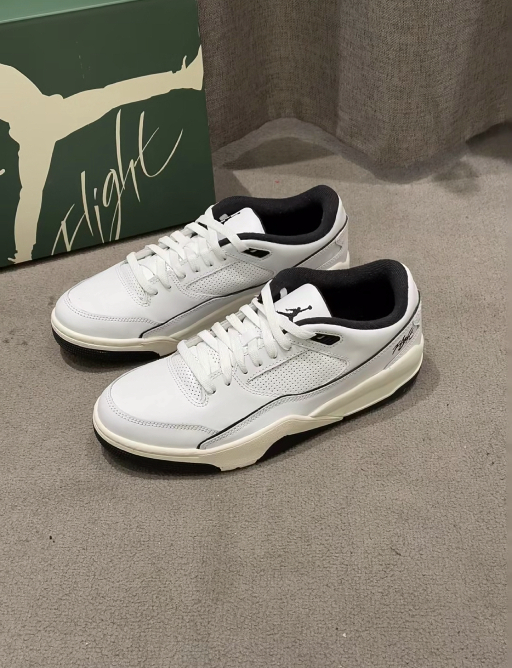一、拆箱初体验:复古质感拉满 打开绿色Flight专属鞋盒,白黑米配色的Jordan Flight Court福来鞋立刻抓人眼球。鞋身采用白色打孔皮革打造,搭配黑色内衬与米白色做旧中底,低帮圆头的经典造型自带复古氛围,摆在鞋盒旁的视觉效果干净又高级。 上手触摸能感受到皮革鞋面的扎实质感,透气孔分布均匀,兼顾支撑性与透气性;鞋舌飞人标、鞋侧飞人签名logo等细节做工精致,中底走线工整无溢胶,外底...