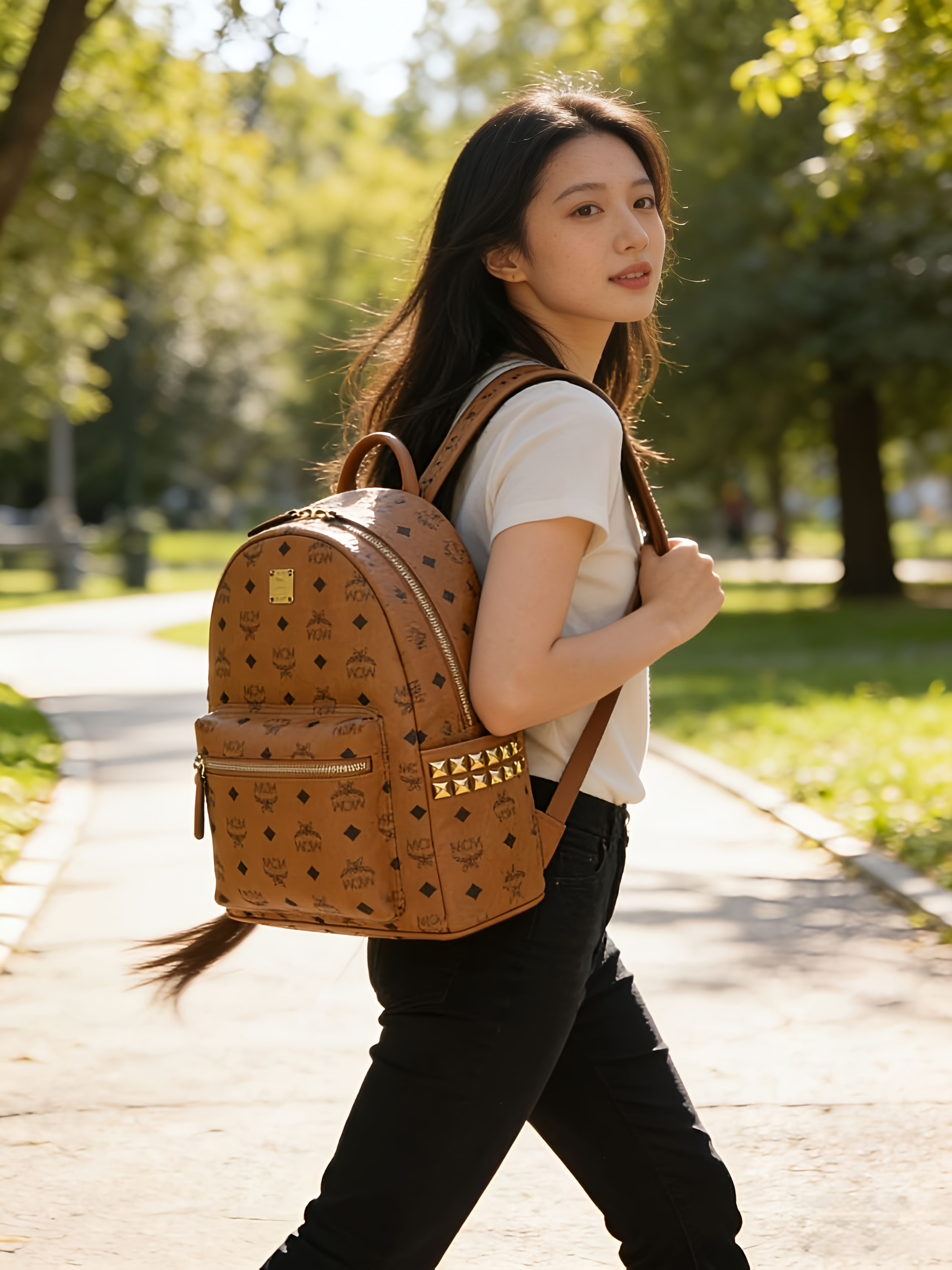 谁懂啊,出门聚会想背得轻便又好看,这款MCM小号双肩包直接戳中我!棕色老花超百搭,铆钉细节又酷又甜,容量装得下手机口红,背久了肩膀也不勒,通勤约会拎上就走,太香了~而且还分大小号,对姐妹们身高也很友好!