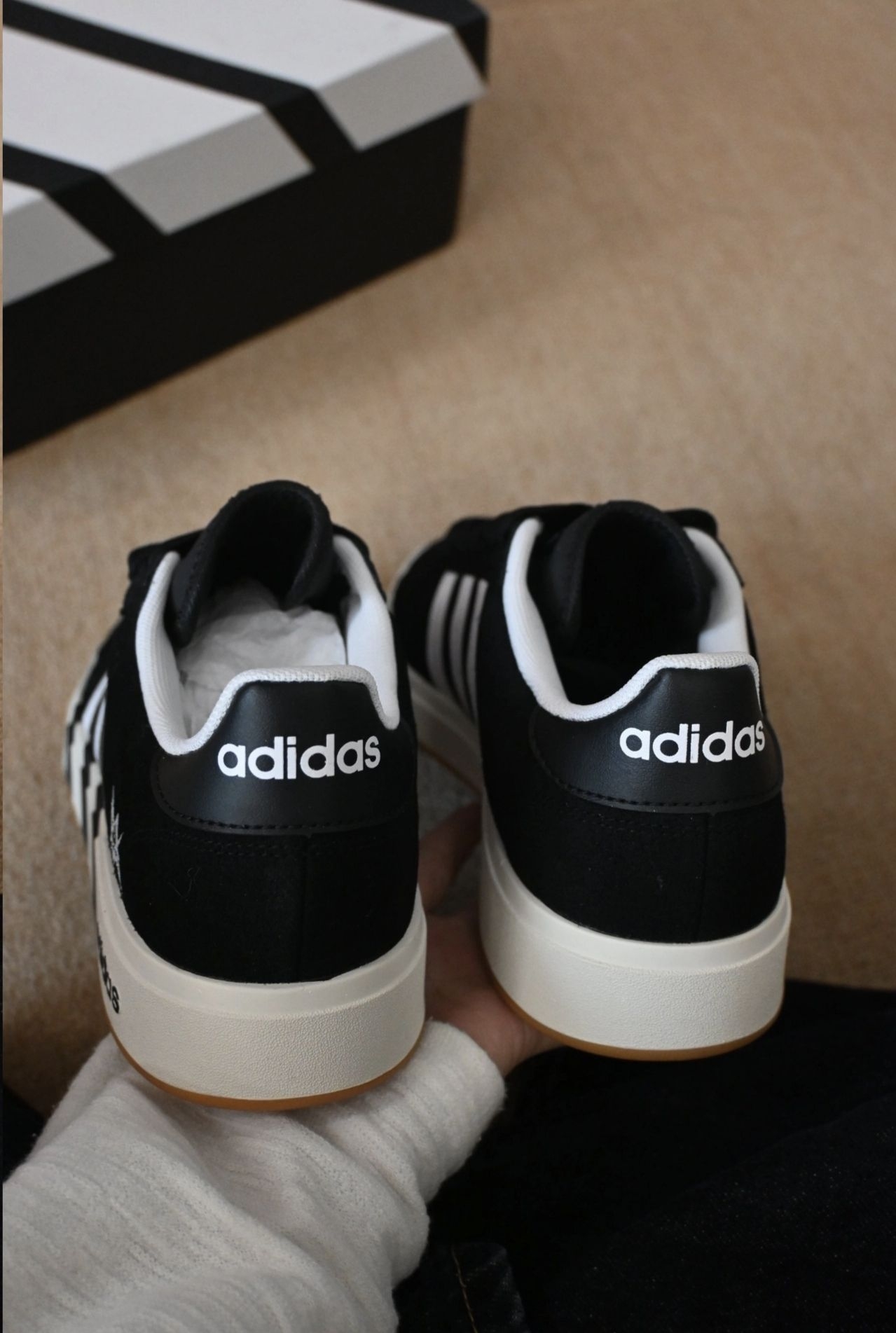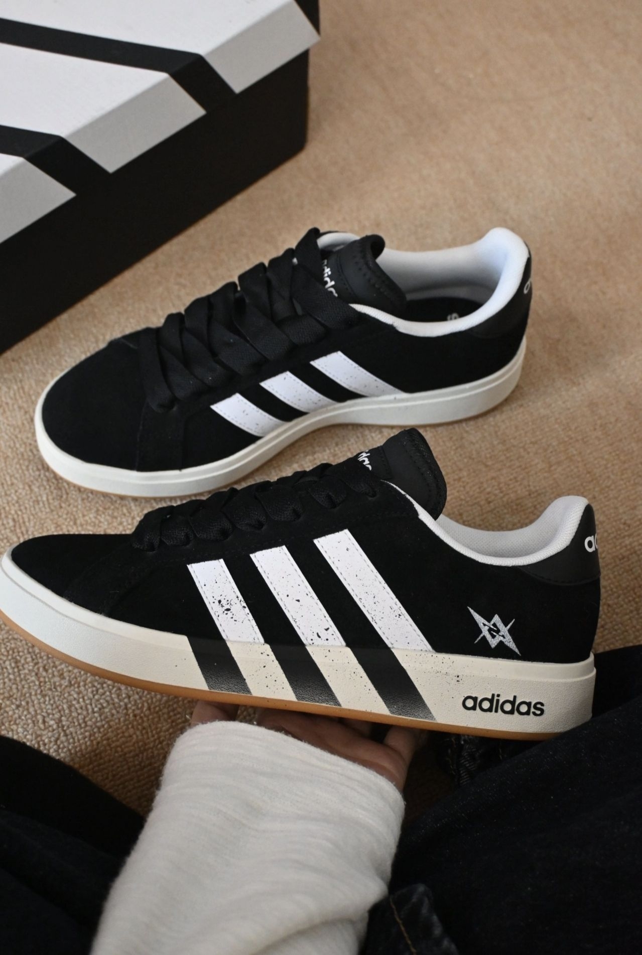 刷到这双adidas黑魂板鞋直接冲了,实物比图片还惊艳!麂皮鞋面摸起来细腻又有质感,鞋侧的泼墨三条杠+星星小标,小众设计感拉满,完全不怕撞款。上脚后第一感受是鞋楦很合脚,不挤脚也不磨后跟,鞋底的回弹感超舒服,日常通勤走一天路都没压力。橡胶大底的防滑效果也不错,搭配牛仔裤、工装裤都超有街头范儿。