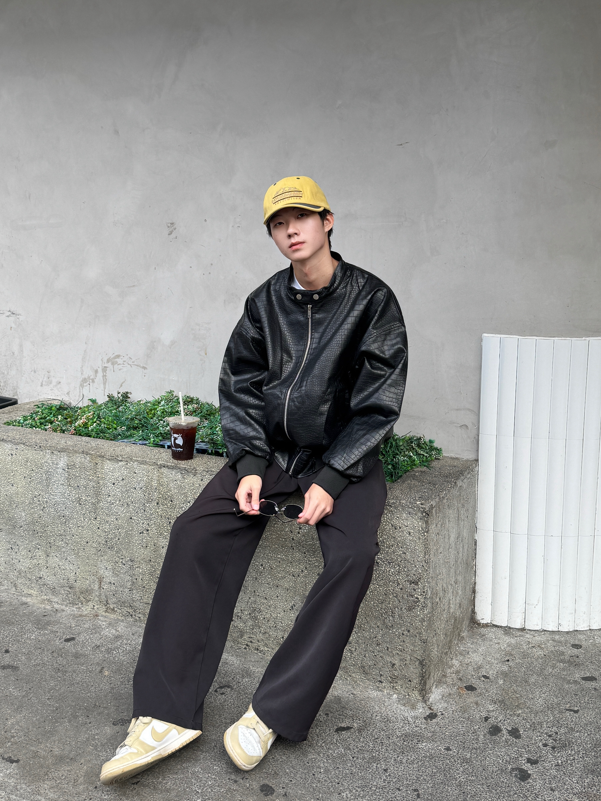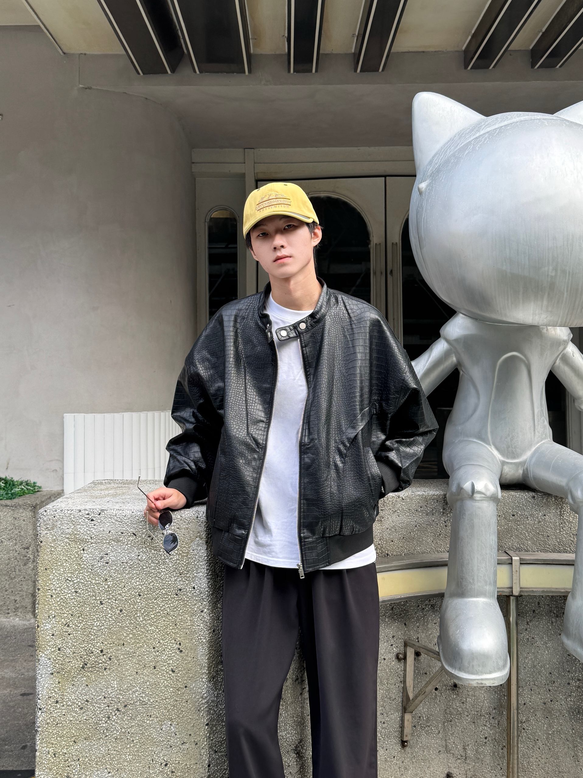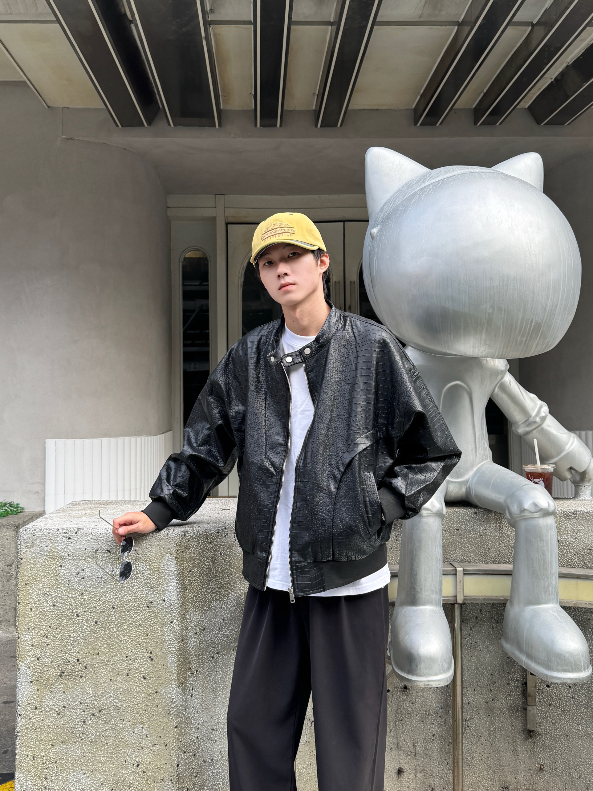 今天这身回头率拉满 主角是这件超吸睛的黑色美式夹克 解构设计加上蟒纹与色块拼接 细节感爆炸💥 内搭万能白T平衡视觉 配上慵懒的黑色阔腿裤 走起路来带风~ 亮眼的黄色帽子瞬间点亮全身 整体又酷又有层次🧢