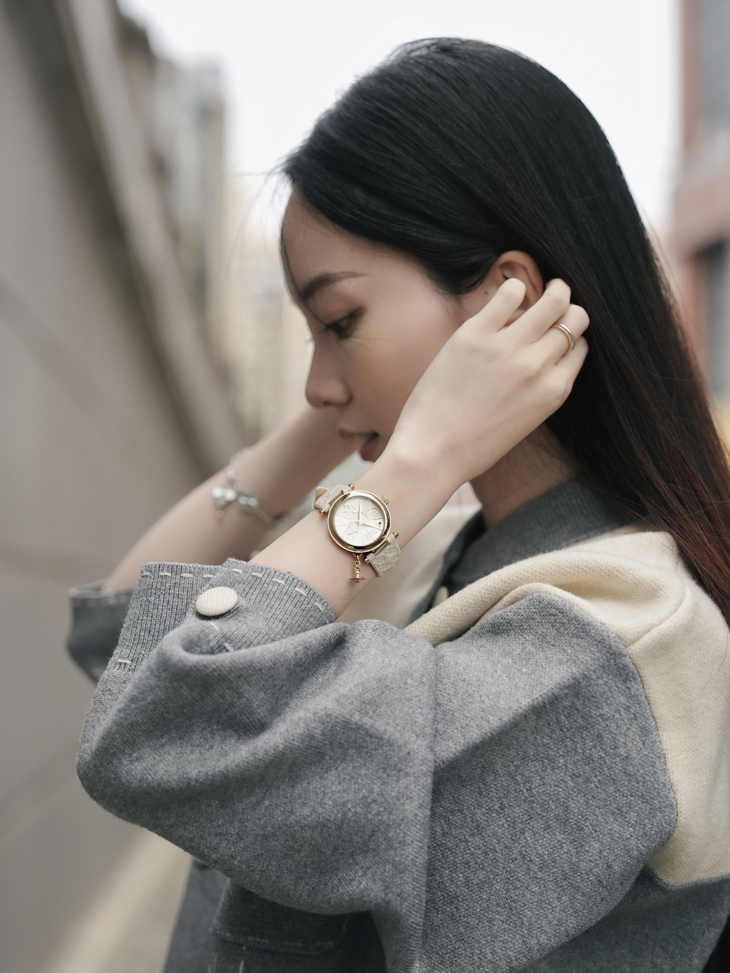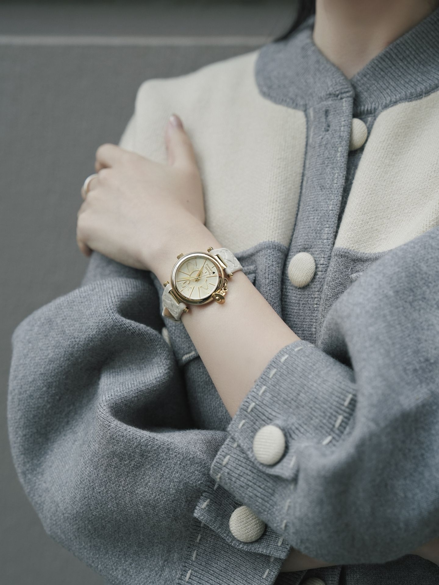 今天出门风有点软 穿了件灰米拼色的针织外套 懒懒散散的优雅刚好踩在秋的节奏里 今天戴了这块西太后手表 金色表盘衬得贵气又温柔 秒针尾端的小红心和镂空土星标藏着俏皮 VivienneWestwood标志性吊坠抬手间 晃得腕间多了点灵动~