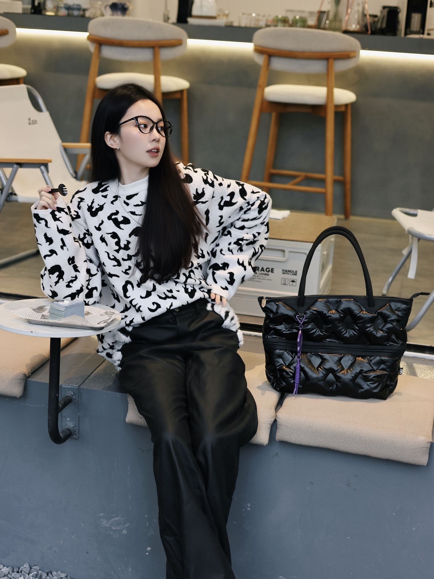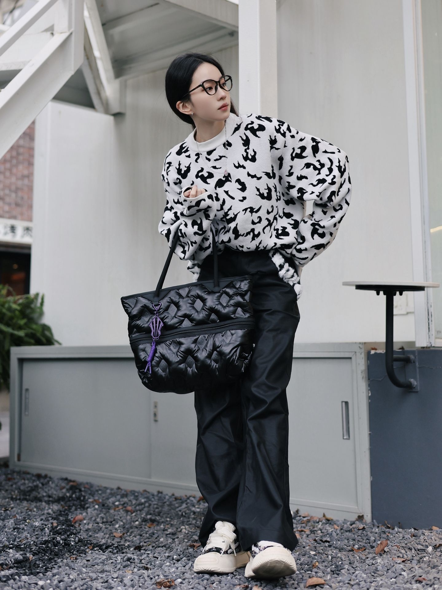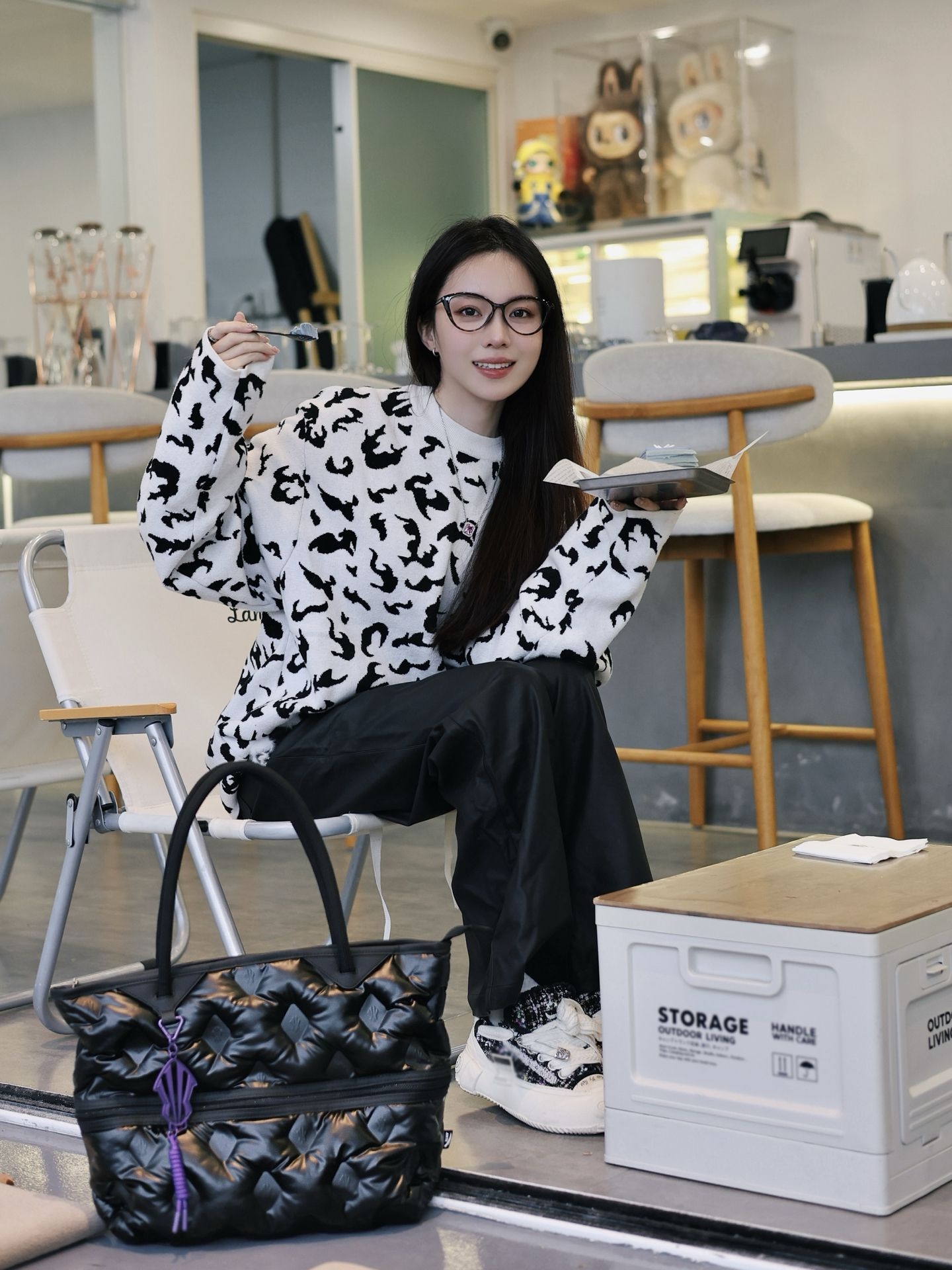 今天是裹得暖乎乎的阴天 拉着朋友钻了家新开的咖啡店 吃到了chao浓郁的海盐芝士蛋糕 甜香混着咖啡也太满足辣😌 今天穿得主打一个“舒服到想打滚” 黑白毛衣和帅帅的皮裤 走起来带风🩶🖤 新入手的安踏的冰洲包好轻!!! 摸起来蓬蓬软软 表面的立体菱格纹又有点酷劲儿 据说设计灵感是冰洲石的双折射✨ 拉链拉开能解锁更大空间 整个化妆包可以轻松装进 其实生活里的温暖时刻 就像现在 穿得自在、吃得甜~⛅️