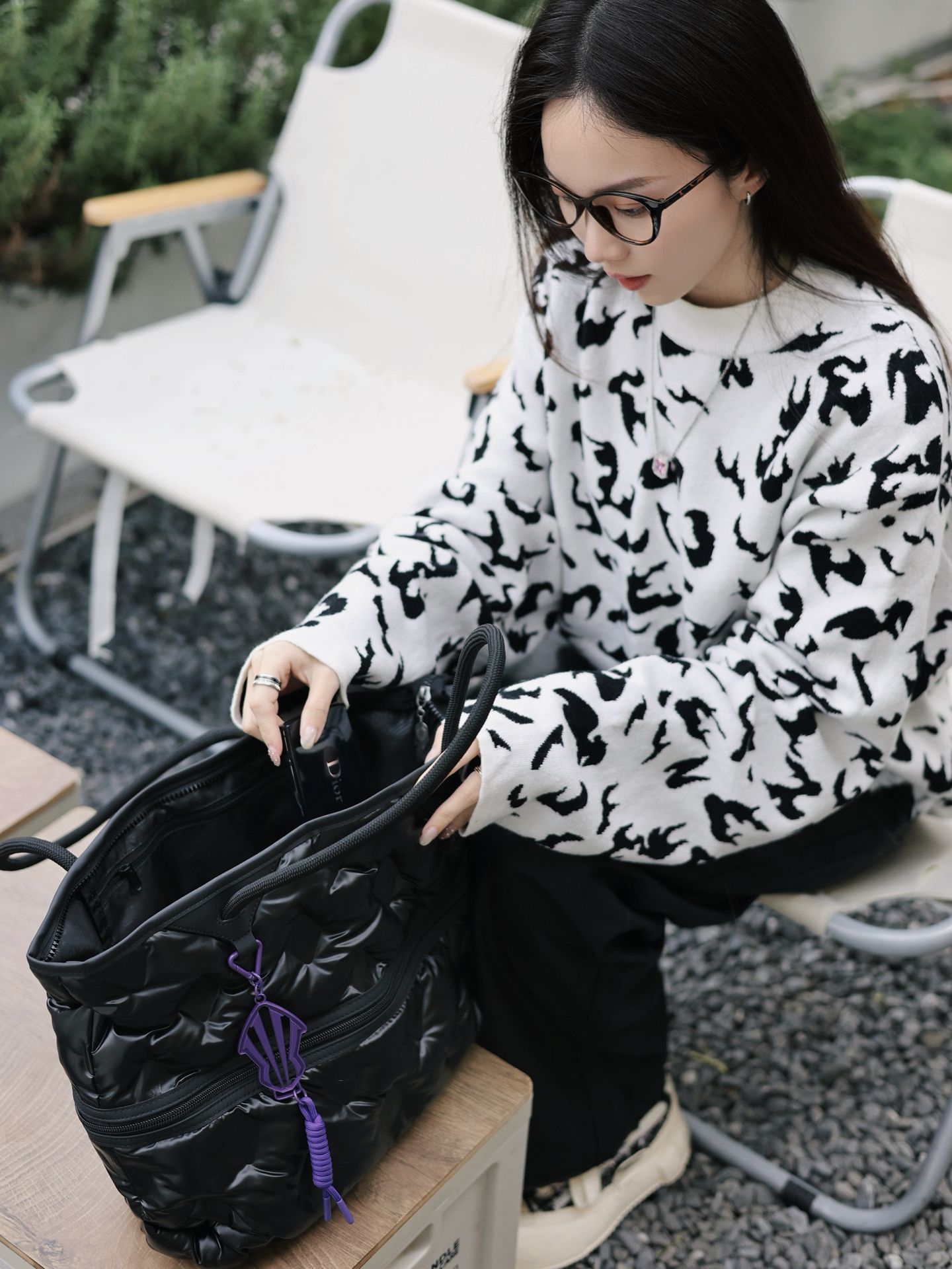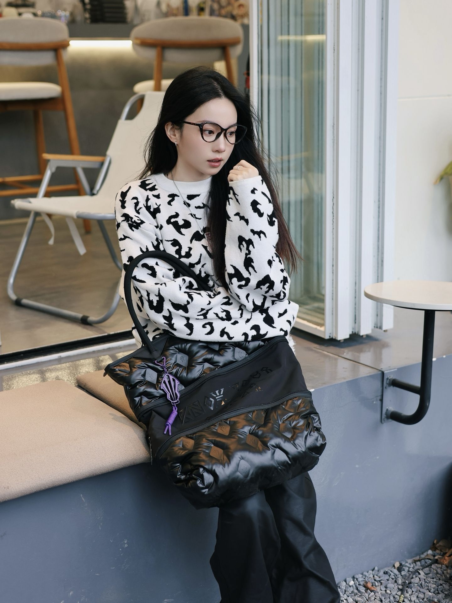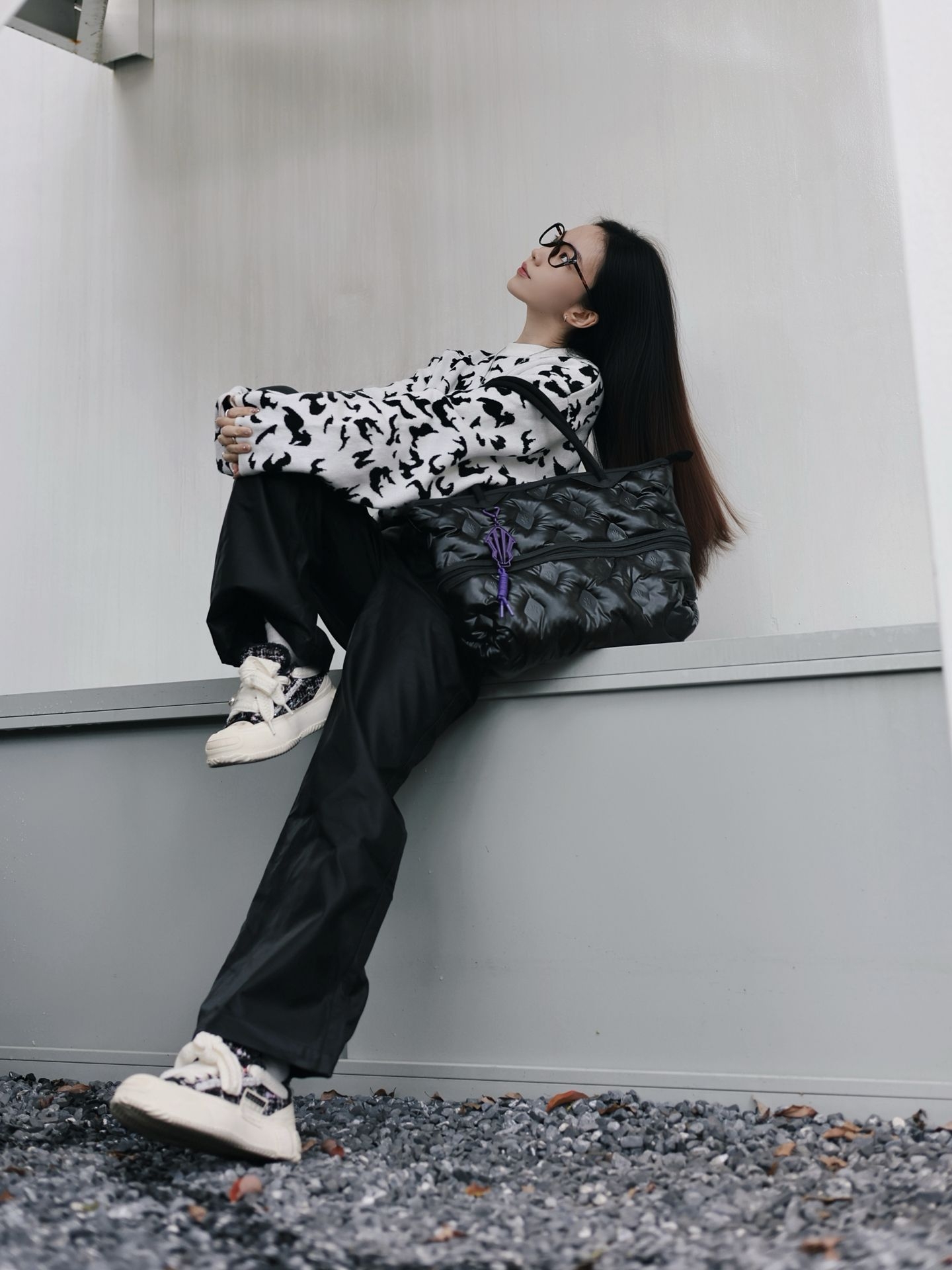 今天是裹得暖乎乎的阴天 拉着朋友钻了家新开的咖啡店 吃到了chao浓郁的海盐芝士蛋糕 甜香混着咖啡也太满足辣😌 今天穿得主打一个“舒服到想打滚” 黑白毛衣和帅帅的皮裤 走起来带风🩶🖤 新入手的安踏的冰洲包好轻!!! 摸起来蓬蓬软软 表面的立体菱格纹又有点酷劲儿 据说设计灵感是冰洲石的双折射✨ 拉链拉开能解锁更大空间 整个化妆包可以轻松装进 其实生活里的温暖时刻 就像现在 穿得自在、吃得甜~⛅️