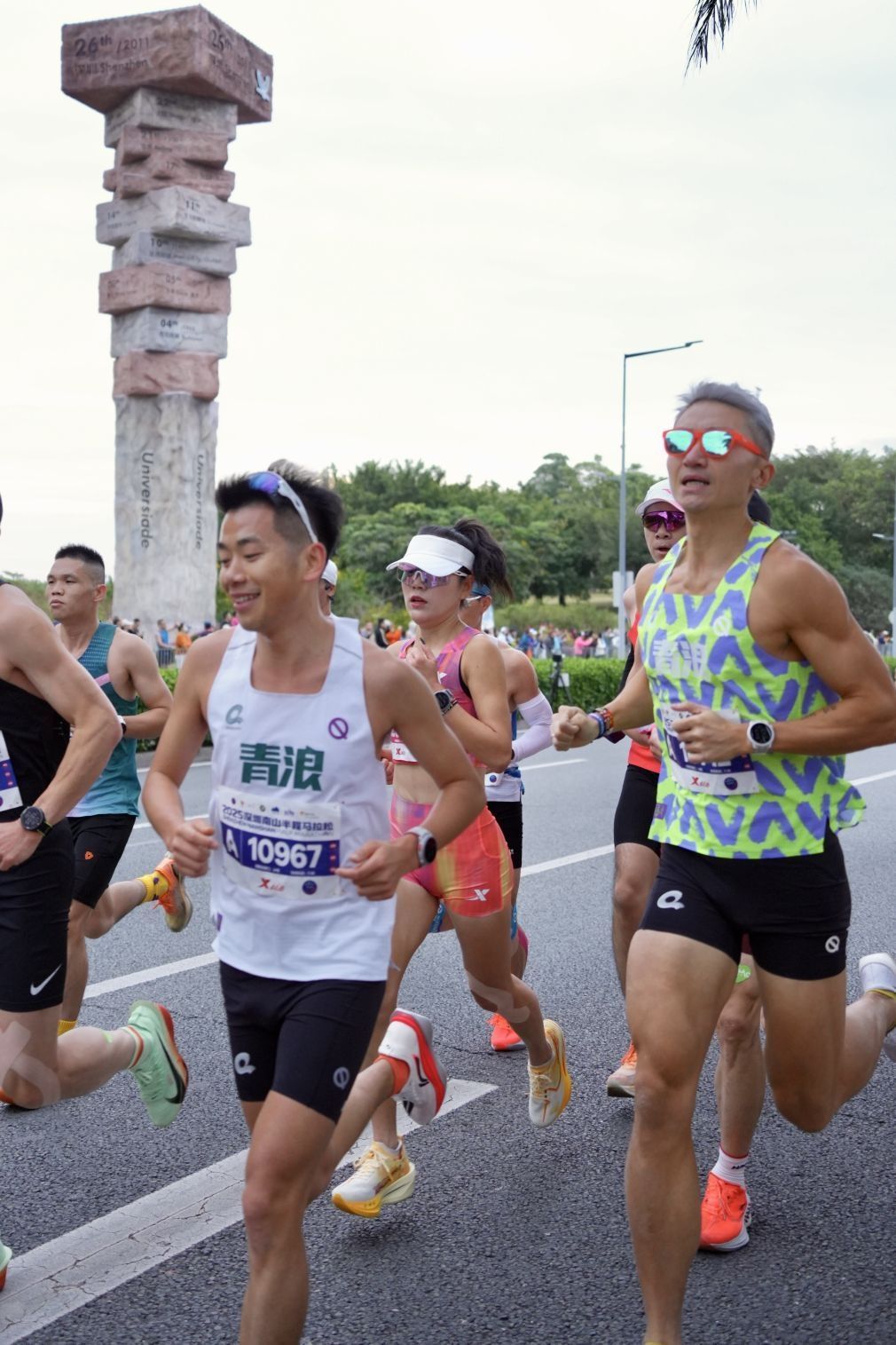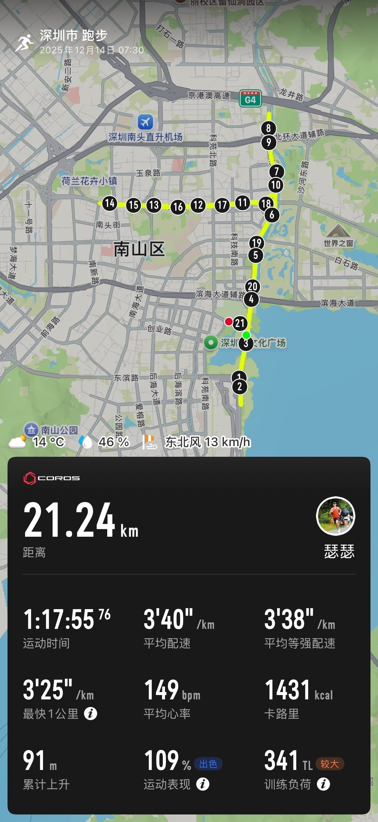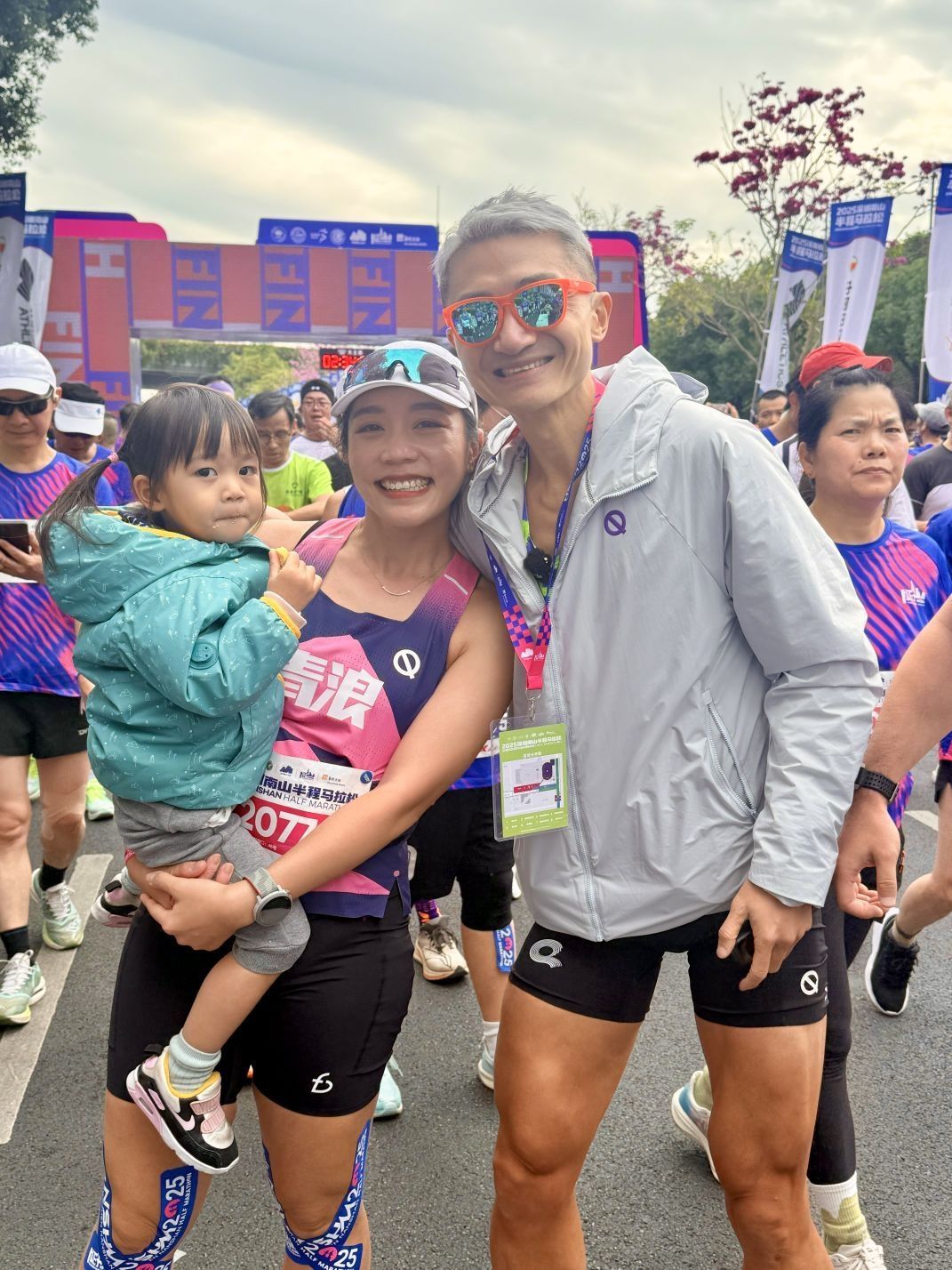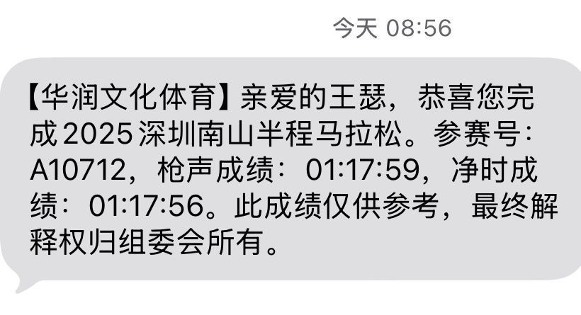 回看照片,从头到尾戴着痛苦面具,真的很拼。 不过冲过终点甚至没来得及查成绩,因为老妈抱着女儿在人群里等候,小明还在我身后奔跑。 把湿透的奖牌挂在女儿脖子上:“走,我们去接妈妈!” 奔向小明的200米,好像比今天最快的21公里速度还快,在终点线线一家人紧紧相拥。 完赛成绩 1:17:56,PB 了整整3分钟。 西瓜拿下国内第四,青浪伙伴们集体闪耀。 南山半马的第 11 年,这条高速赛道见...