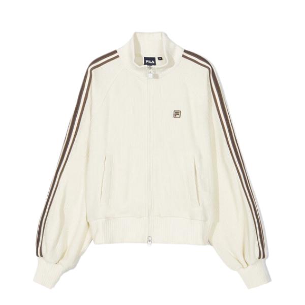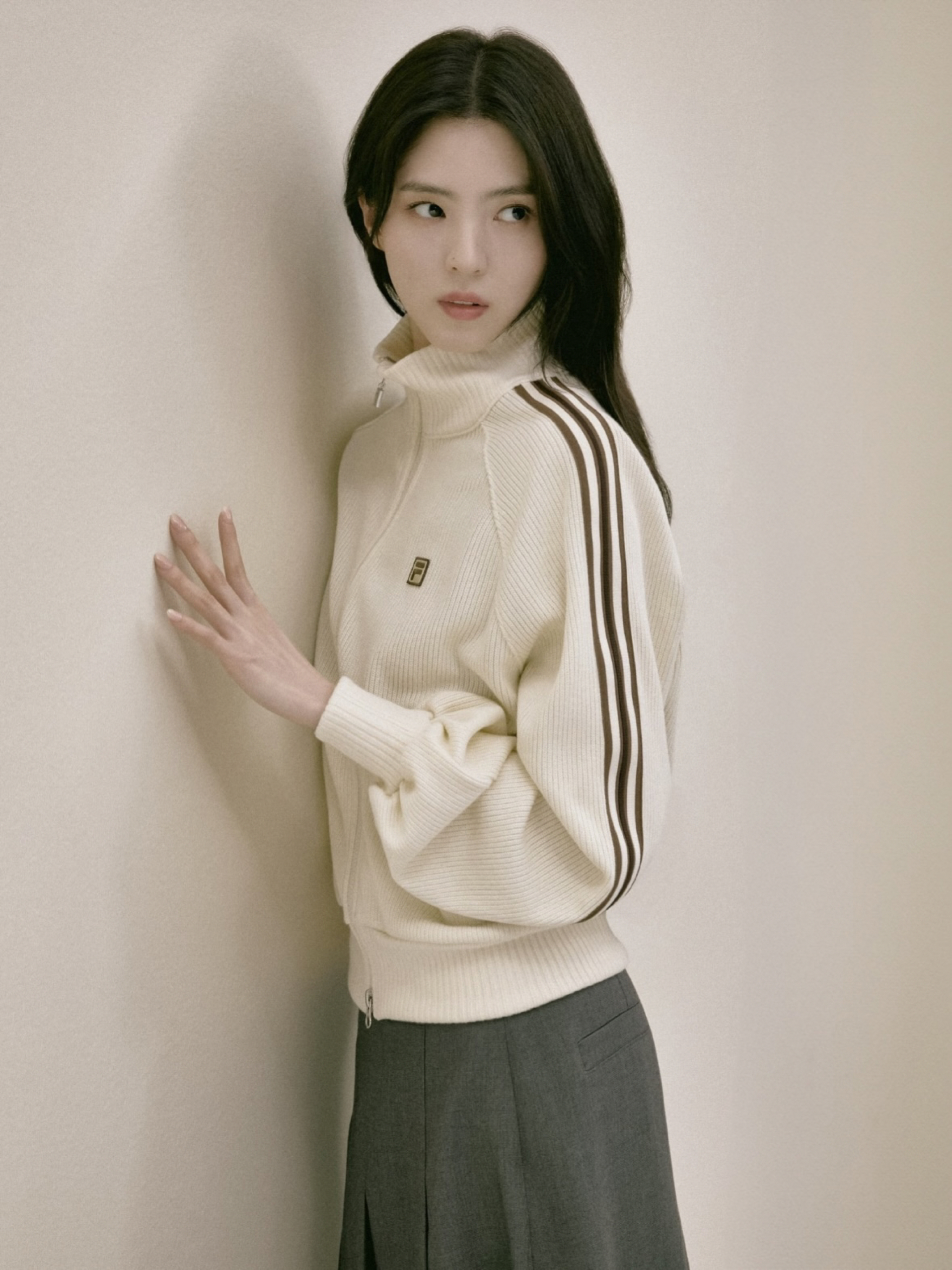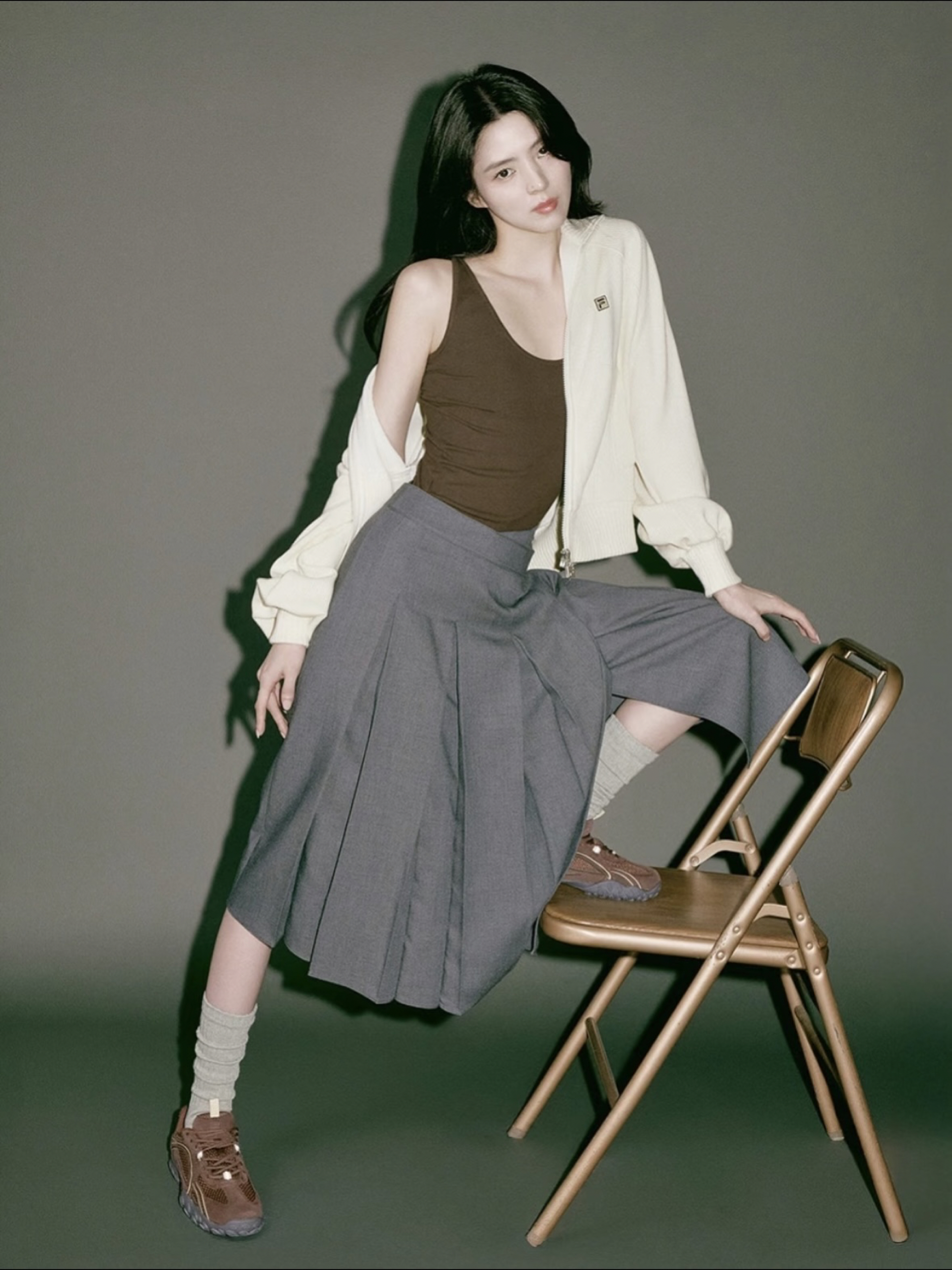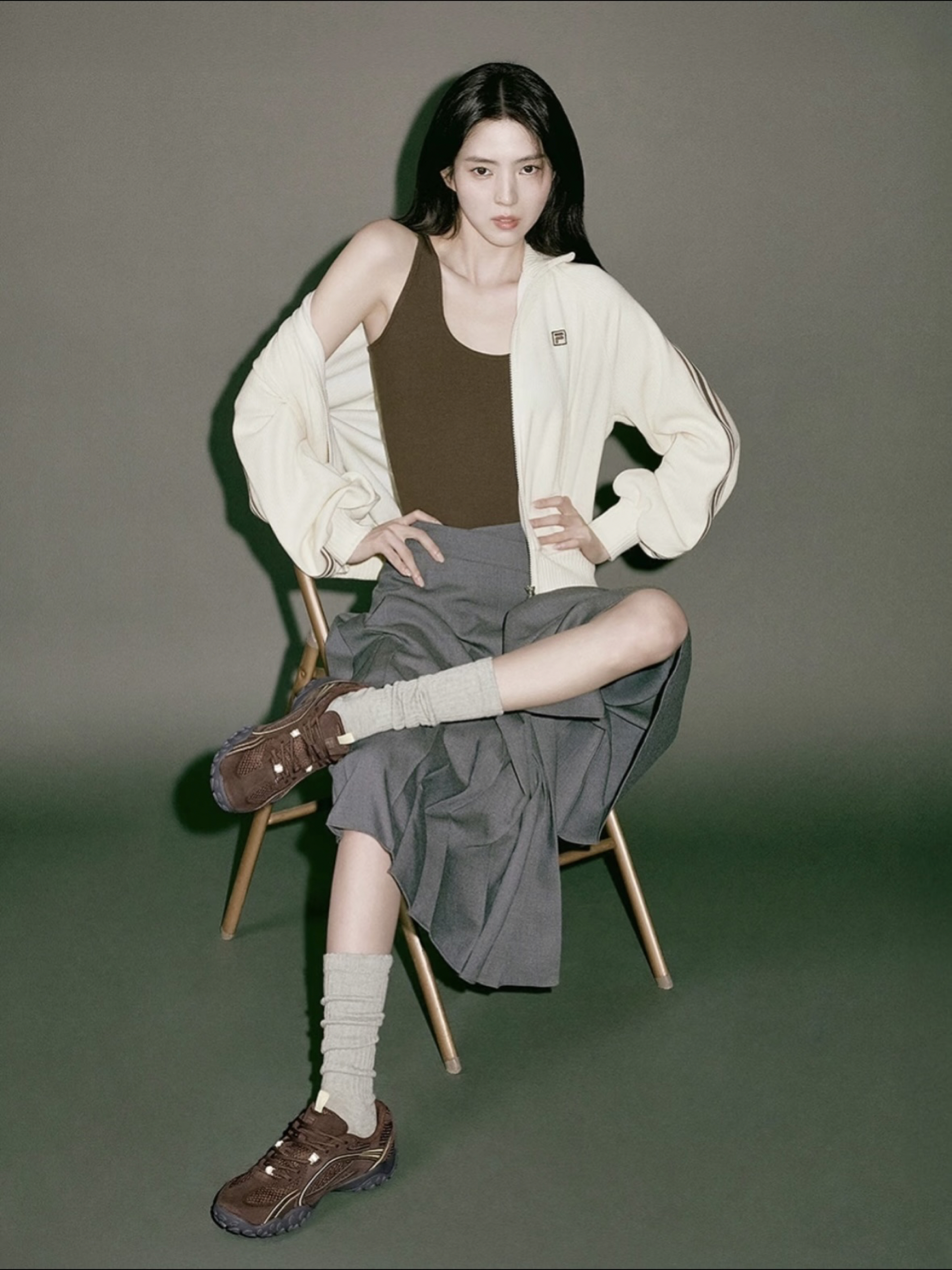 这套穿搭走运动混搭风,米白色FILA立领夹克简约休闲,搭配灰色开衩半身裙,柔化运动感的同时增添了女性化的慵懒韵味。 FILA Echape Choco休闲鞋棕调配色与夹克条纹相呼应,复古鞋型平衡了裙装的柔美,让整体混搭更具个性与层次感。