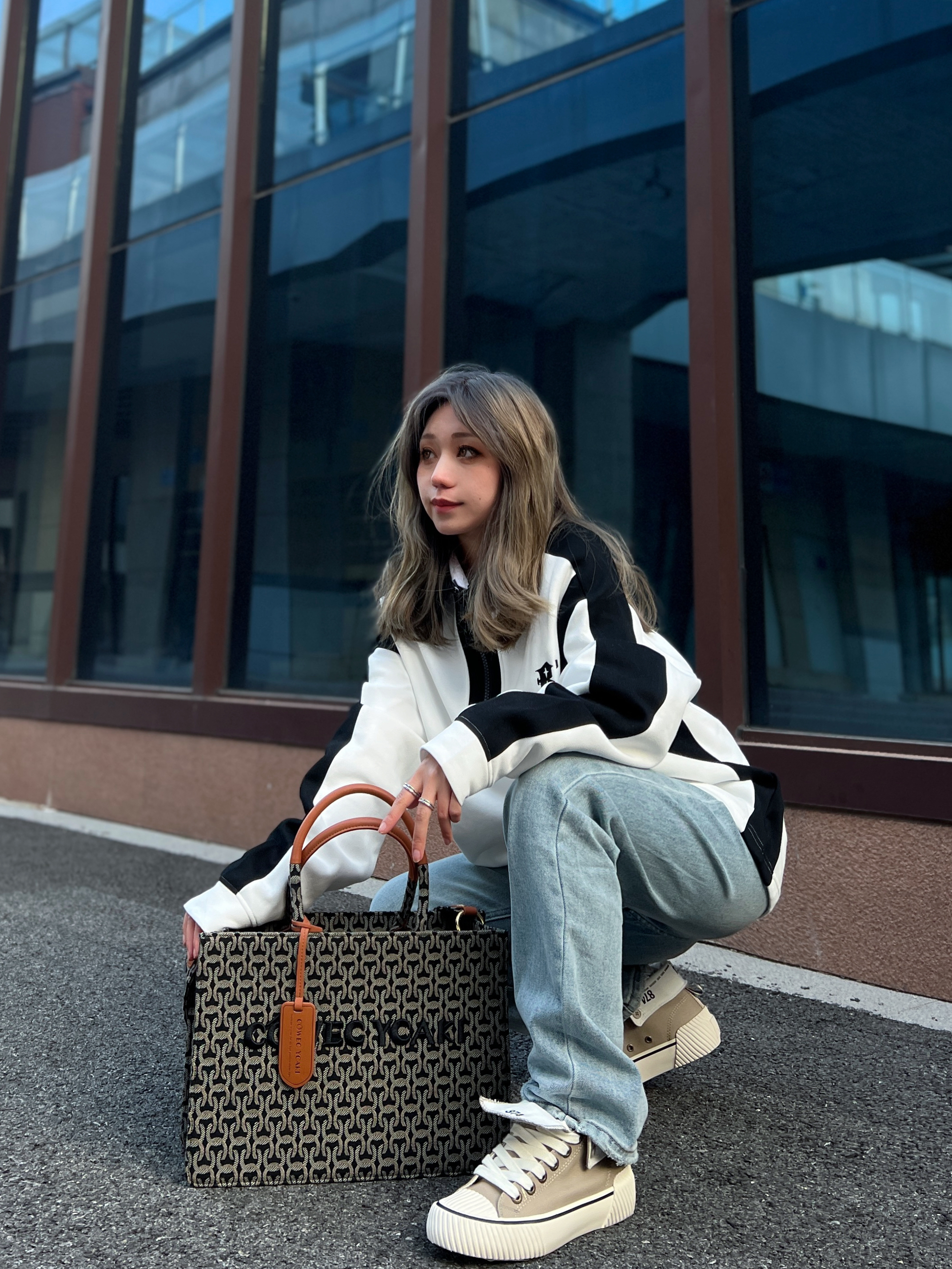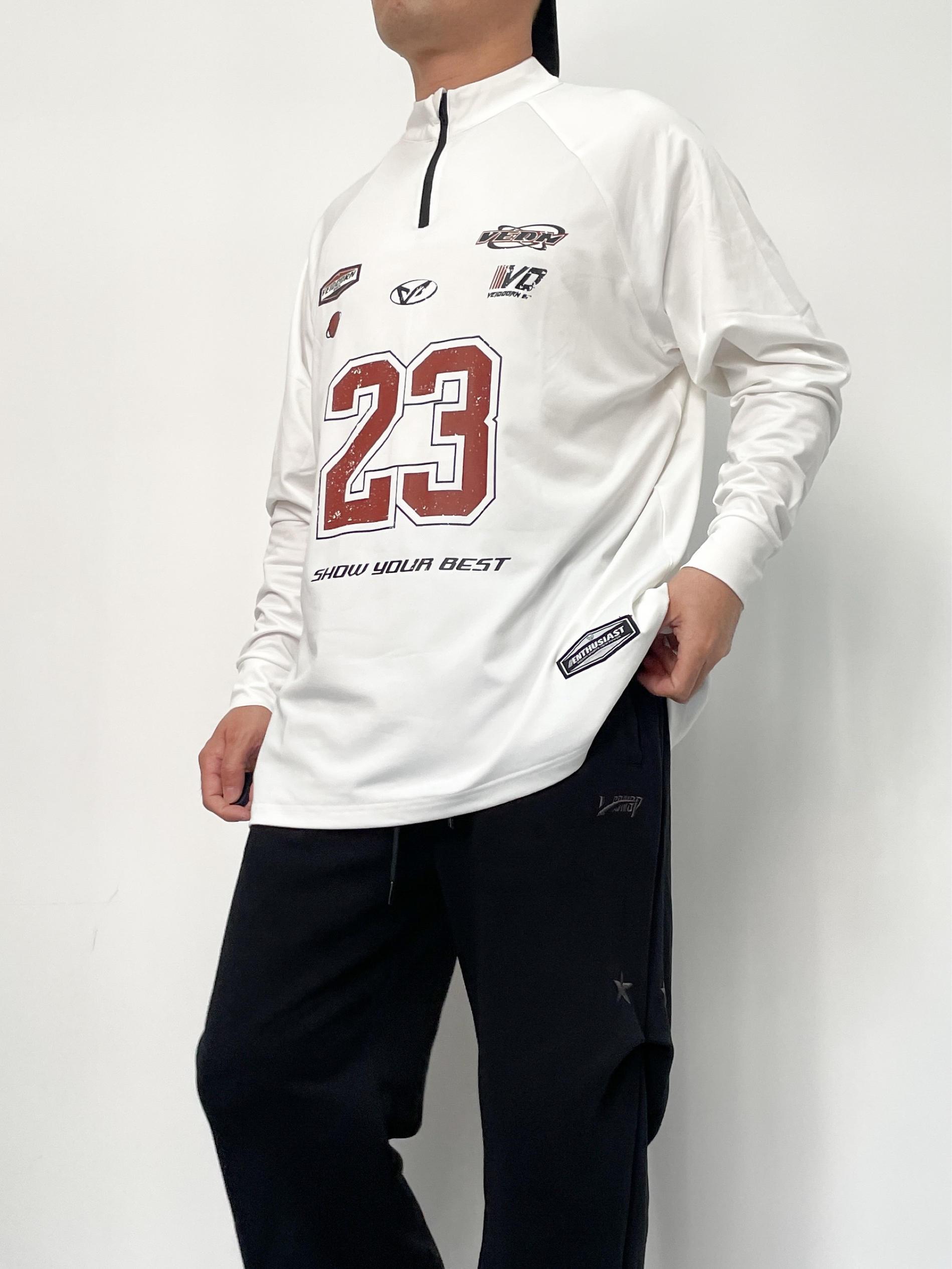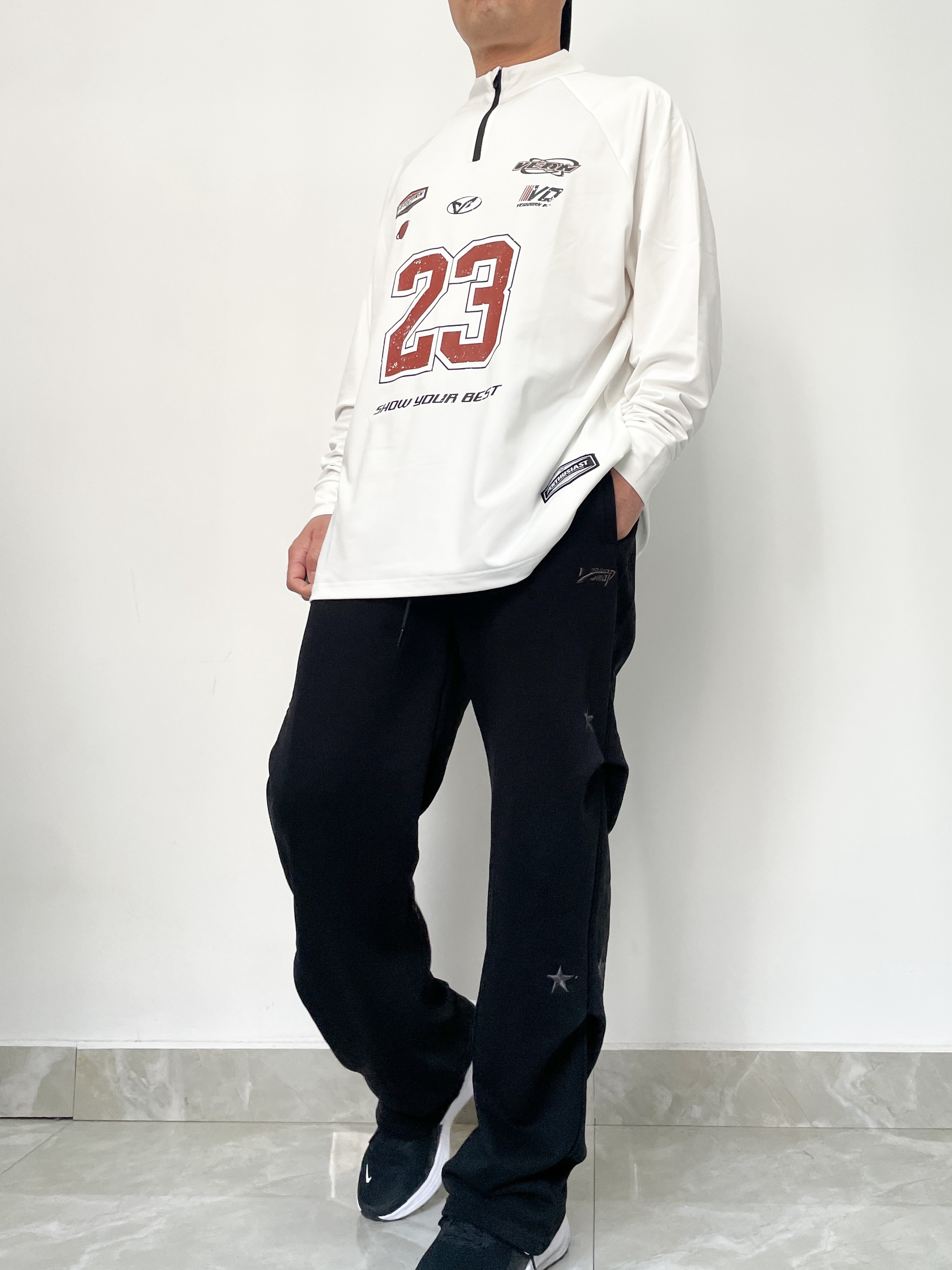 ❤️hi 宝子们好!✊今日分享:年度穿搭 秋冬就得把松弛感和帅气焊在身上! 今天上身一件美式运动风半拉链长袖,23号数字印花+复古贴标设计,自带街头潮感~ 裤子搭配垂坠感宽松卫裤,星星装饰+侧边细节,慵懒又藏肉! 面料是那种软乎乎的亲肤款,半拉链设计还能调节领口松紧,这套“上宽下松”的搭配,既能藏住身材小缺点,又能穿出随性美式氛围~ 不管是日常出街还是约朋友打球,这套休闲运动风都能轻松拿捏!