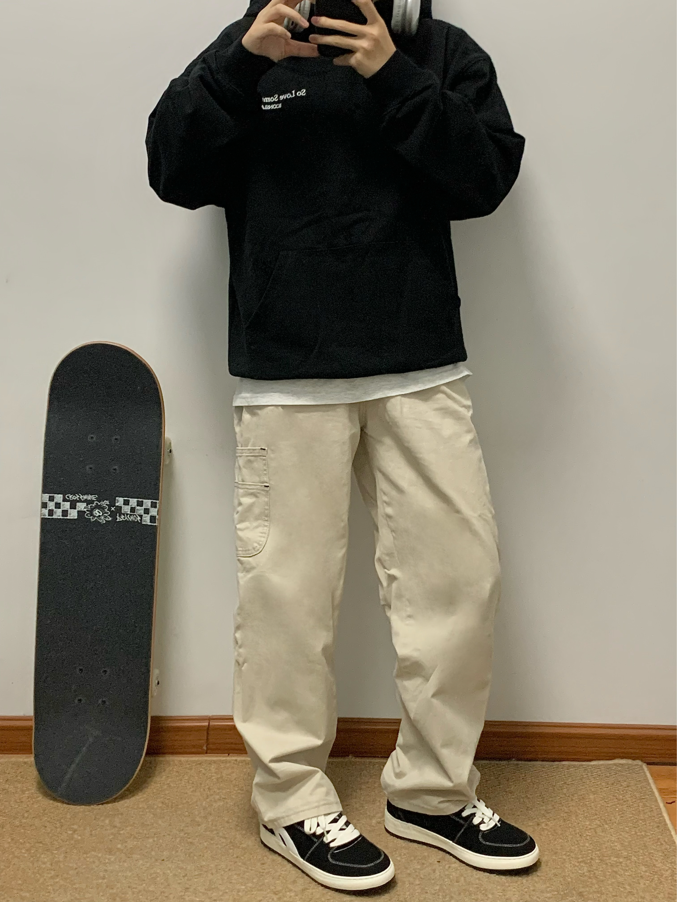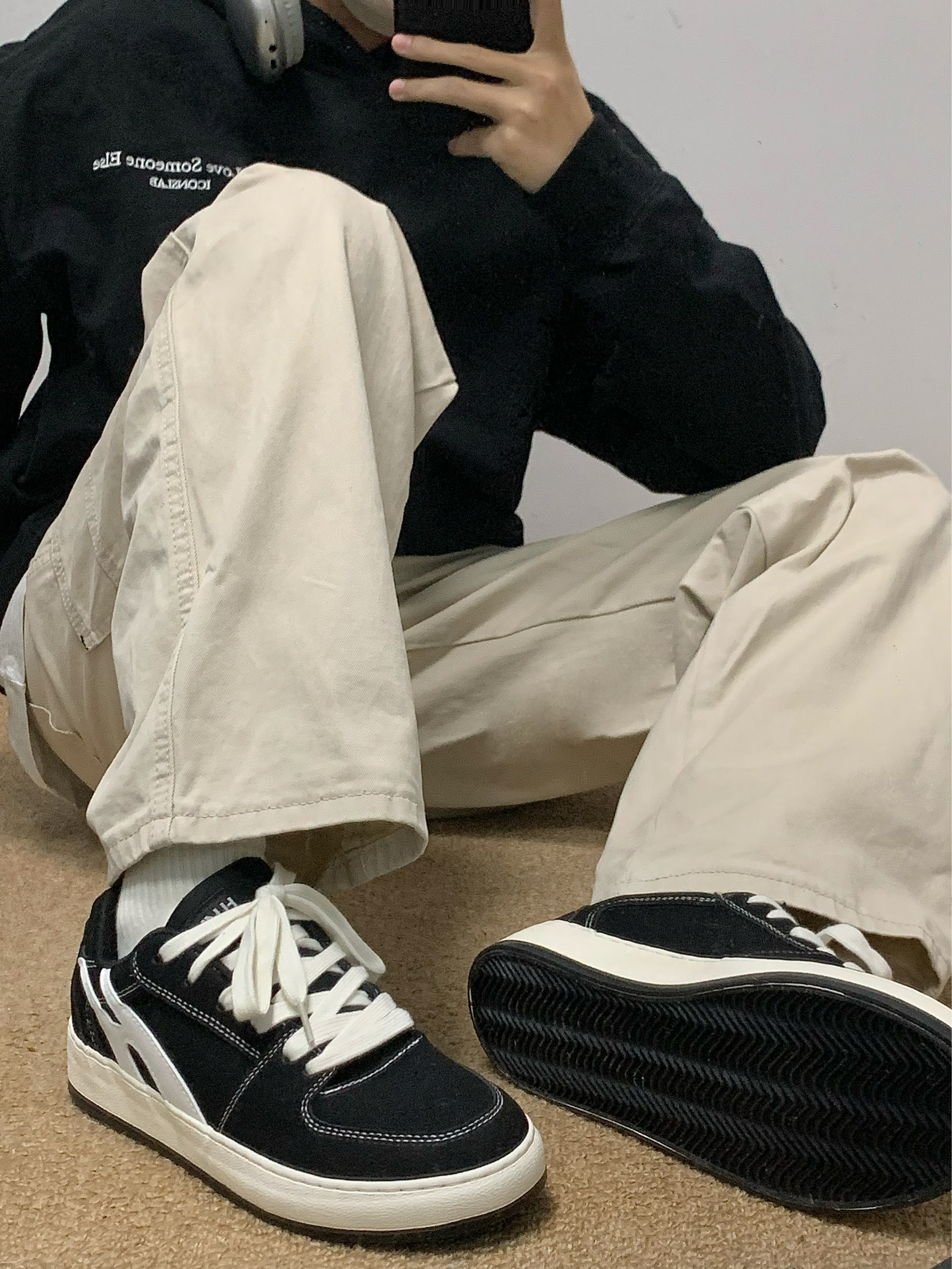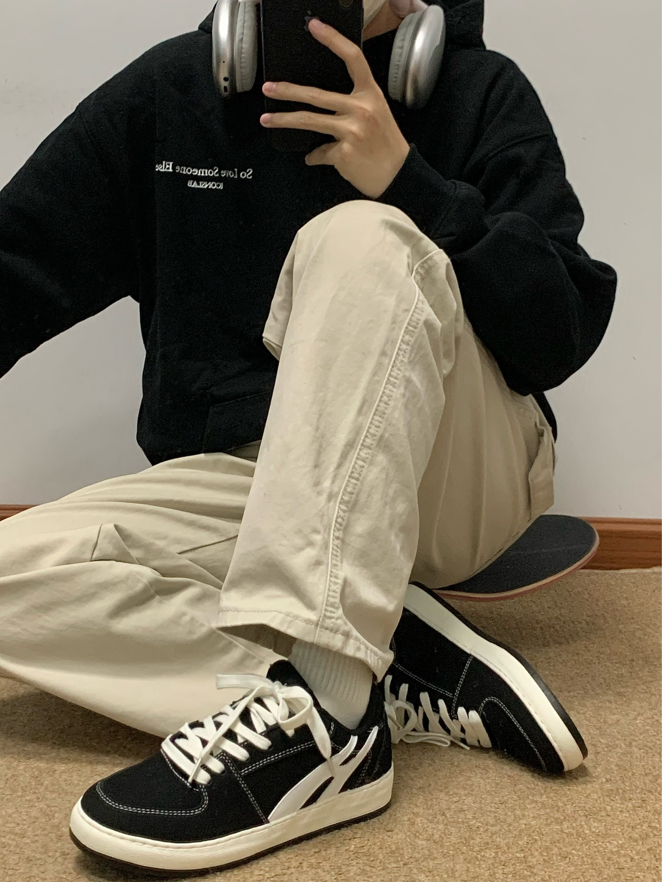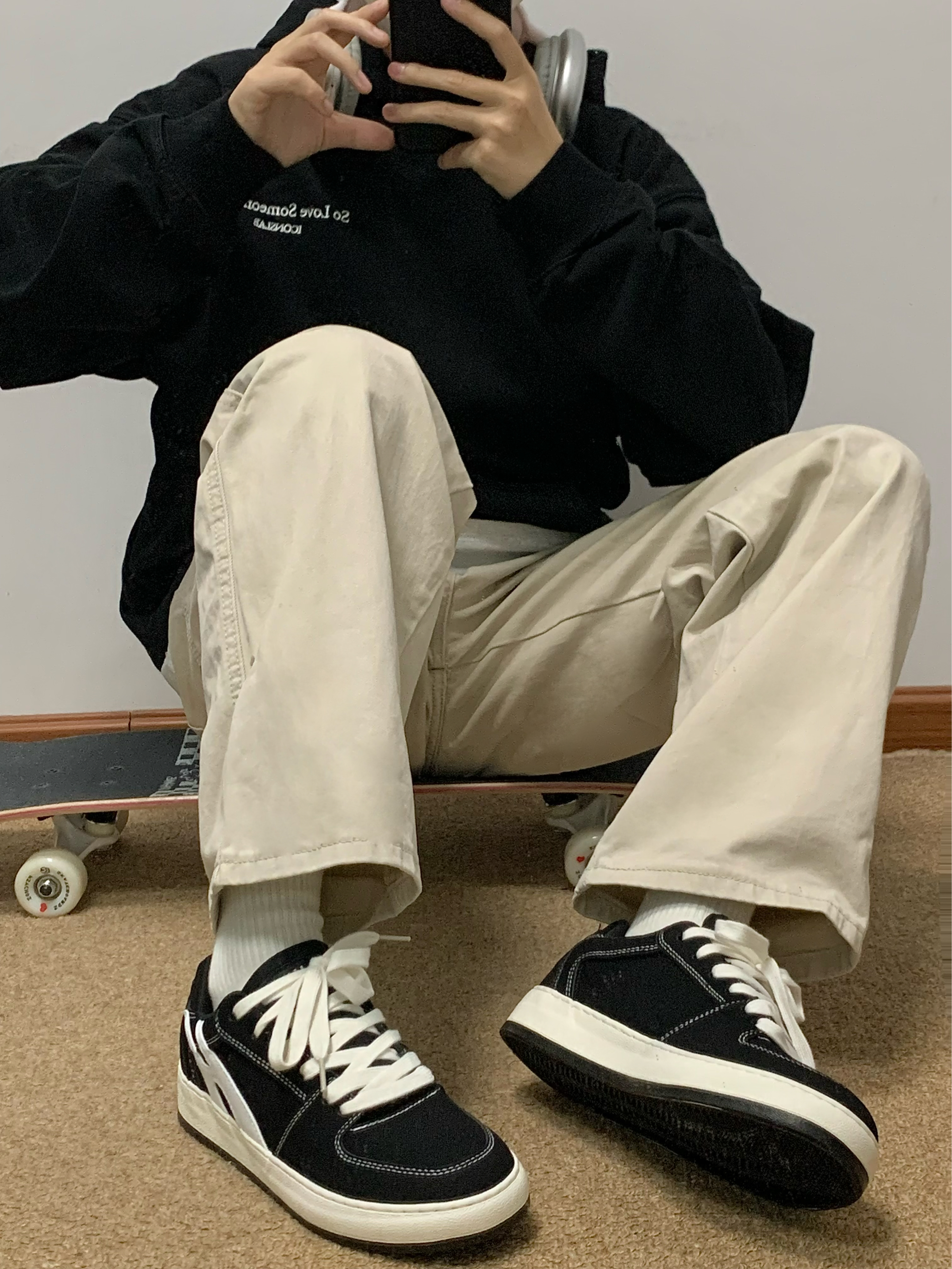 黑色卫衣➕米色休闲裤 再搭配上一双黑色板鞋上下呼应 整体以黑色为主 白色线作为点缀 上脚软弹 踩屎感十足 鞋底还有4cm的增高效果 秋日出游就穿这一身 包帅的! 👟:环球