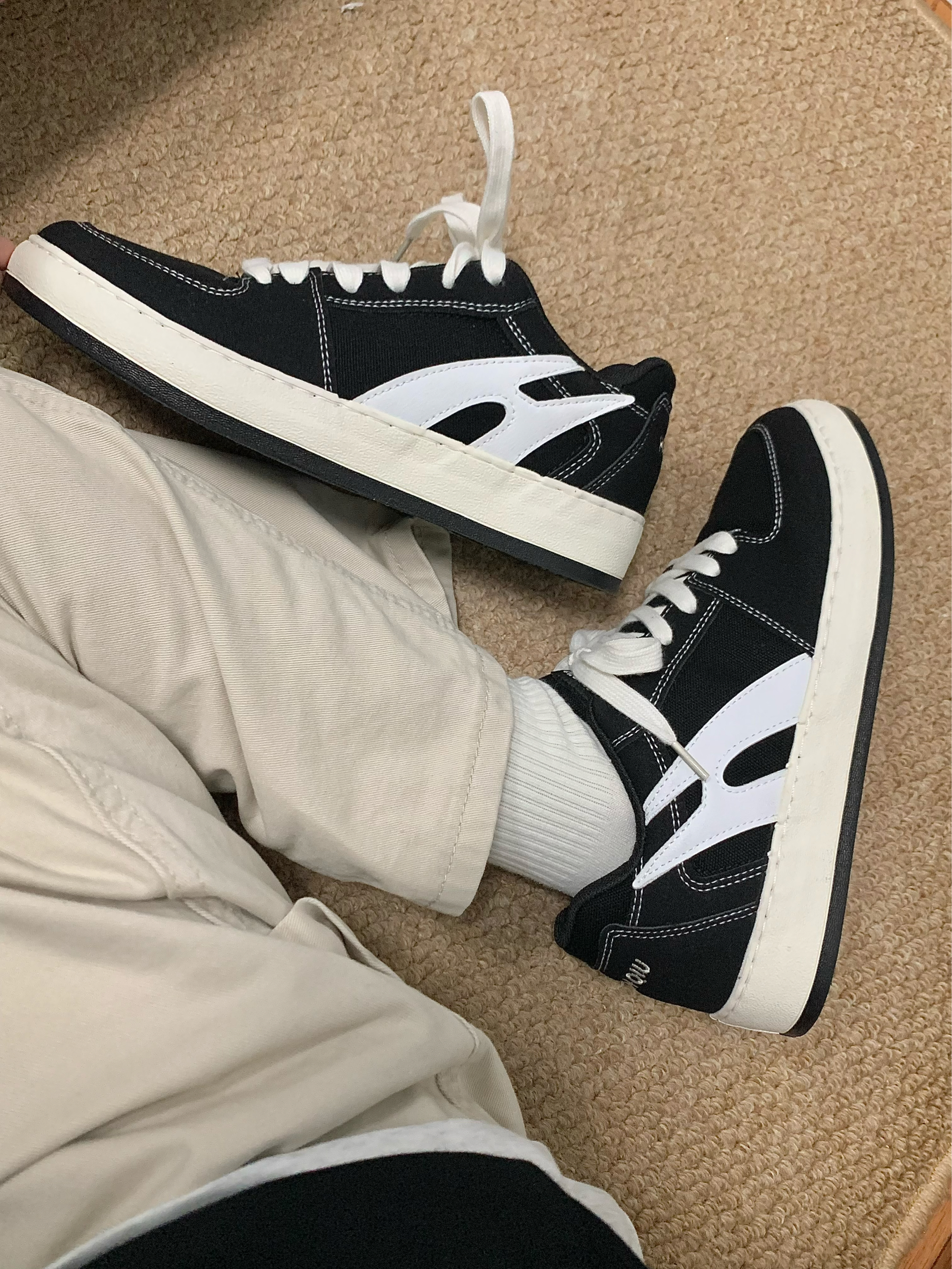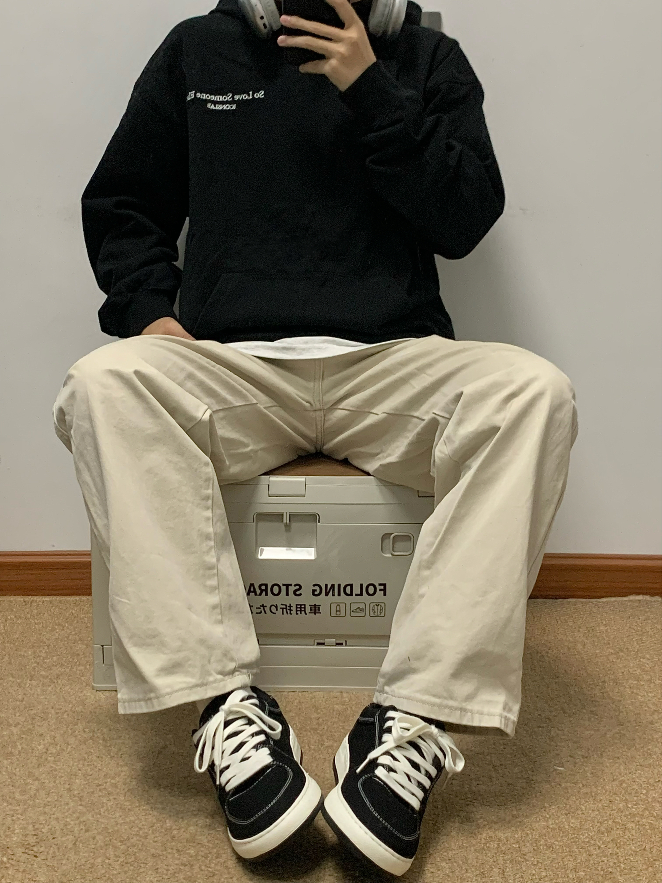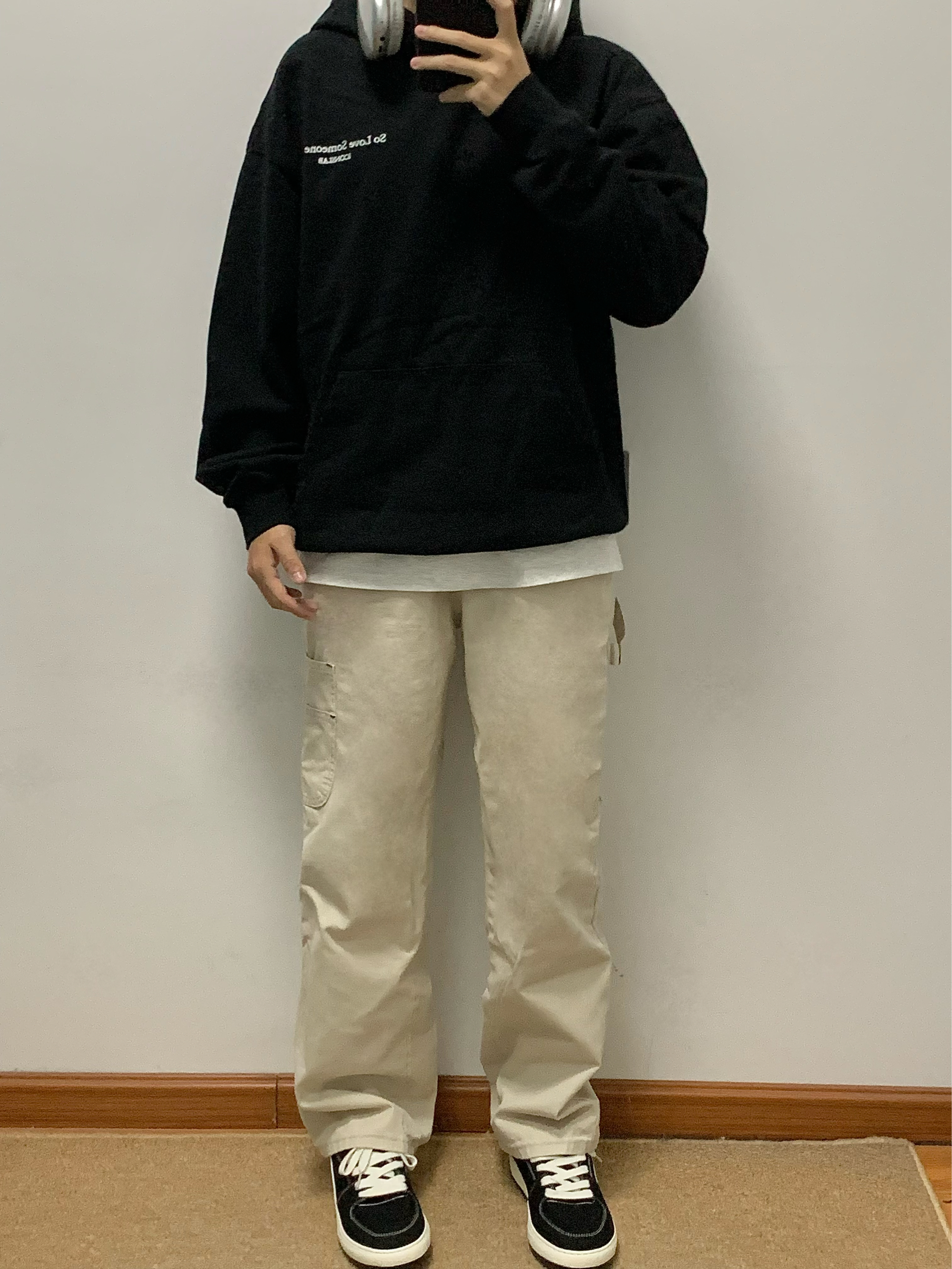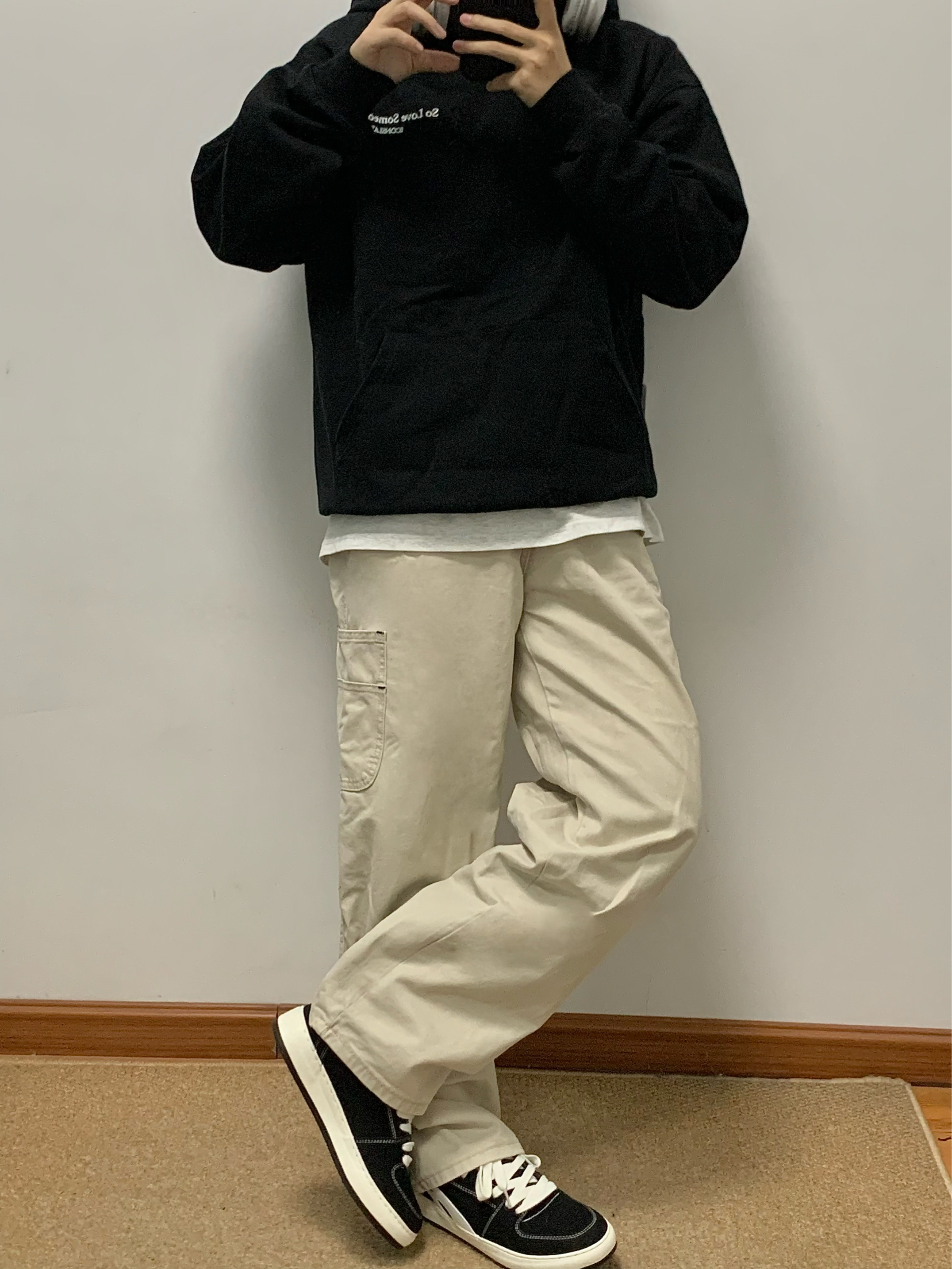 黑色卫衣➕米色休闲裤 再搭配上一双黑色板鞋上下呼应 整体以黑色为主 白色线作为点缀 上脚软弹 踩屎感十足 鞋底还有4cm的增高效果 秋日出游就穿这一身 包帅的! 👟:环球