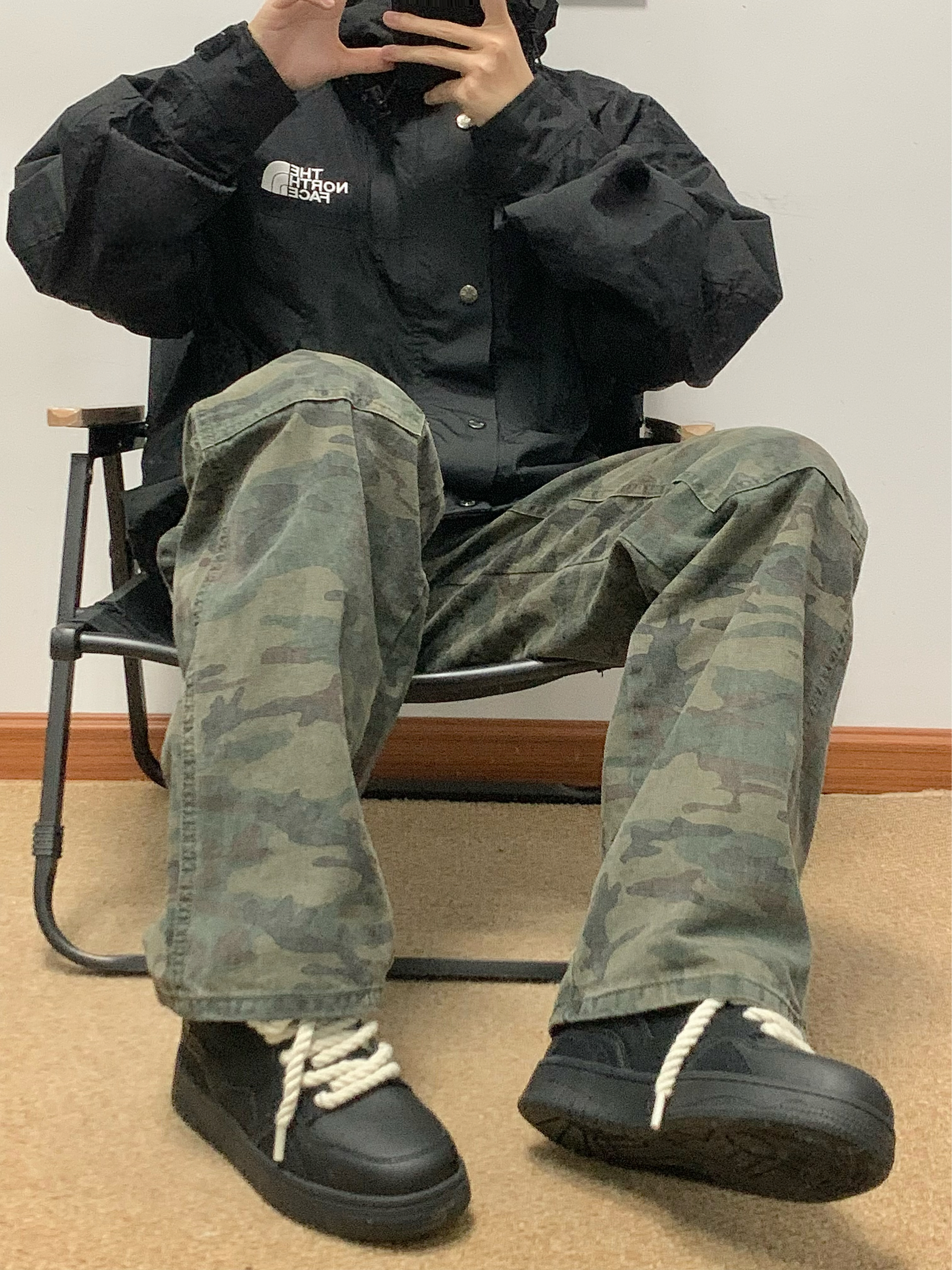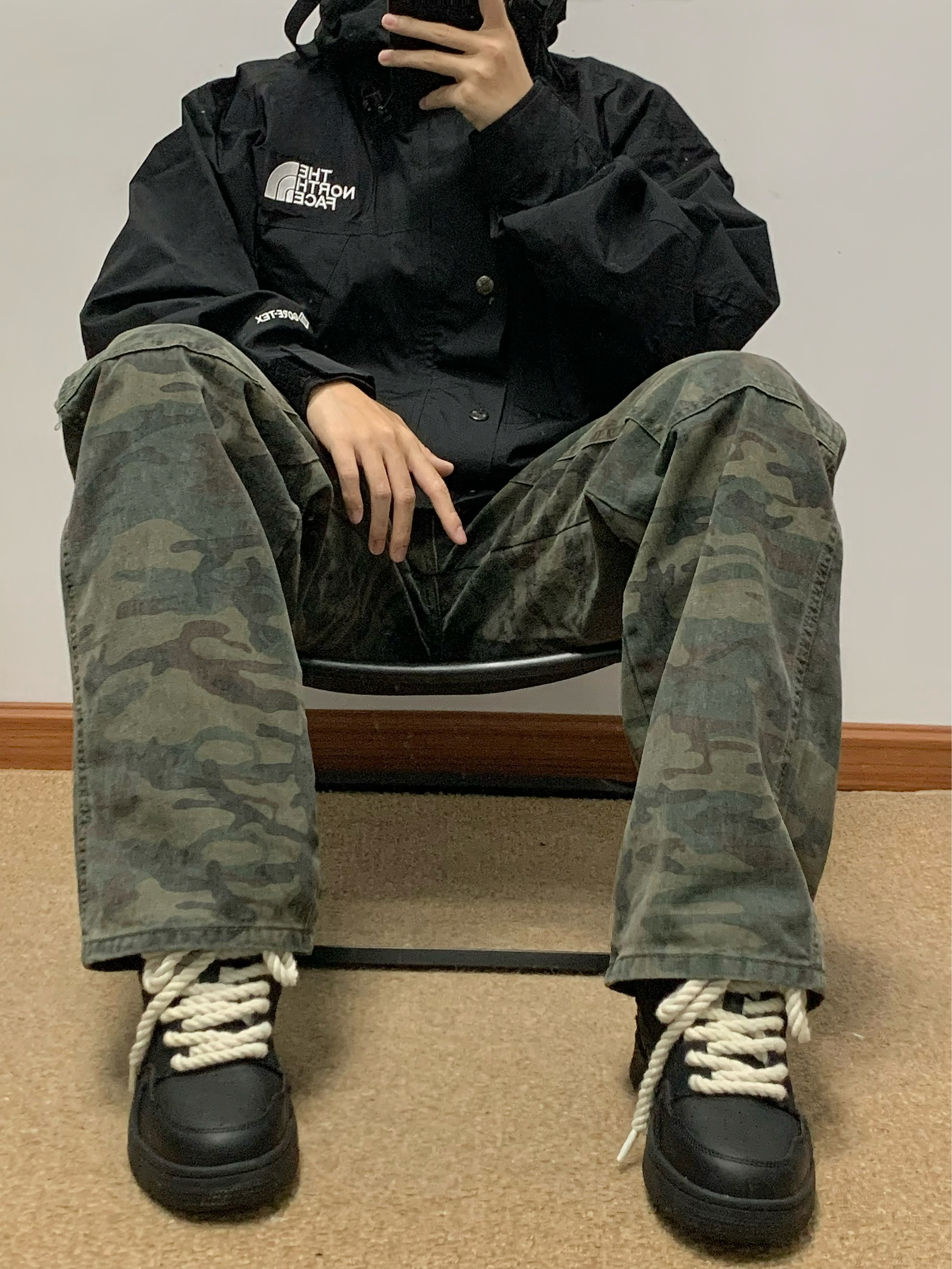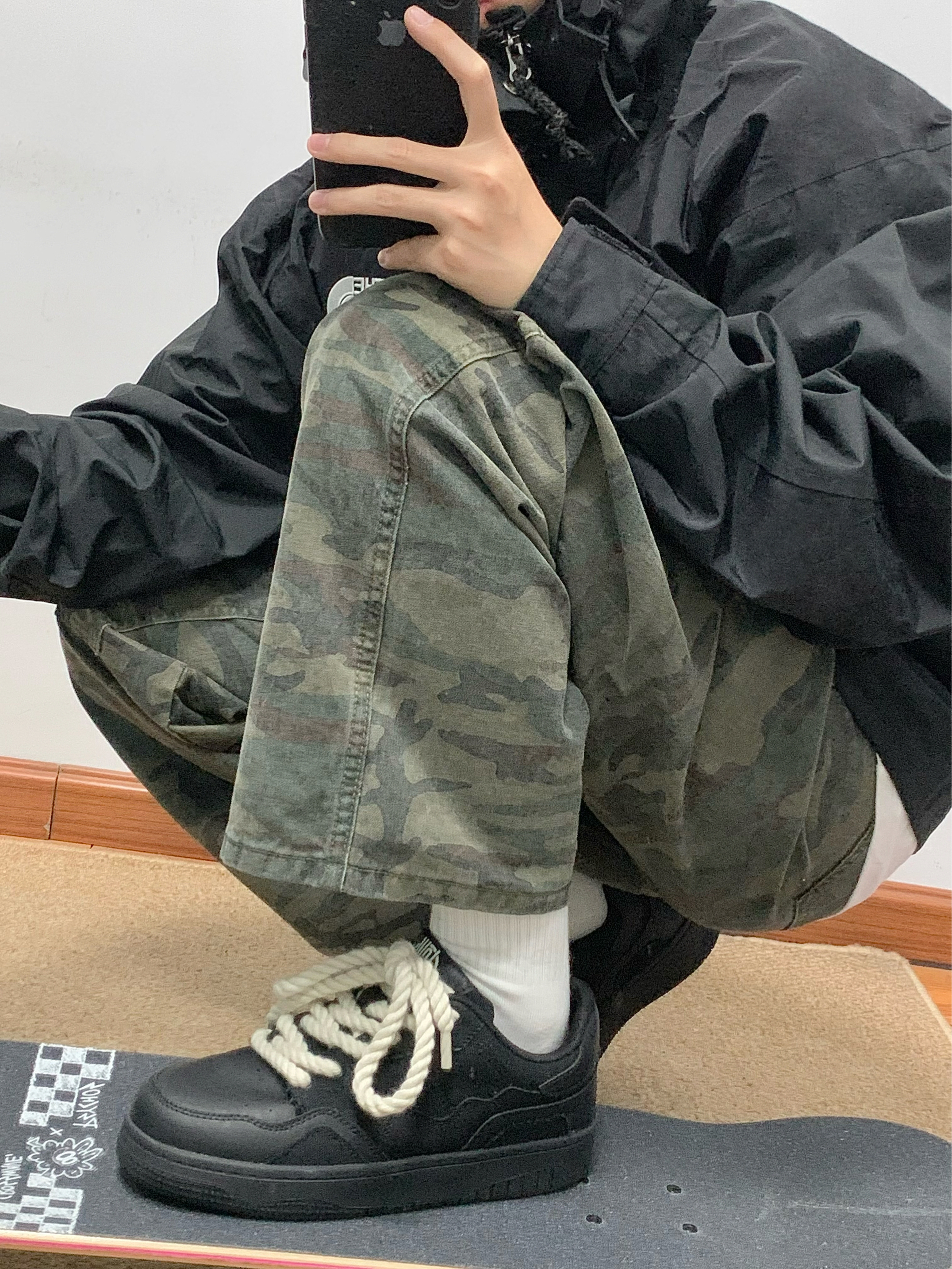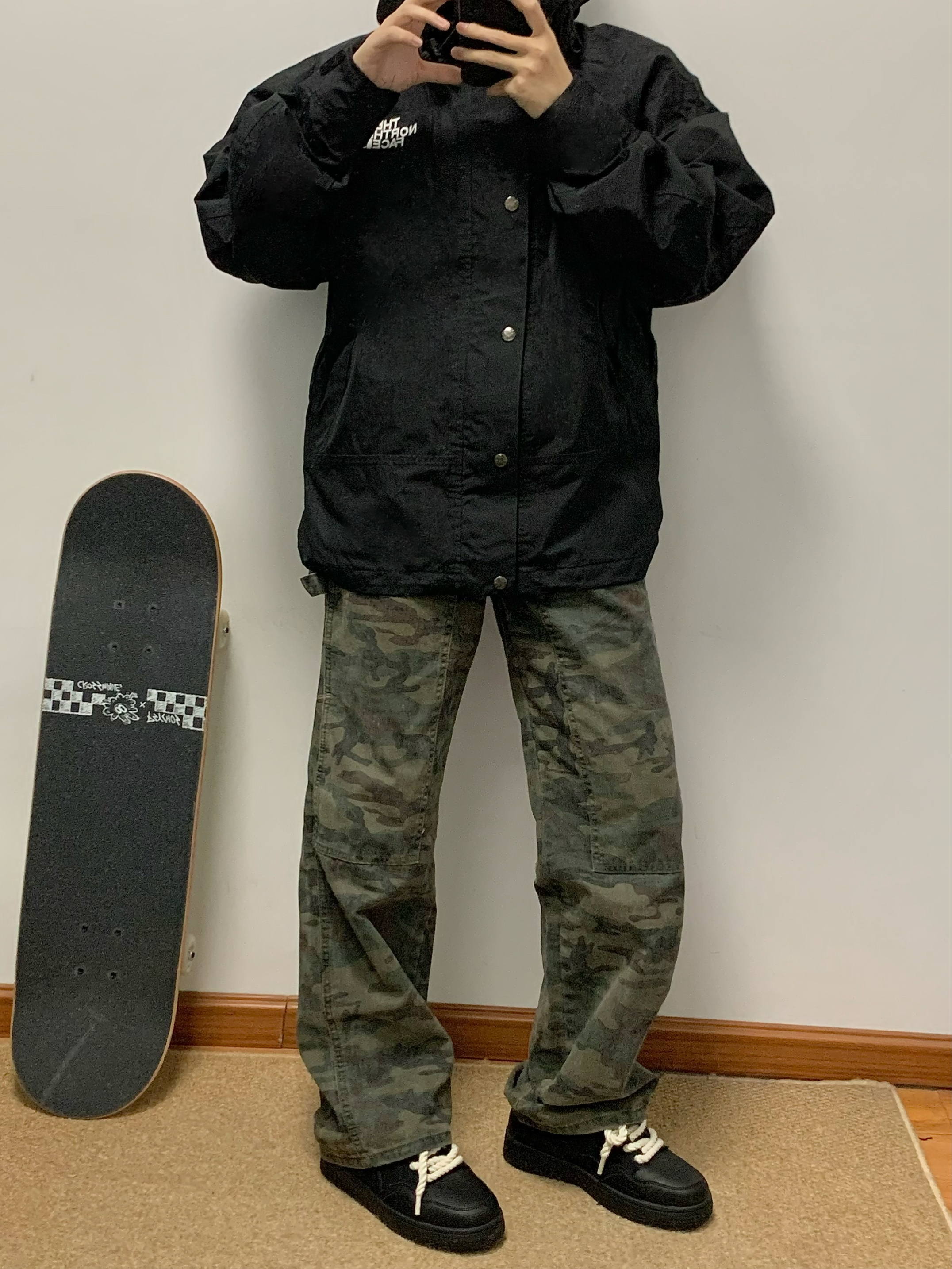 黑色冲锋衣➕迷彩工装裤 再搭配上一双黑色板鞋 帅酷十足 麻绳鞋带的设计 很吸睛 上脚软弹舒适 还有3-4cm左右的增高 日常搭配工装裤或者牛仔裤都可 秋日出游就穿这一身 包帅的!