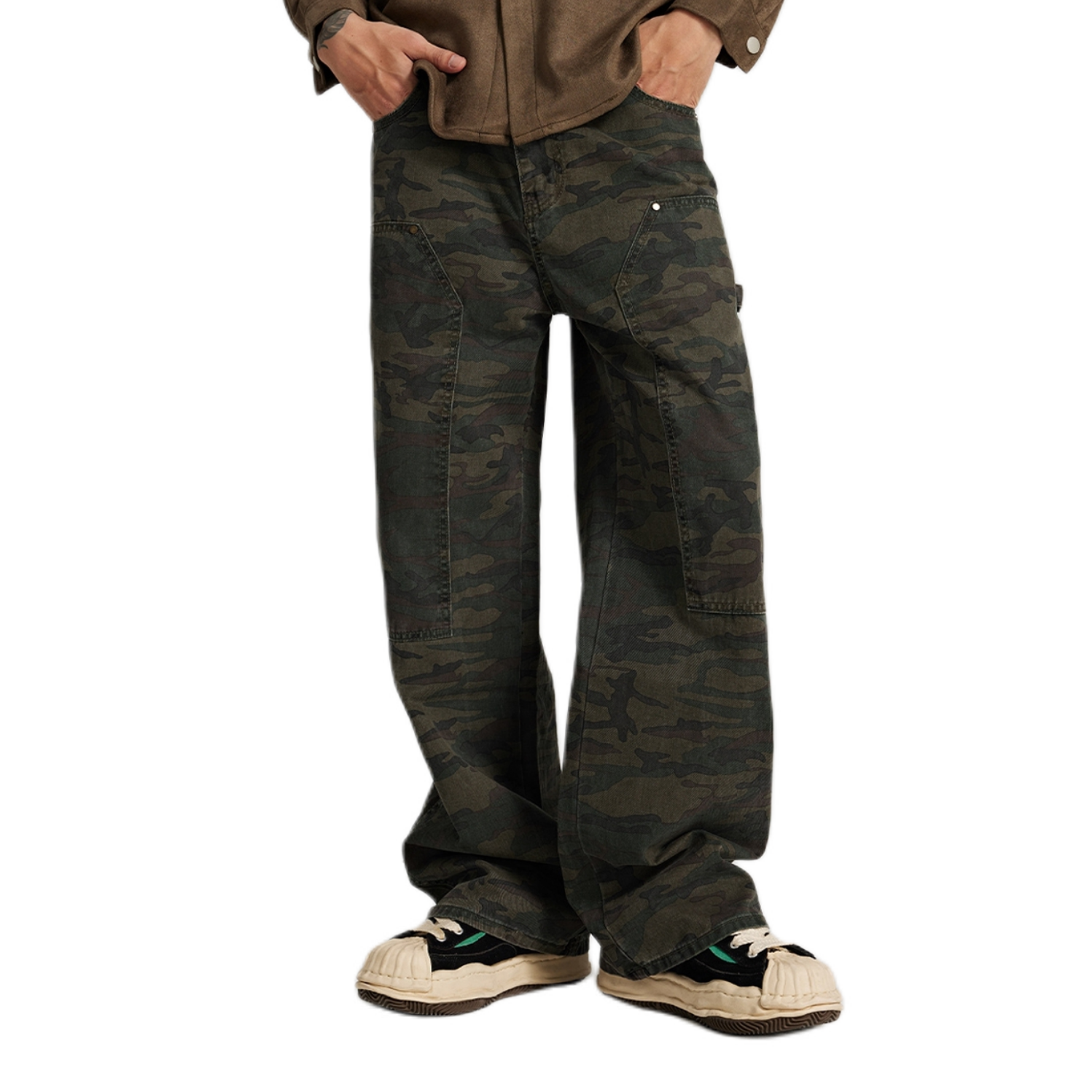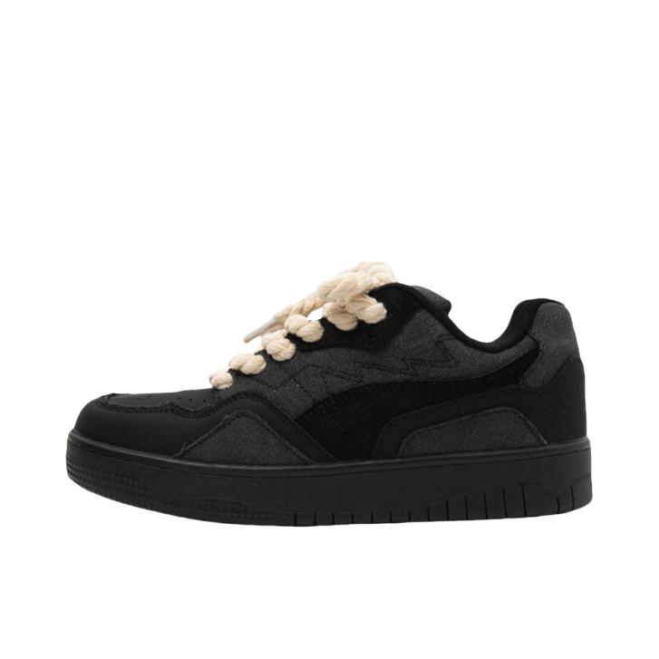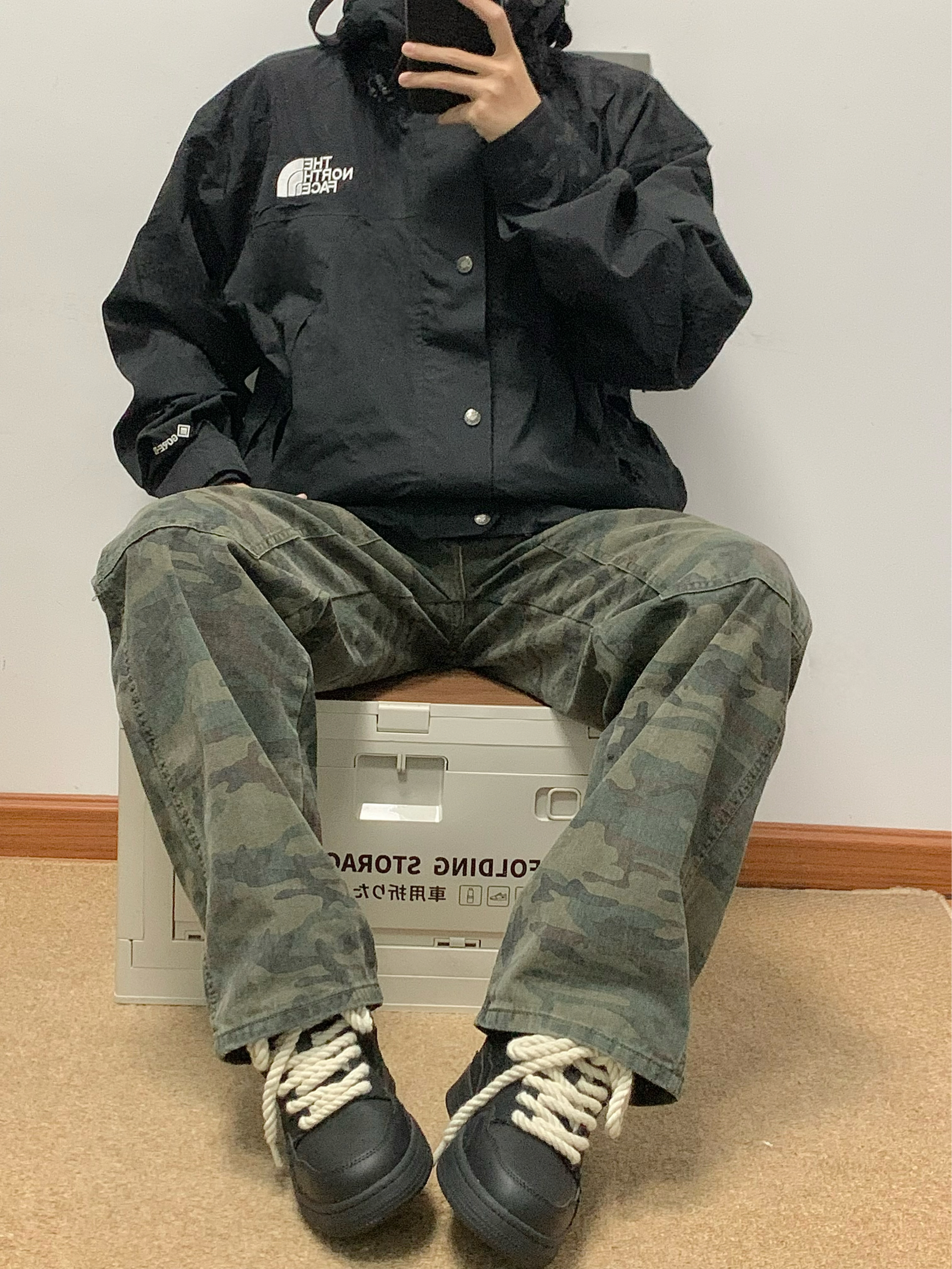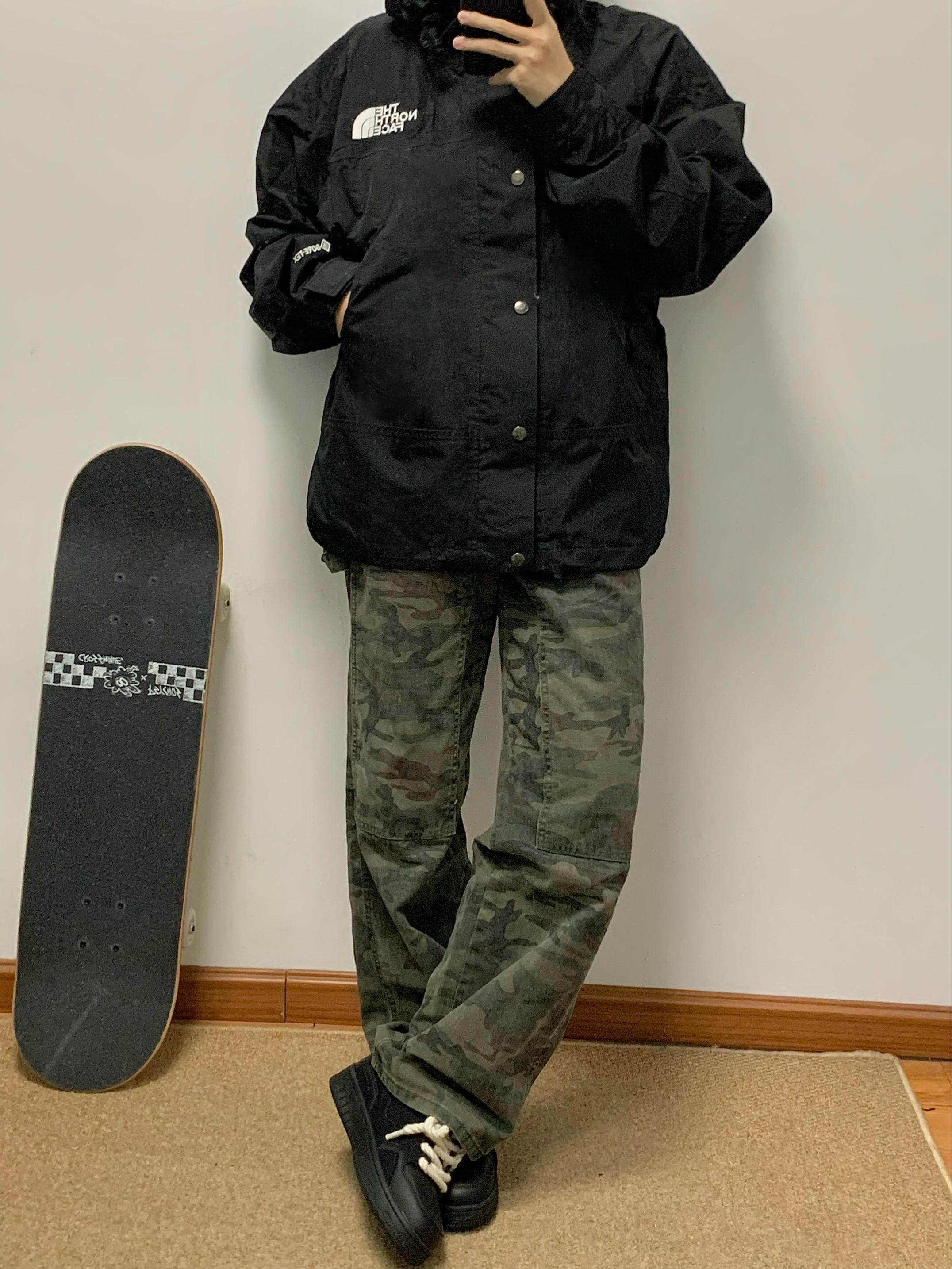 黑色冲锋衣➕迷彩工装裤 再搭配上一双黑色板鞋 帅酷十足 麻绳鞋带的设计 很吸睛 上脚软弹舒适 还有3-4cm左右的增高 日常搭配工装裤或者牛仔裤都可 秋日出游就穿这一身 包帅的!