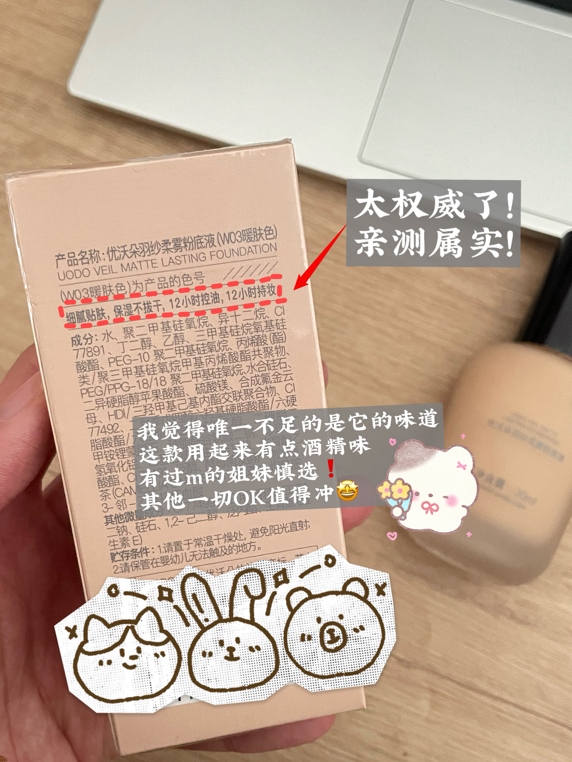 我用了方里的这款粉底液感觉他的遮瑕是非常棒的,几乎铺一层就可以遮住大部分的瑕疵和暗沉,质地也很水润,上脸轻轻就能推开,即便是多上一层也不会特别厚重,妆效是奶油肌的妆感,显得皮肤很白净,持久度也很不错,早八一天也没有很斑驳暗沉,秋冬用还是挺抗打的