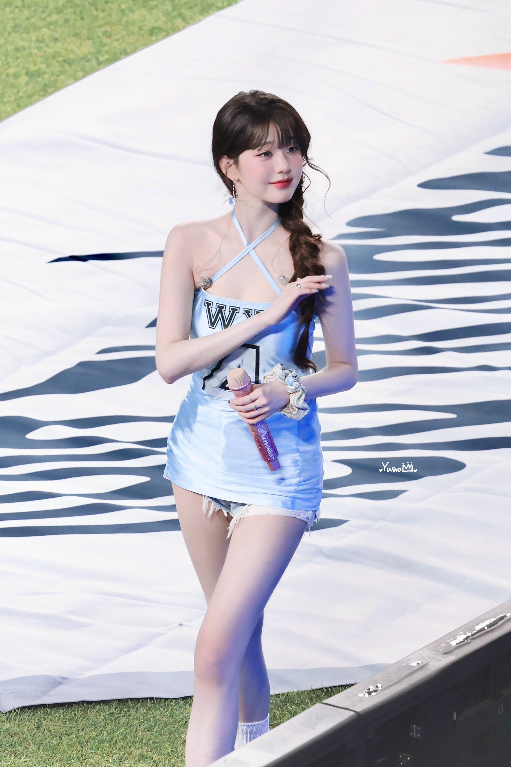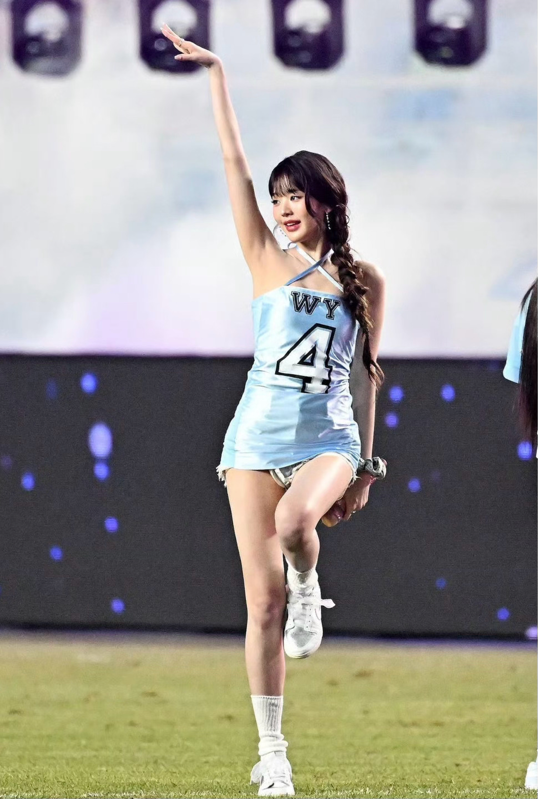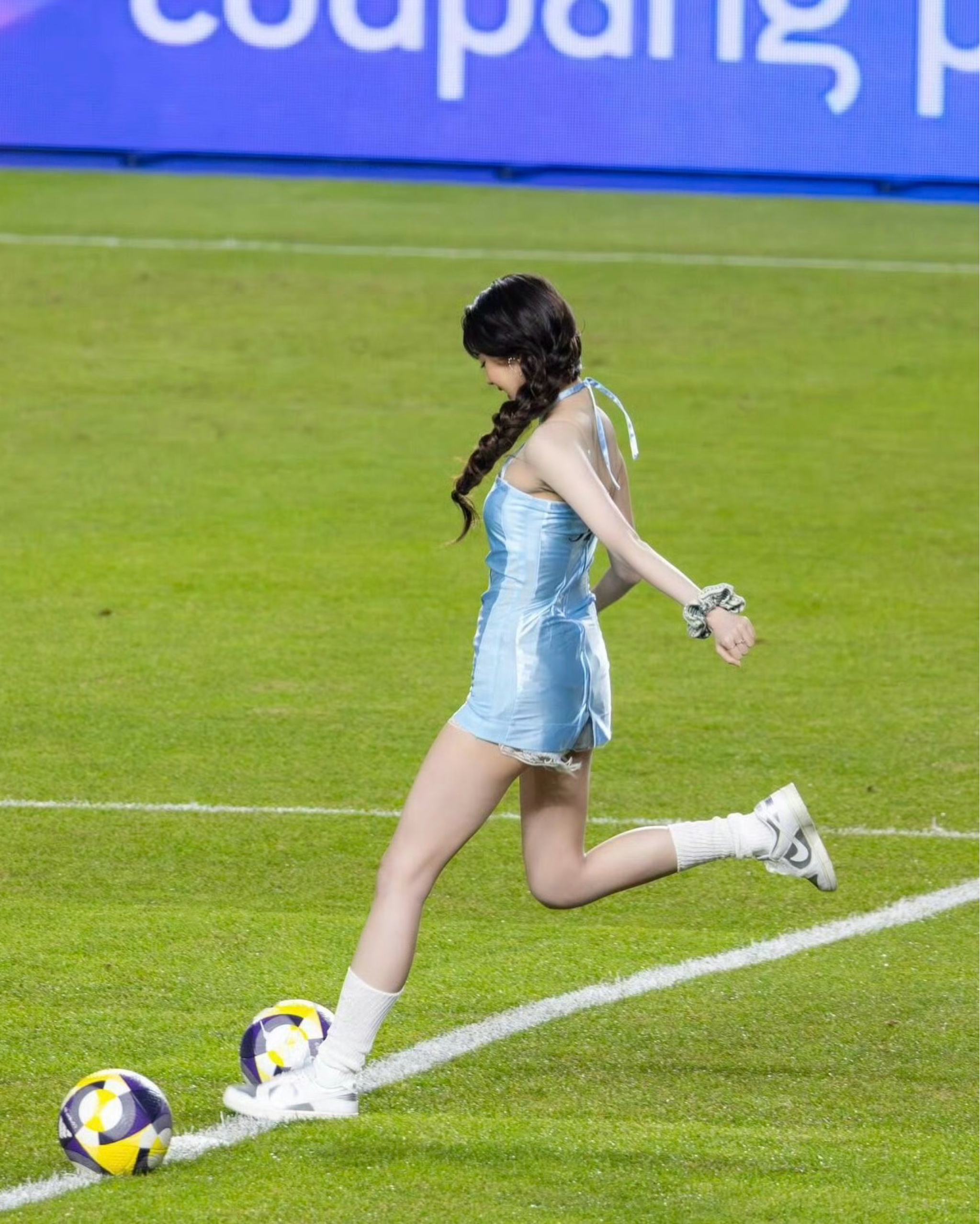 张元英开球穿搭是瞬间成为整个绿茵场的焦点 浅蓝修身裙装混搭破洞牛仔短裤,少女感与街头感兼具。 Nike Dunk Low Metallic板鞋米白色调适配清新裙装,低帮设计兼顾灵动与舒适,金属细节又为造型加了精致感,完美衔接裙装的柔美与球场的运动氛围🏃