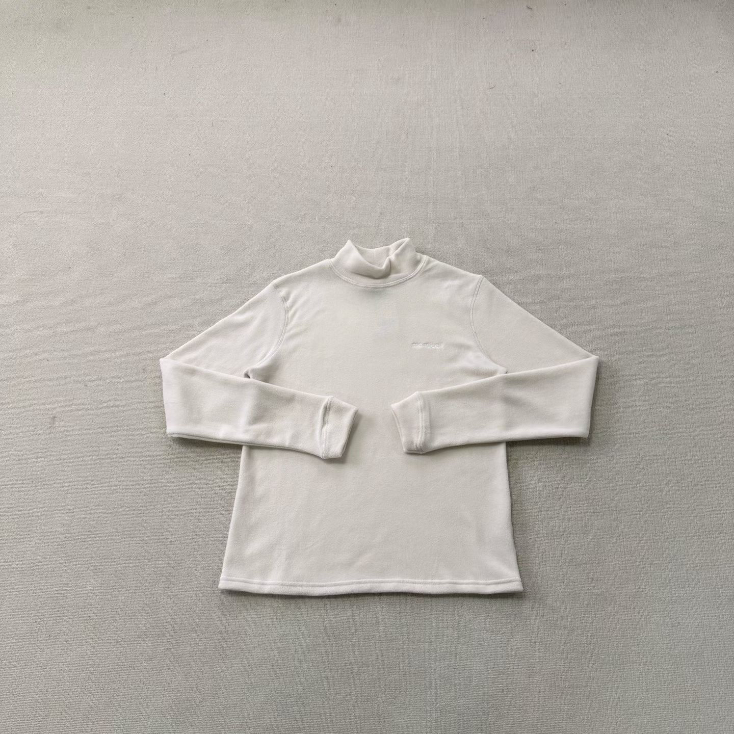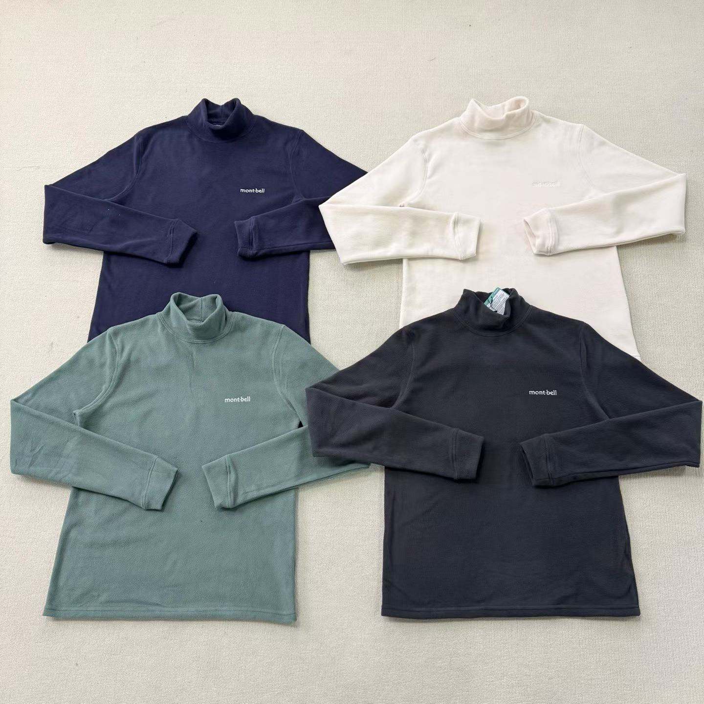 montbell摇粒绒高领打底衫实拍来啦!藏青、米白、墨绿、黑色四款经典配色整齐陈列,单款平铺能看清整体版型与高领剪裁的利落感,近距离特写还能摸到摇粒绒细腻的绒面质感,领口处的品牌标、尺码标细节也一一呈现。从整体到局部,从配色到材质,多角度还原这件打底衫的实物质感,保暖又百搭的基础款,秋冬内搭太合适了