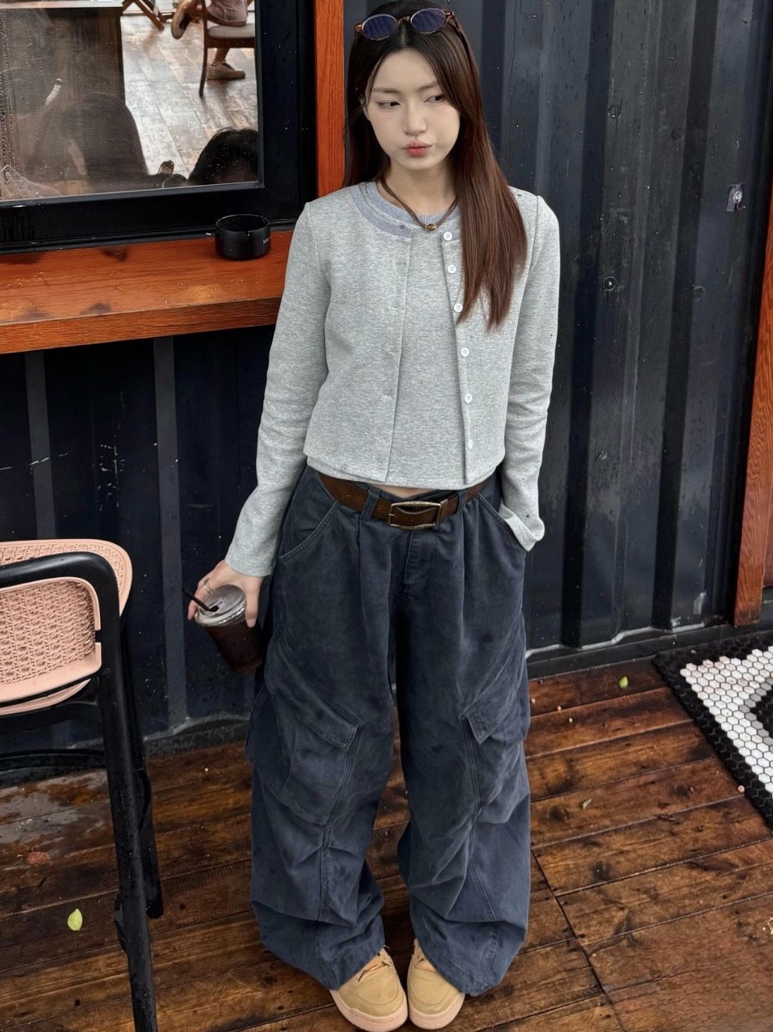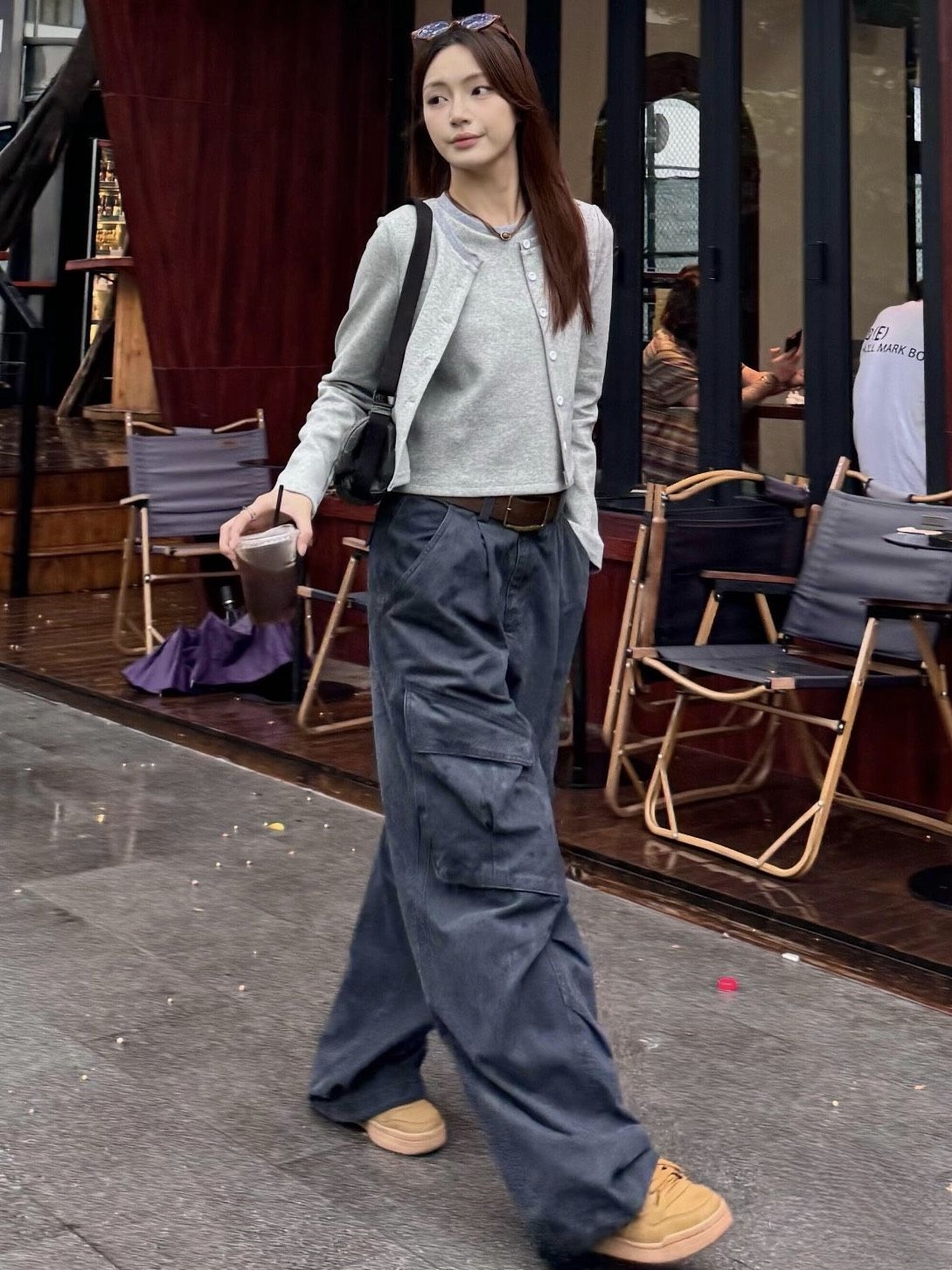 浅灰短款针织开衫+做旧感深灰阔腿工装裤,短款上衣+高腰裤型,直接把腰线拉满,显高显瘦buff叠满~ 垂坠感裤腿堆在脚踝,藏肉又随性,棕色皮带一扣,韩系氛围感这不就拿捏了!配个卡其色休闲鞋,轻便又复古,斜挎小包装下手机口红,日常出街舒服到不想换! 春天这么穿去咖啡店拍照、压马路,简约又有质感,女生的「慵懒高级感」模板抄作业! #Ootd #工装裤穿搭 #韩系穿搭 #松弛感穿搭 #春季穿搭