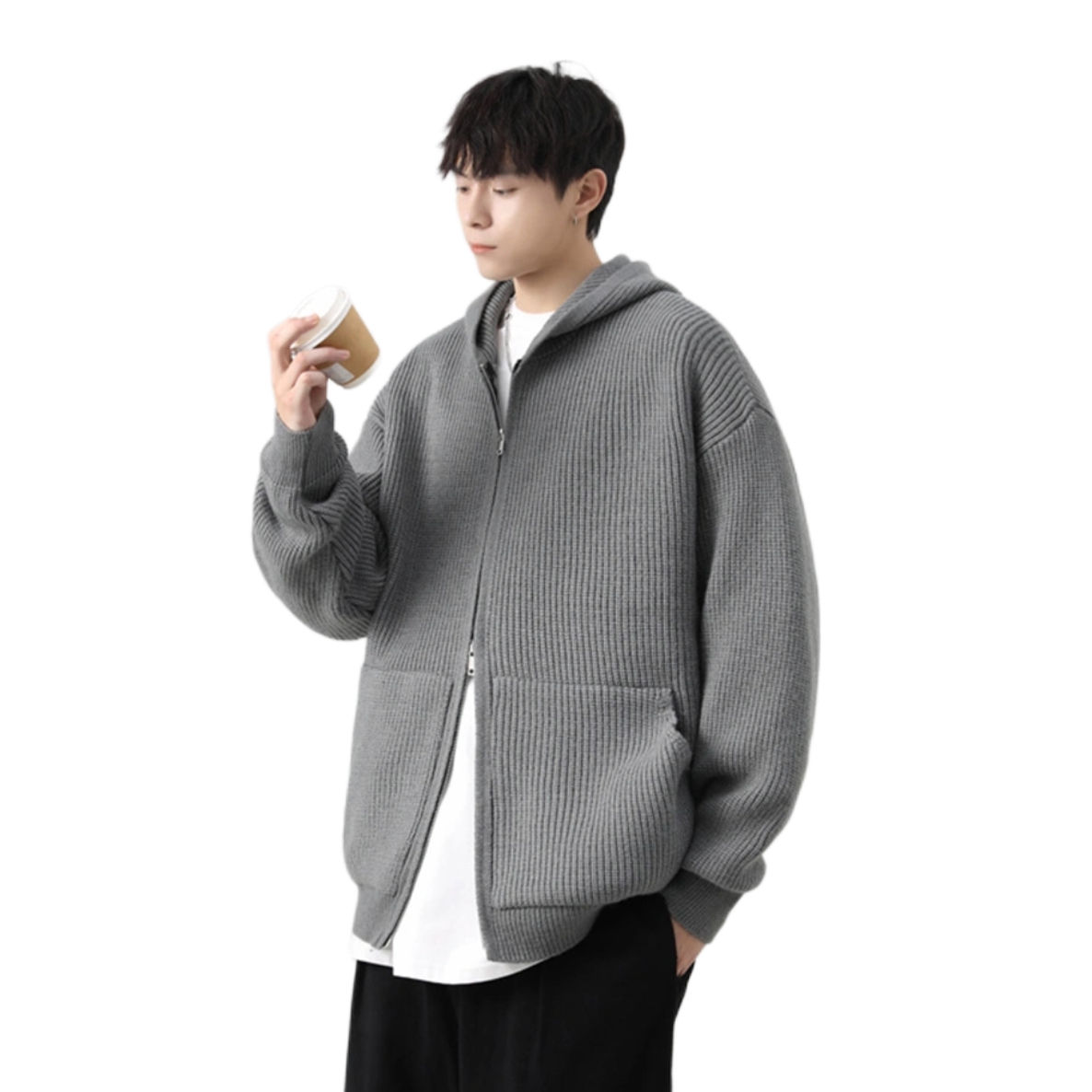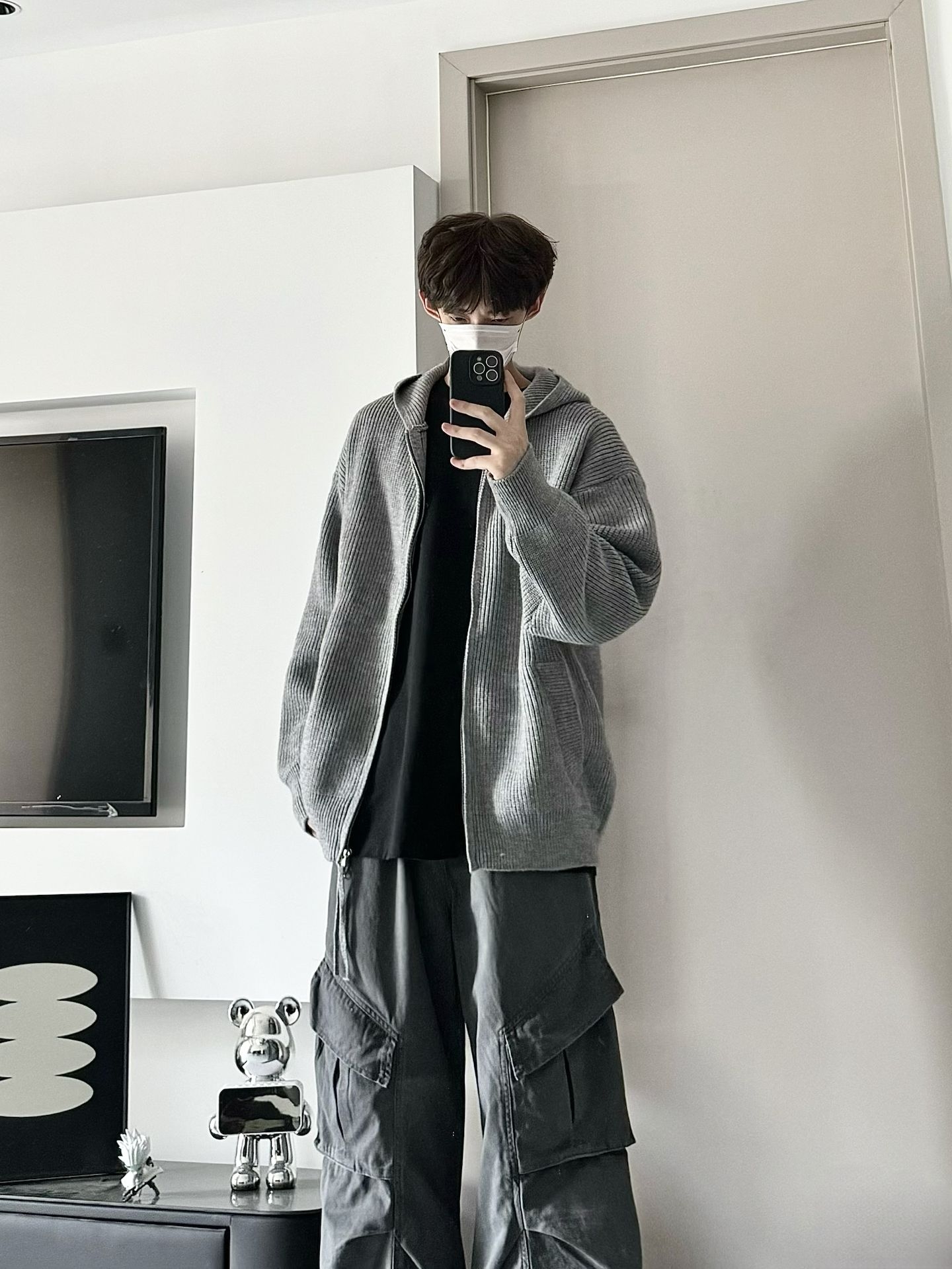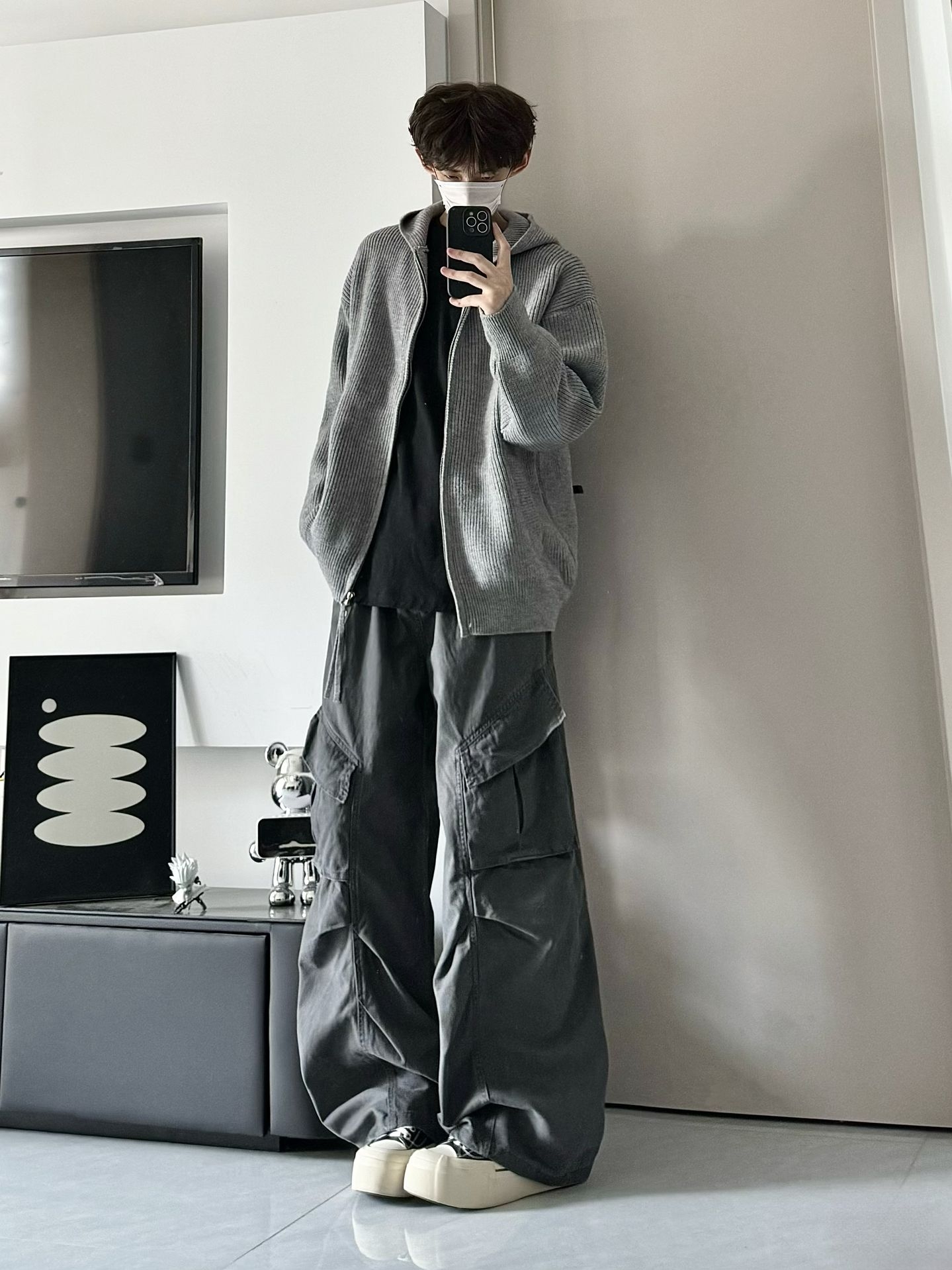 谁能拒绝一身灰的慵懒感啊😌 灰色连帽针织开衫软乎乎的,贴身穿超舒服,连帽设计还自带氛围感 内搭黑T做层次,下装配深灰工装阔腿裤,垂坠感拉满,腿长直接拉到一米八 踩双厚底鞋,休闲又不拖沓,出门随便穿都帅到没朋友👌 #男生穿搭 #灰色系穿搭 #松弛感穿搭 #工装裤 #OOTD