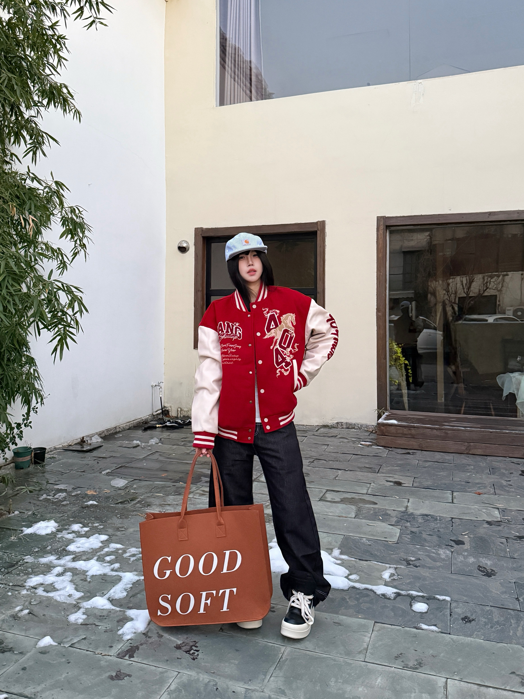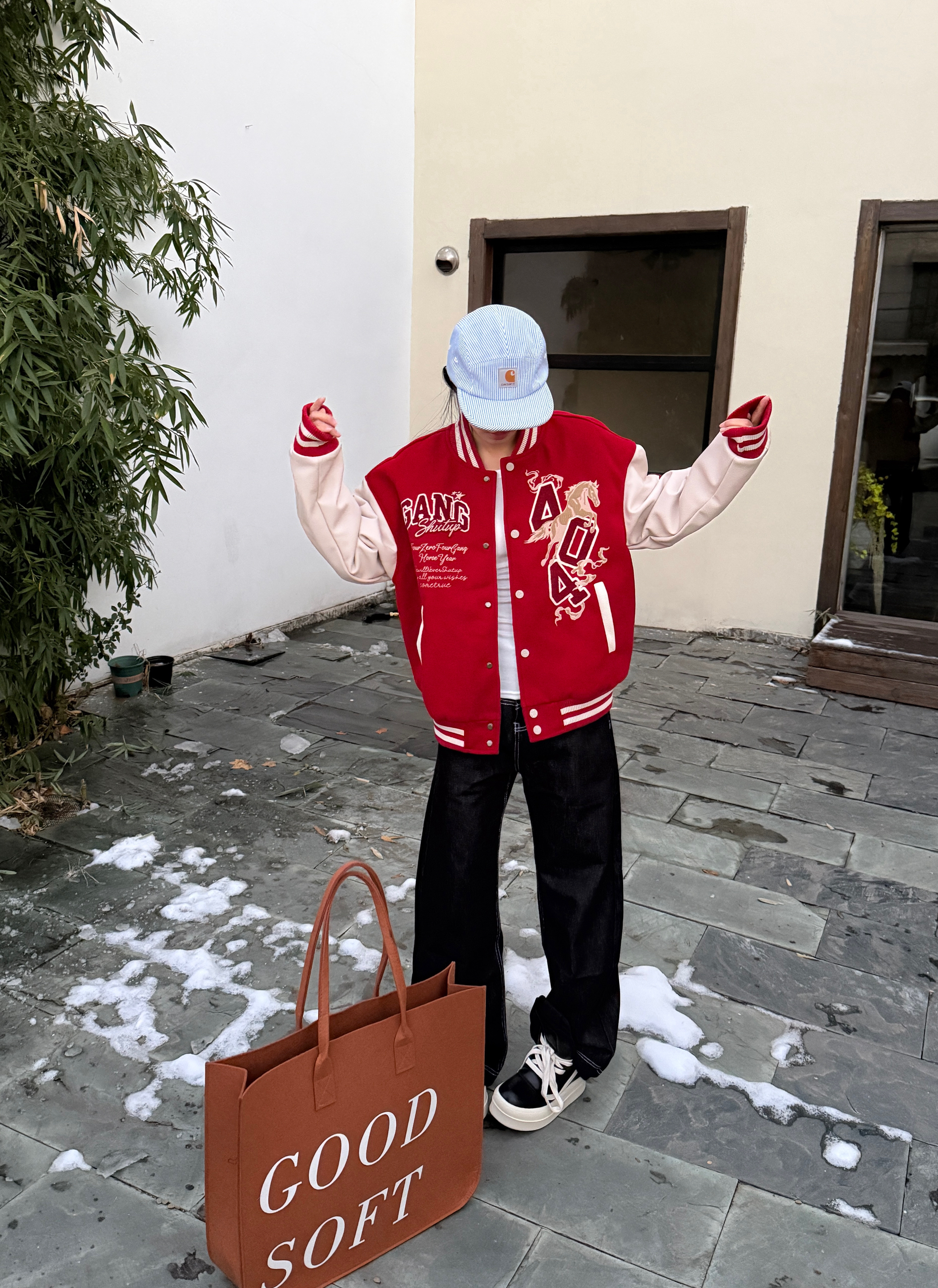 今天上身 404MOB GANG 限定棒球服 红色上身真的巨显白 少年感满满 面料就很厚实 毛呢质感很扎实 米白袖子的字母刺绣高级感满满 ⬇️搭配浅色牛仔裤就很帅气 再戴一个冷帽增加氛围感 这一套秋冬look你学会了吗✅