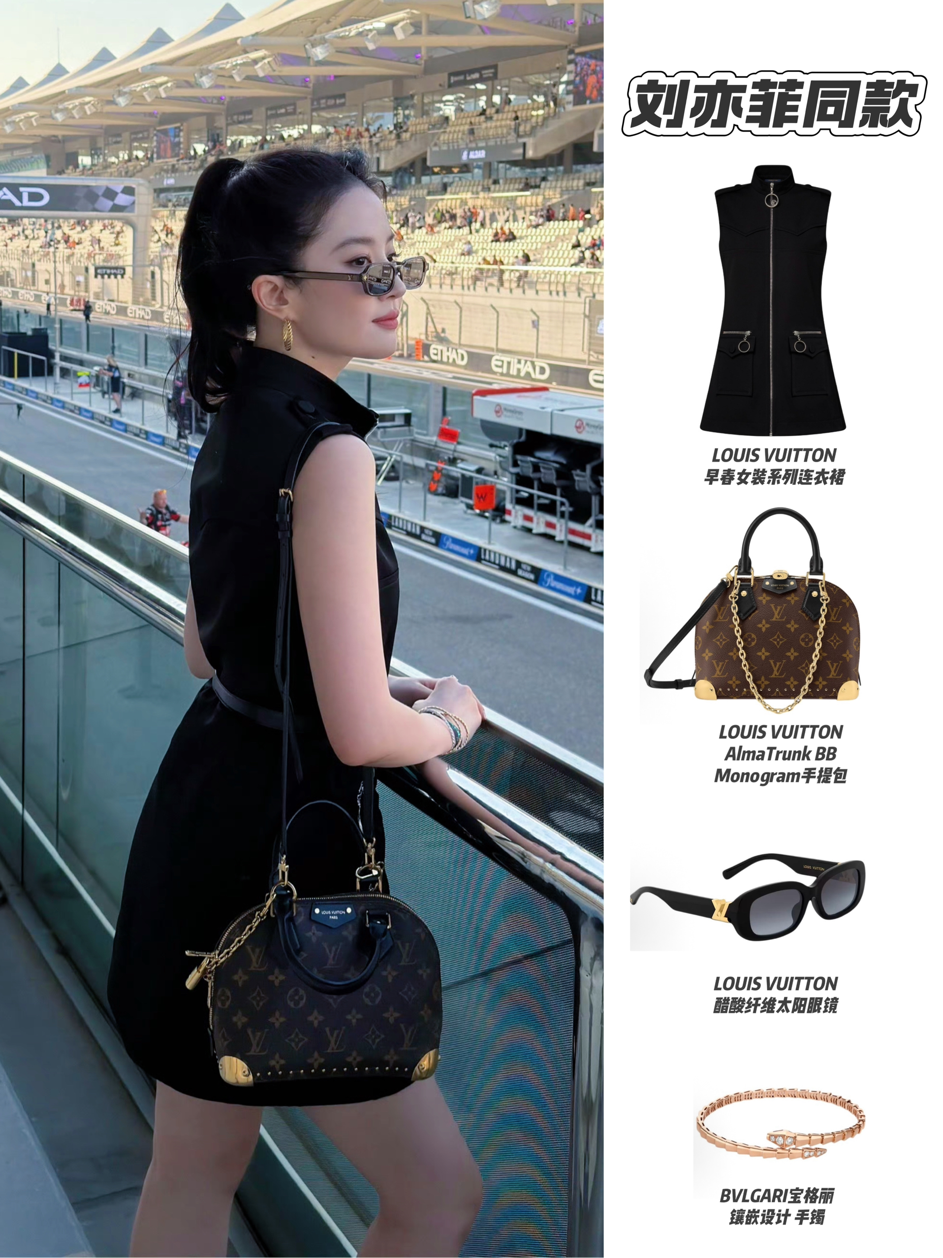 刘亦菲现身F1比赛现场,高马尾穿搭简约又高级 黑色无袖连衣裙利落修身,勾勒出优雅线条。搭配LV老花手提包和墨镜,精致感拉满,宝格丽手镯增添细节亮点。整体黑棕配色沉稳大气,既适合看赛的利落场合,又尽显刘亦菲的从容气质,是优雅与气场兼备的一套。