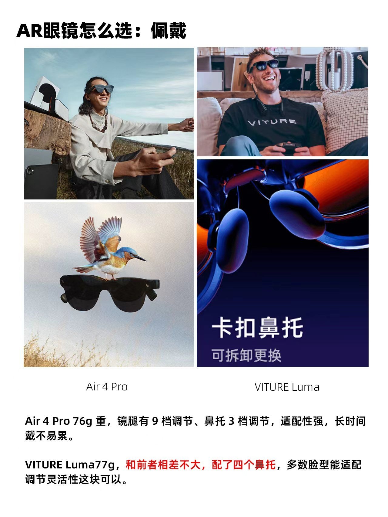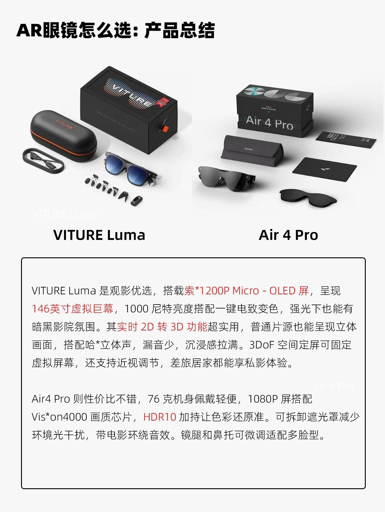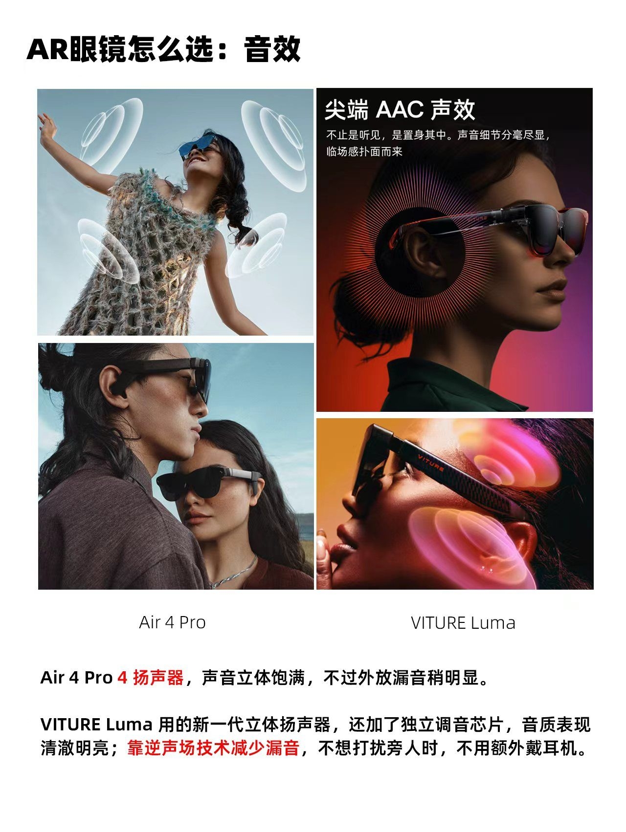 随时随地解锁巨幕观影?AR 眼镜选购不踩坑,先盯紧这 5 个关键指标 1、显示效果:优先选 1000P + 高分辨率 + 120 英寸以上巨幕,支持 HDR 更优;带「电致变色镜片」或高亮度(≥800 尼特),白天观影不用额外遮光。 2、音效体验:优先哈曼 / B&O 等品牌联名扬声器,注意看「防漏音技术」,避免打扰他人,立体音效更沉浸。 3、佩戴舒适度:重量控制在 80g 内,镜腿 / 鼻...
