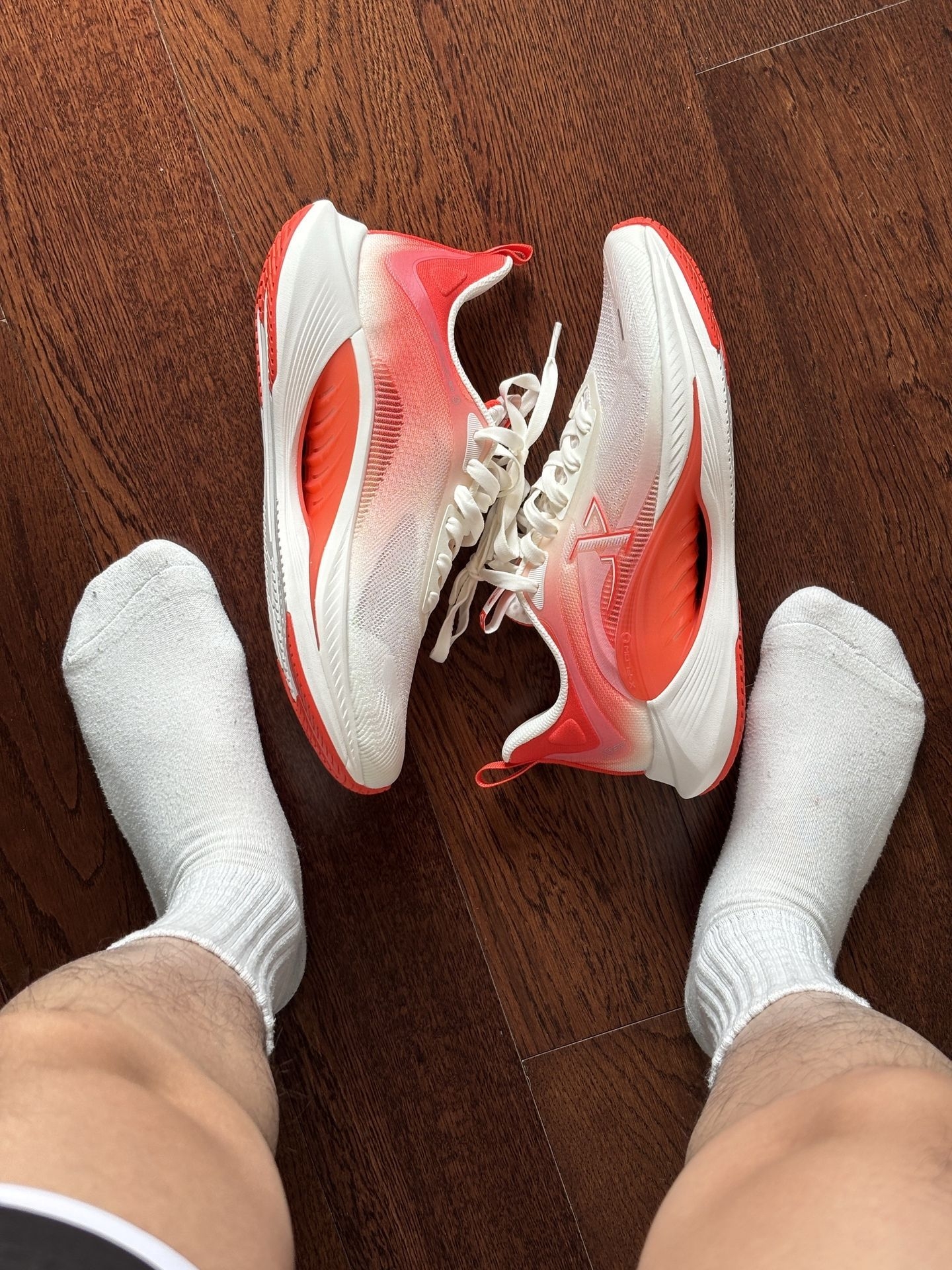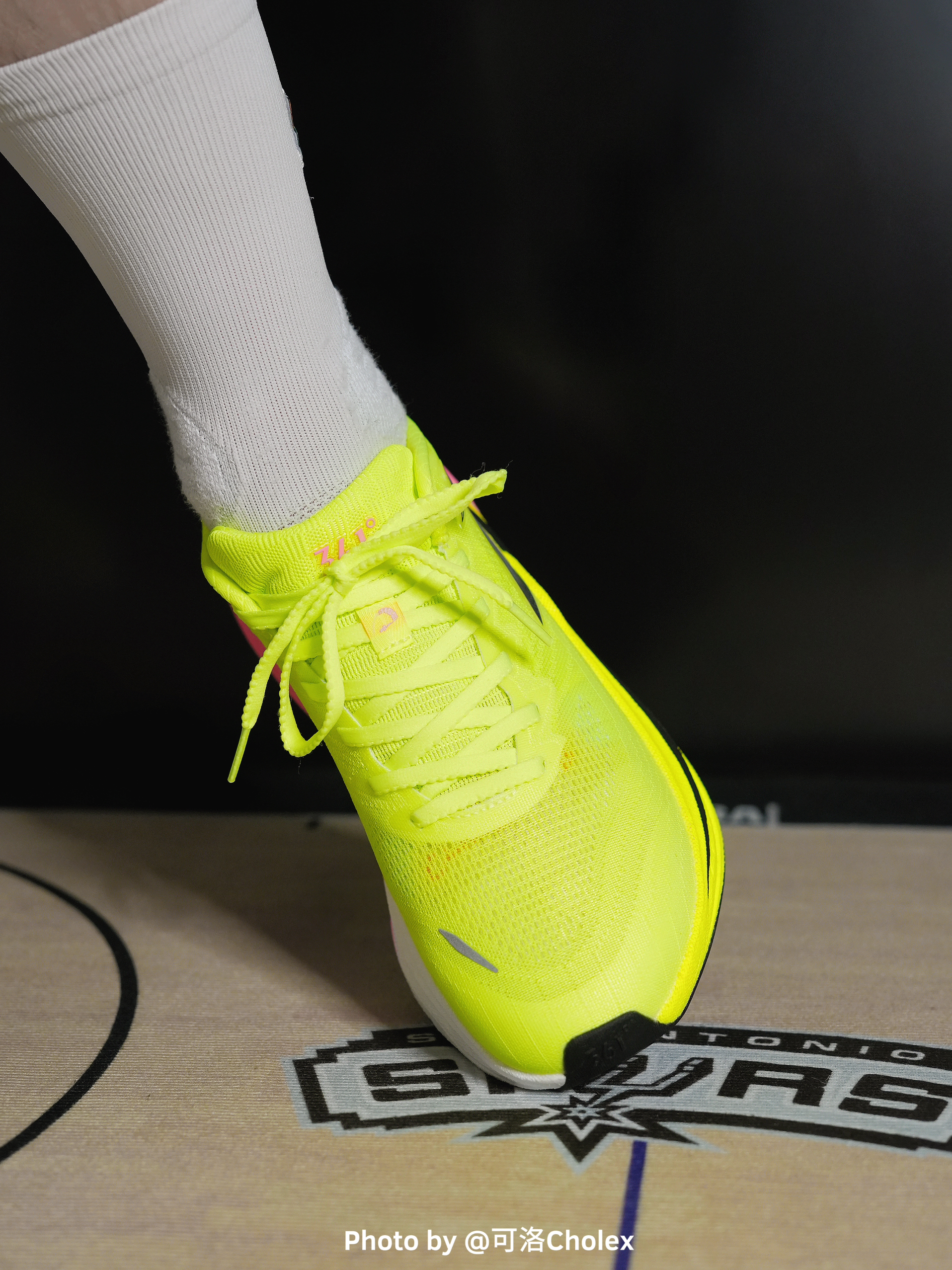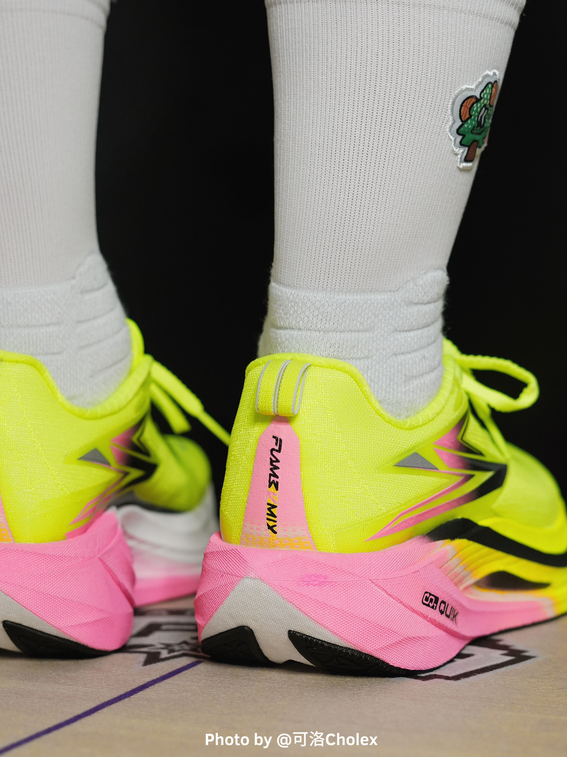 这双飞燃5 MIX的萤光黄粉撞色,我觉得特别亮眼,日常跑步或体测都很吸睛。低帮设计不磨脚踝,透气面料上脚不闷,长时间跑也舒服。 我喜欢它的碳板加持,迈步有轻微回弹感,减震效果挺不错,耐磨鞋底抓地也稳。男女同款版型百搭,我认为正常码购入就合适,训练或体考穿都靠谱~