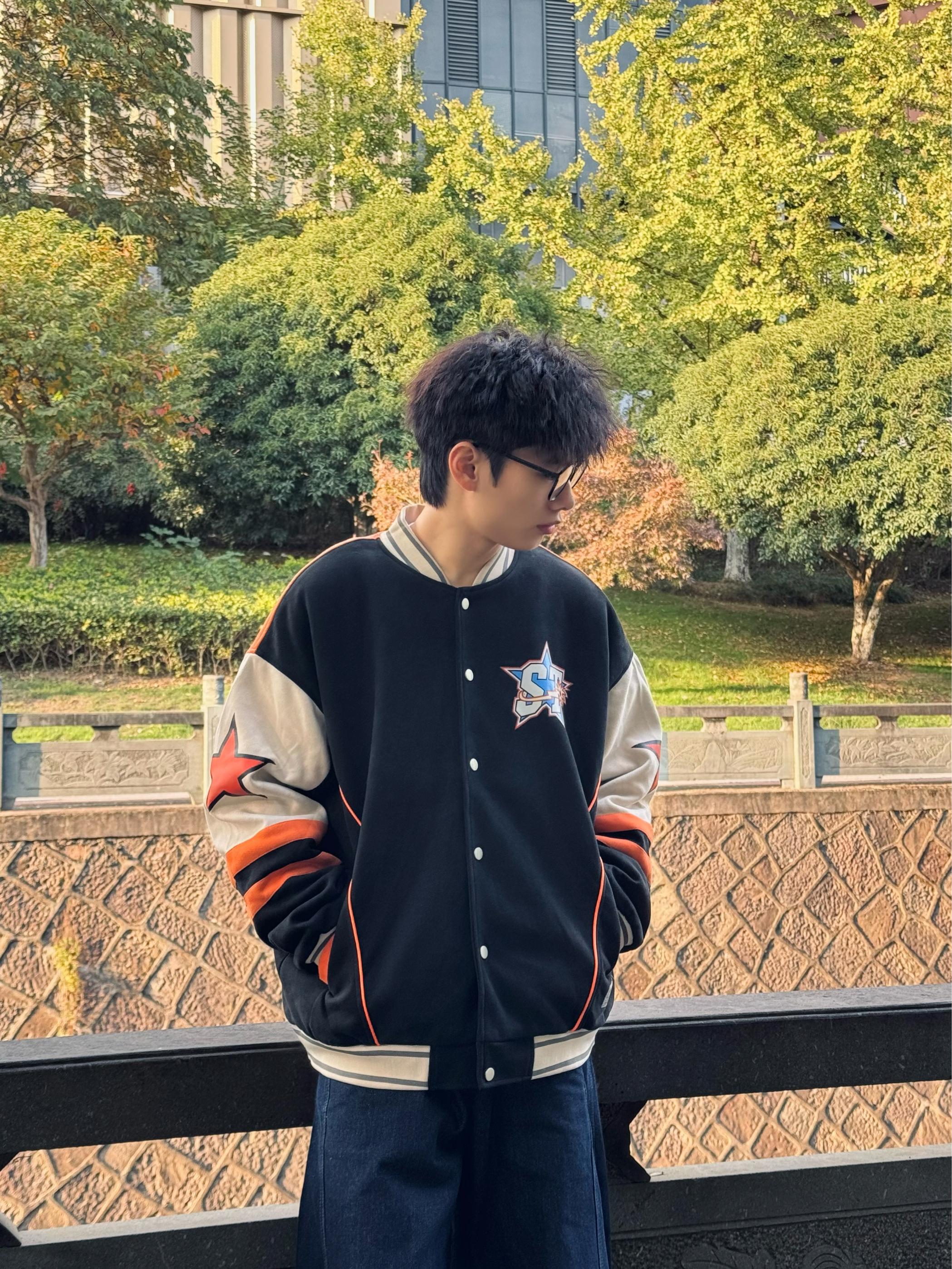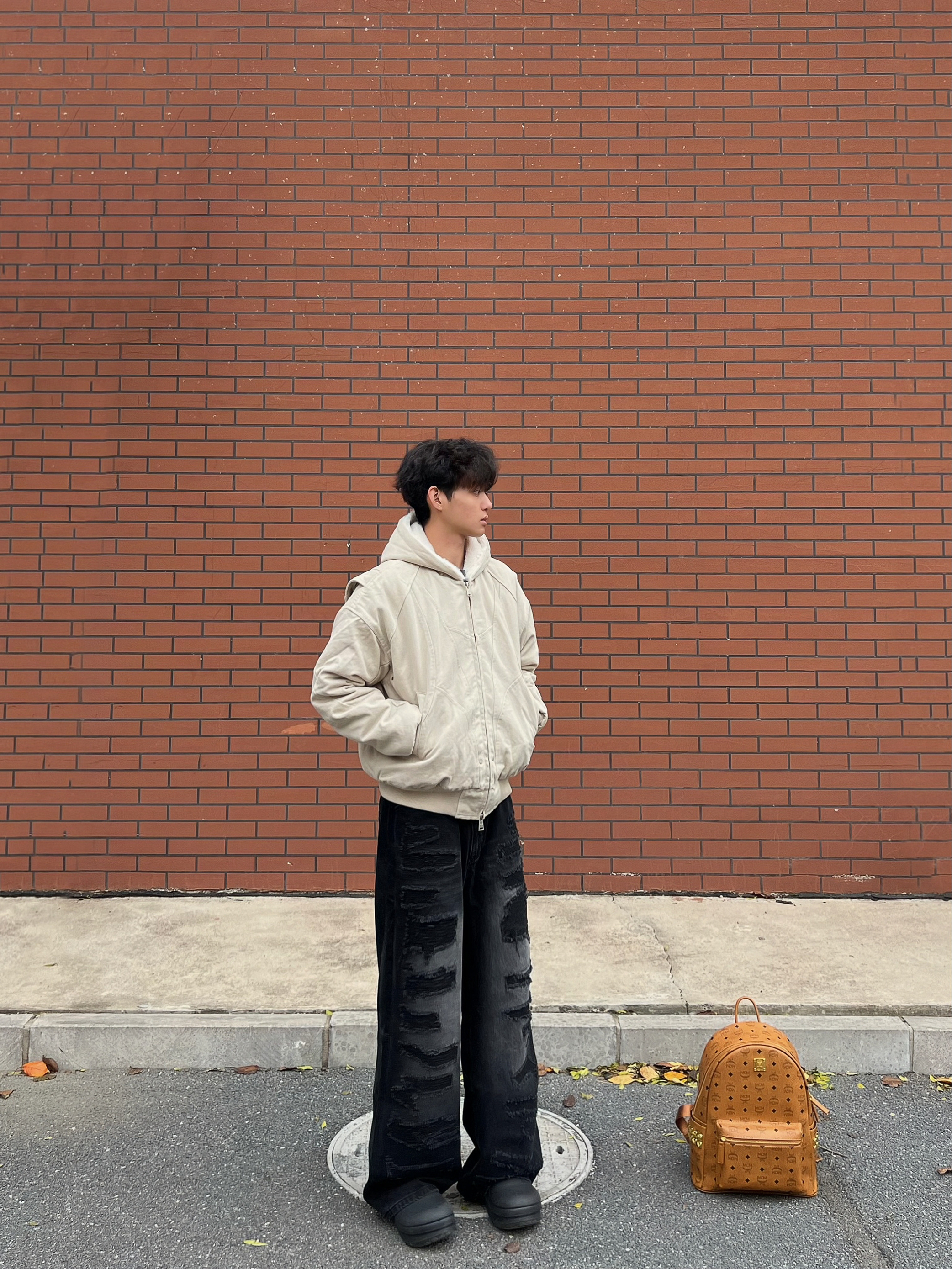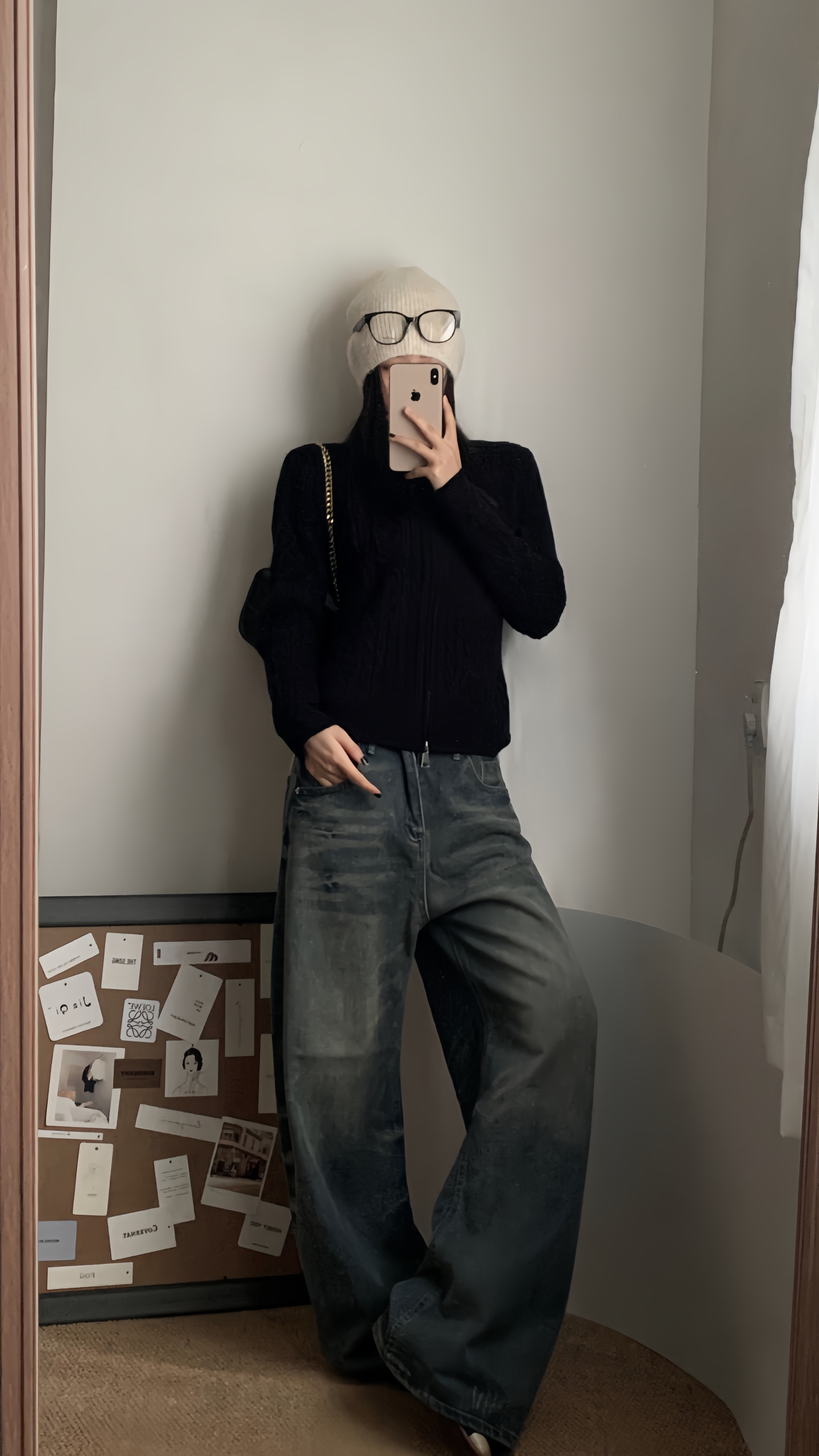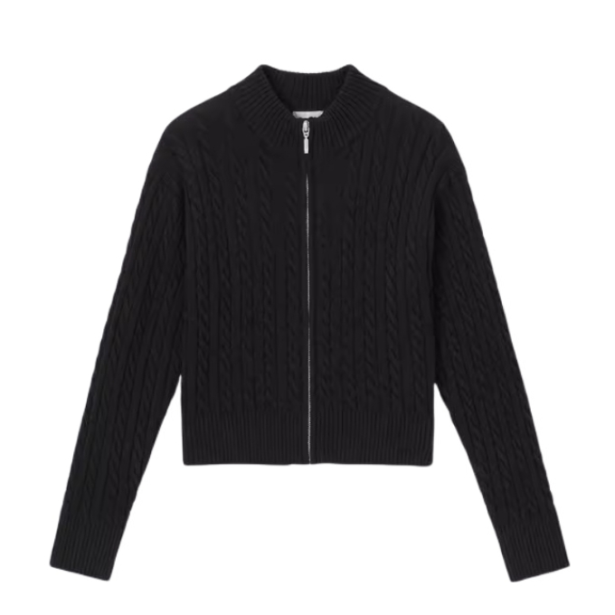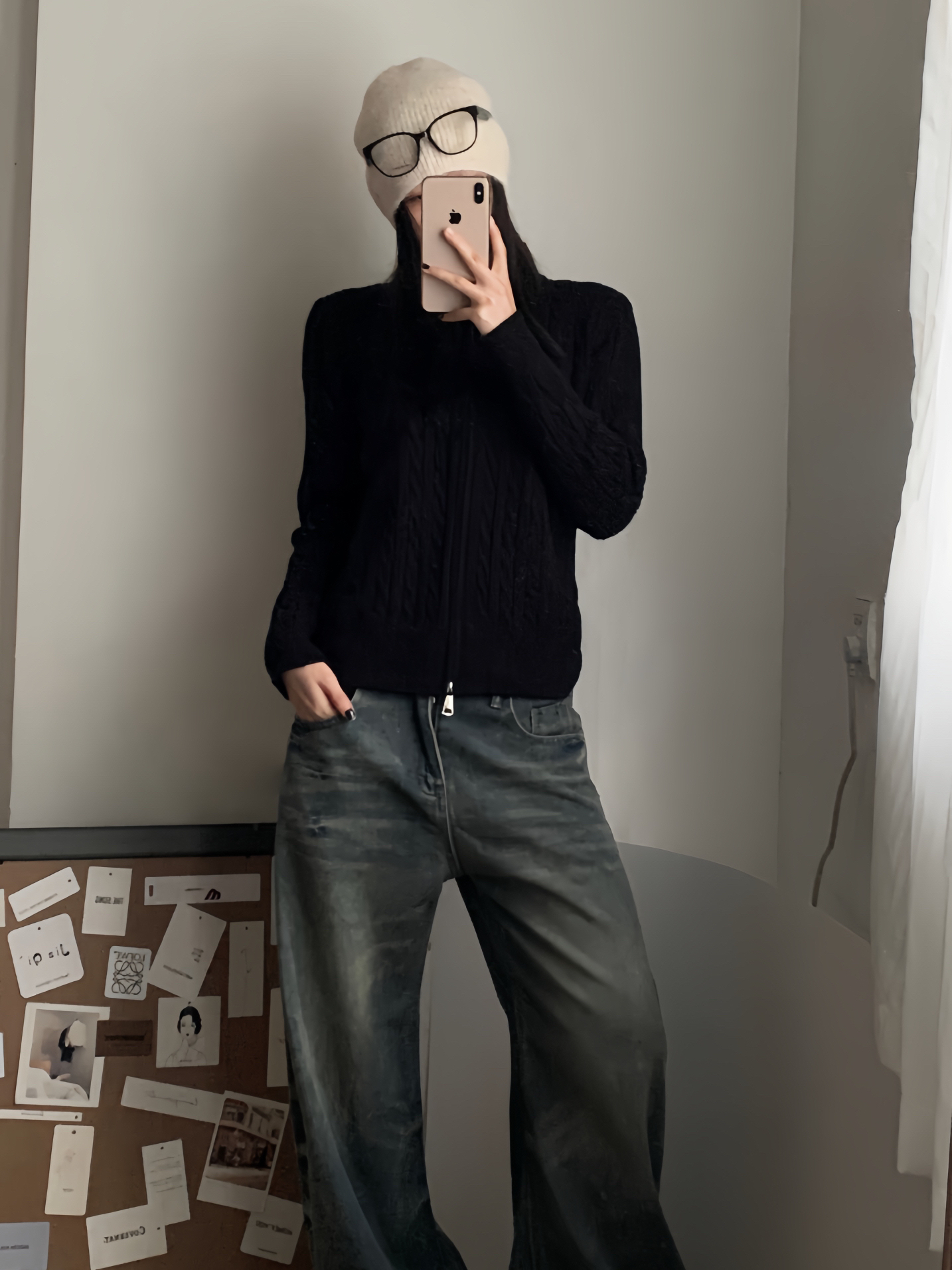 黑色绞花针织开衫自带复古纹理,软乎乎的但版型利落,半拉链设计能随心情调领口氛围; 配一条做旧灰调阔腿牛仔,宽松裤型裹满舒适感,上紧下松刚好把比例拿捏得很舒服; 再搭个米白针织帽+眼镜,冷调里掺点温柔,日常出门随手一穿就很出片~
