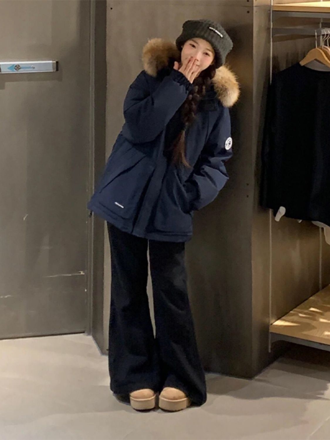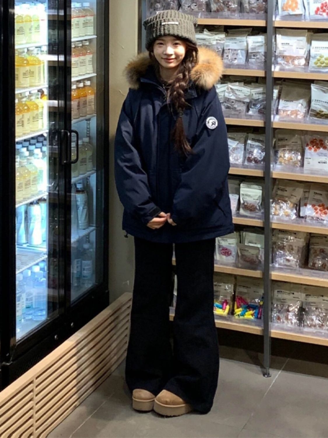 这套穿搭走的是韩系休闲风,藏蓝色派克棉服自带冬日氛围感,毛领设计增加了温暖感和层次感,搭配同色系阔腿裤顺色显高挑,厚底雪地靴又添了几分慵懒随性,整体配色沉稳又不沉闷,宽松版型对身材包容度高,日常出街舒适又时髦,简约中透着巧思。