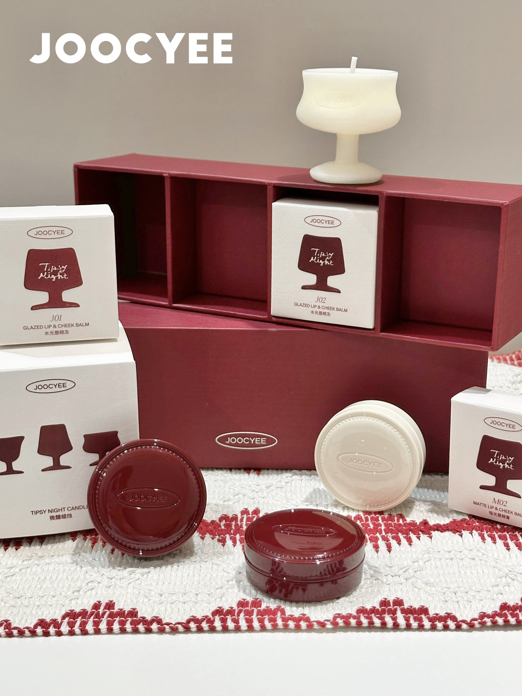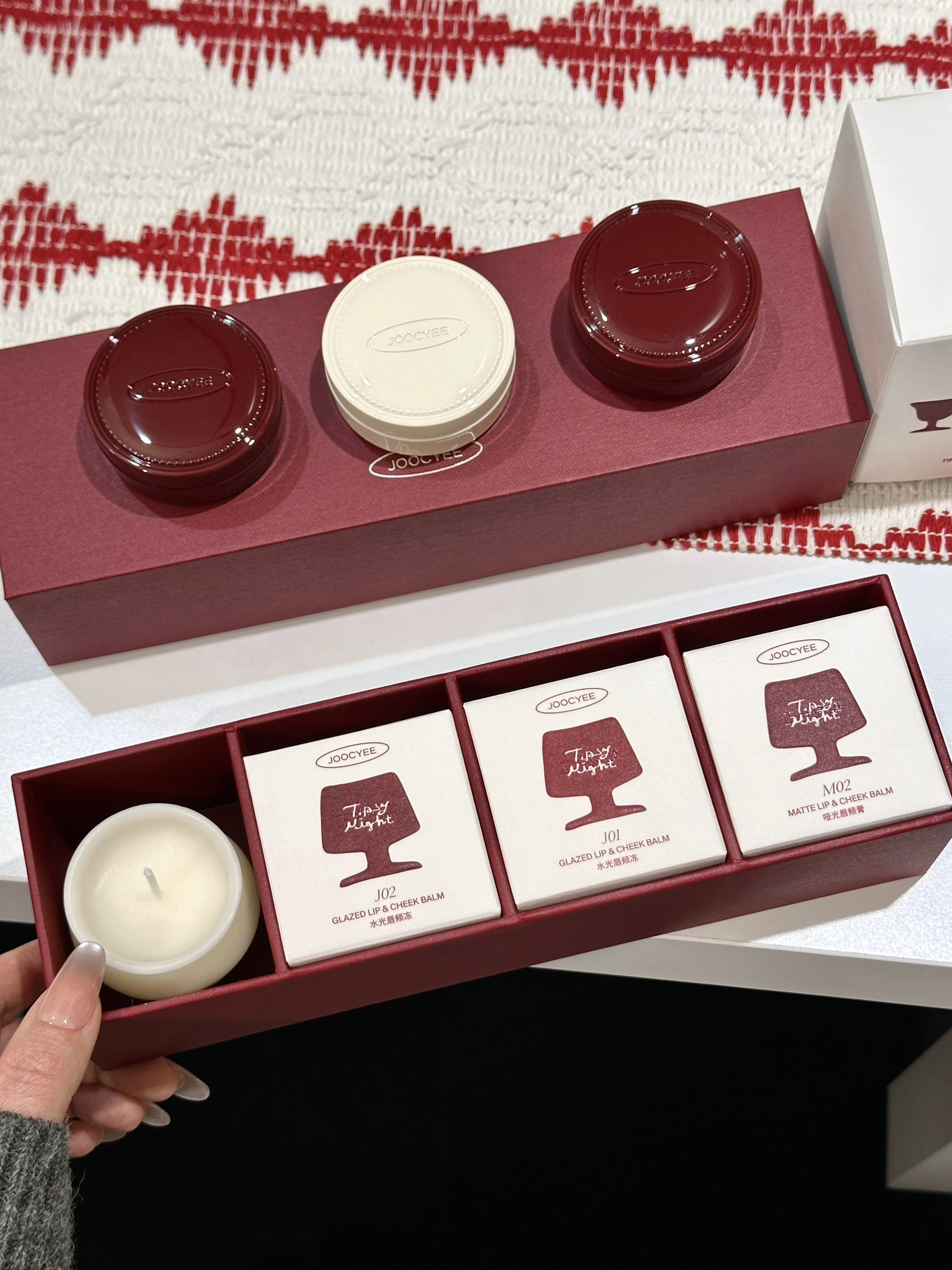 酵色你怎么这么会整活哇! 今年的圣诞限定【正好微醺】尊嘟好美~ 复古酒红色礼盒里有三个色号:J01+J02+M02 两块唇颊冻和一块唇颊膏 可以一次get水光和柔雾质地 我个人偏喜欢的是J01 很适合我这种淡人 还有一支酒杯造型的香薰蜡烛 泰Q啦! 应该没有女孩子能拒绝这个吧~