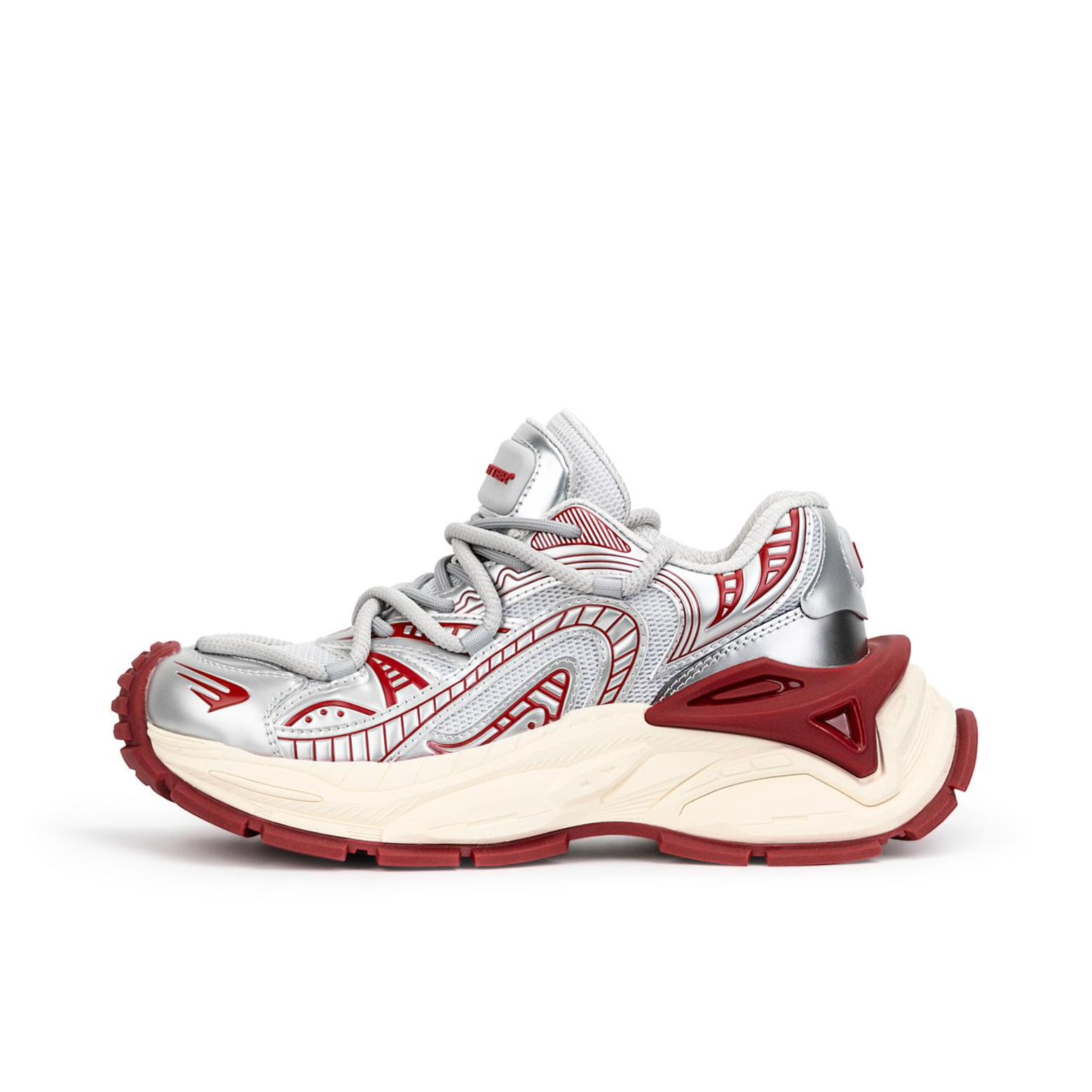 这这这…. 机能风银红老爹鞋帅麻了啊 比较浮夸的外观真的引起我的注意 双层鞋带和双层鞋舌叠加非常有设计感很前卫 侧身红色的纹路和红色的搭底点缀 不单调 看起来憨实的鞋身其实穿脚上还挺不错的没有沉重感 脚感软乎乎的还有个5cm的增高