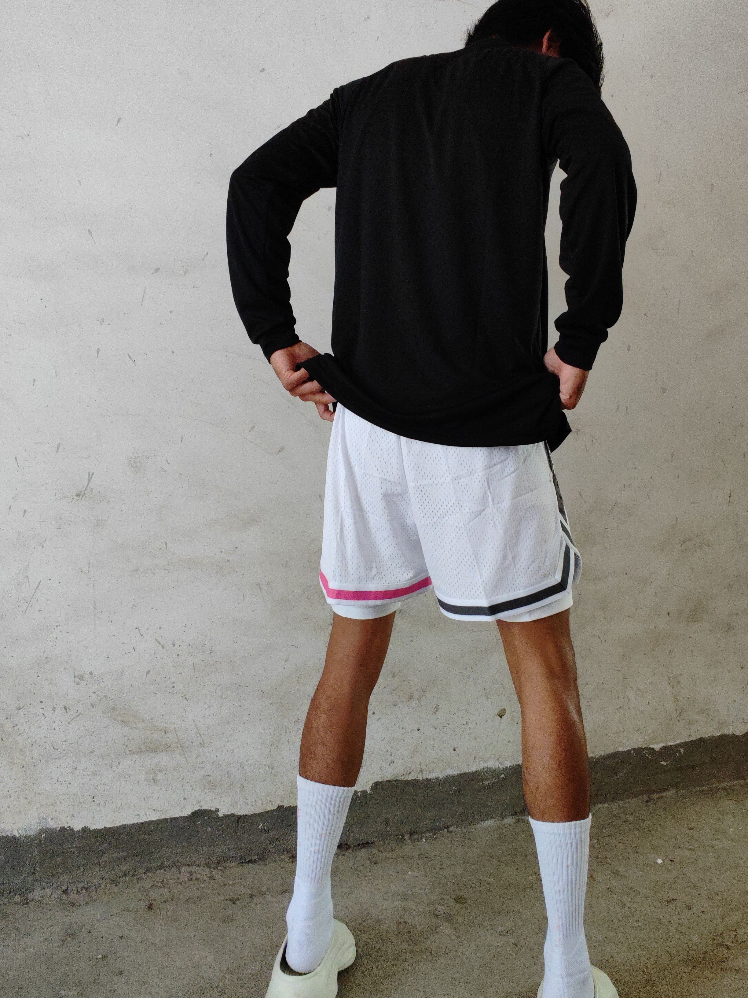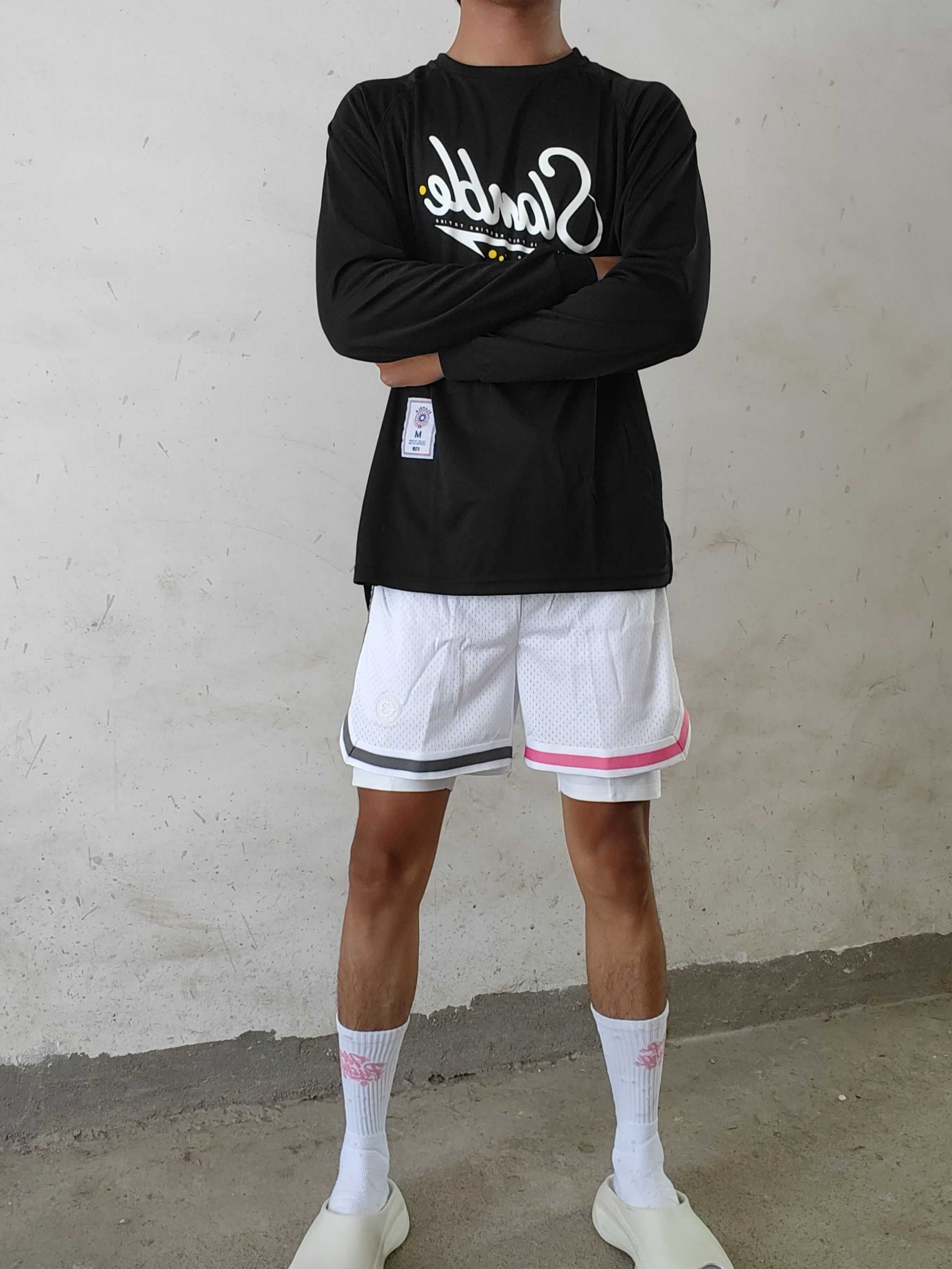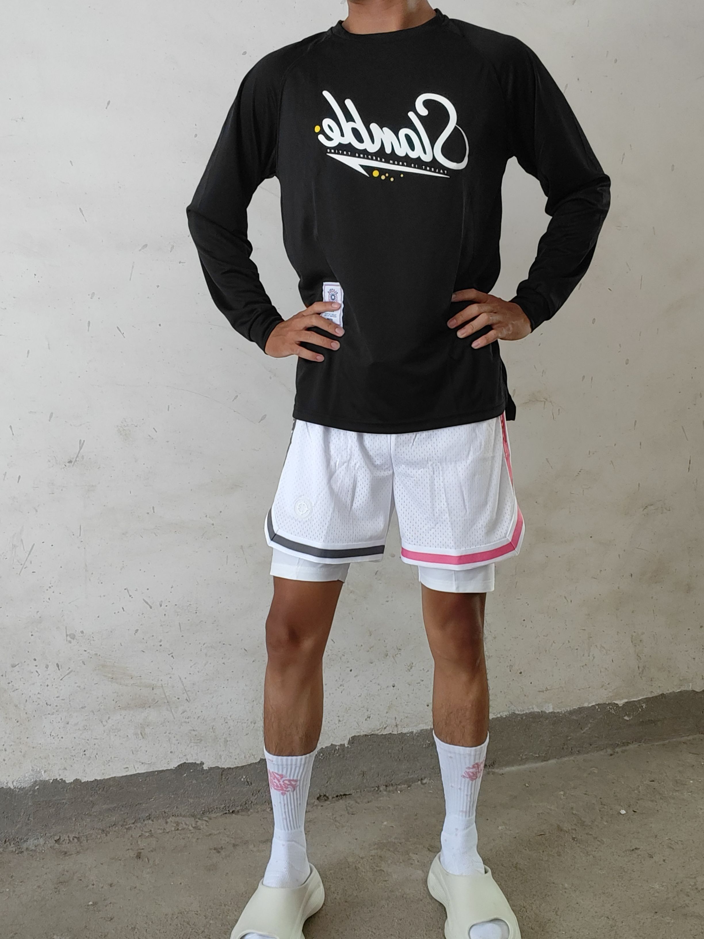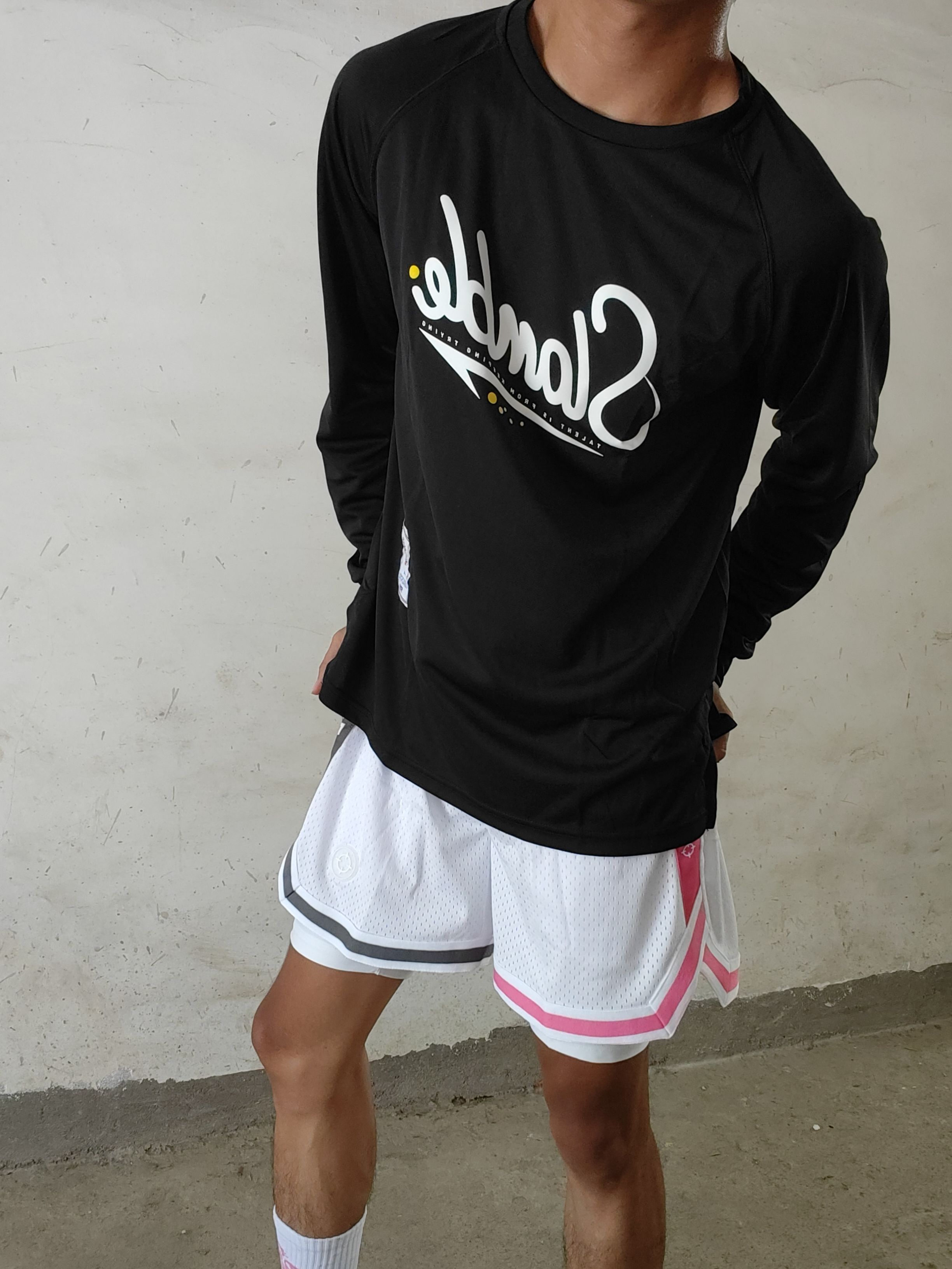 今天穿的是slamble的黑色投篮服。首先材质是速干材质,布料很透气,不会闷汗,穿着打了一个小时的球,出了汗也不会黏腻在身上,风一吹就能干,而且弹性也很好,穿着做大幅度的动作也不会觉得束缚,感兴趣的兄弟们可以试试。
