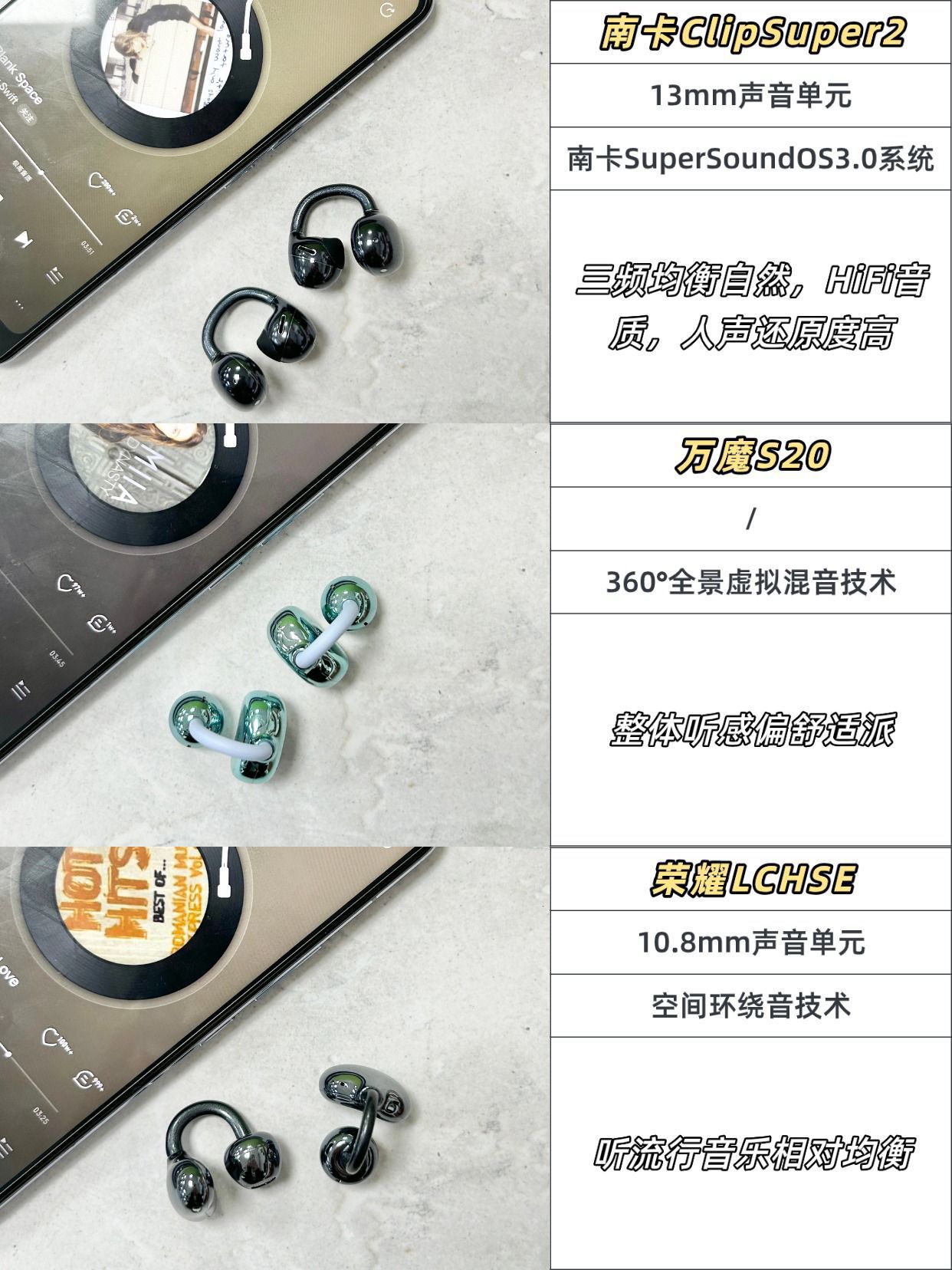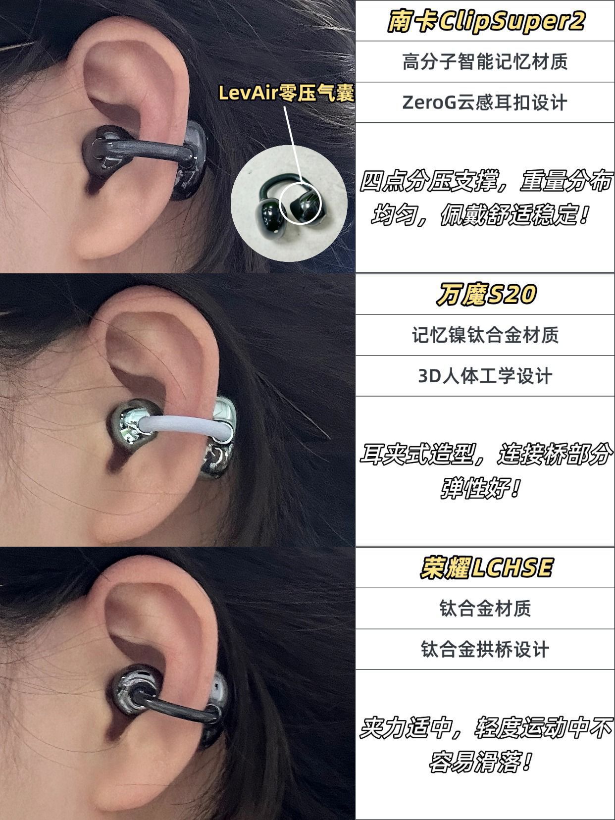 耳夹式耳机哪个品牌好?百元耳夹式耳机测评分享 我感觉耳夹式耳机这种千人千面,还得自己买回来试过才知道适不适合自己,自己入手了这三款耳机,都有7天无理由,各戴了一天通勤,跟大家分享一下我的感受! 1.南卡ClipSuper2(¥399) 很轻戴着很舒服,没有夹耳感,跟眼镜一起带也不会打架。而且也很稳,挤地铁的时候也没掉过,在地铁上的收音也不错,50%的音量也可以听得很清楚了,在公司也不会漏音,续...