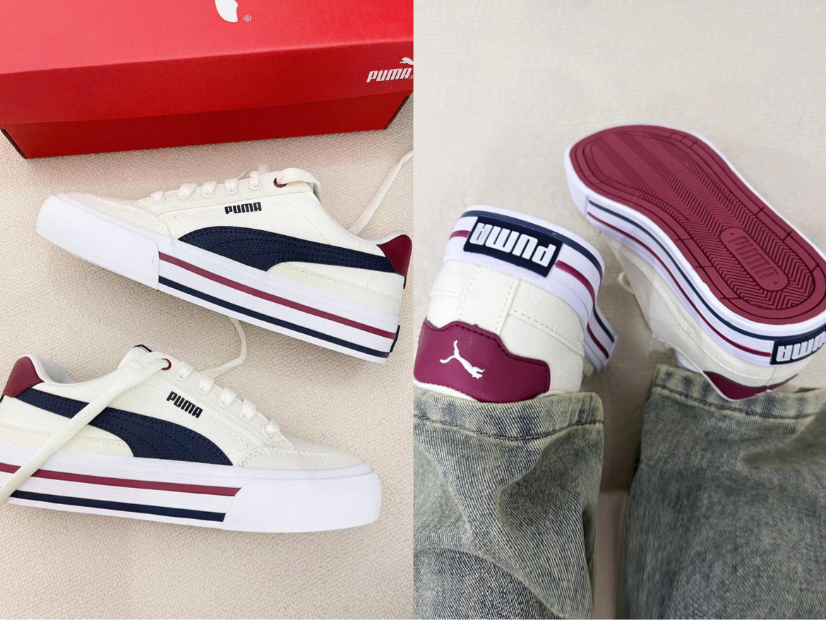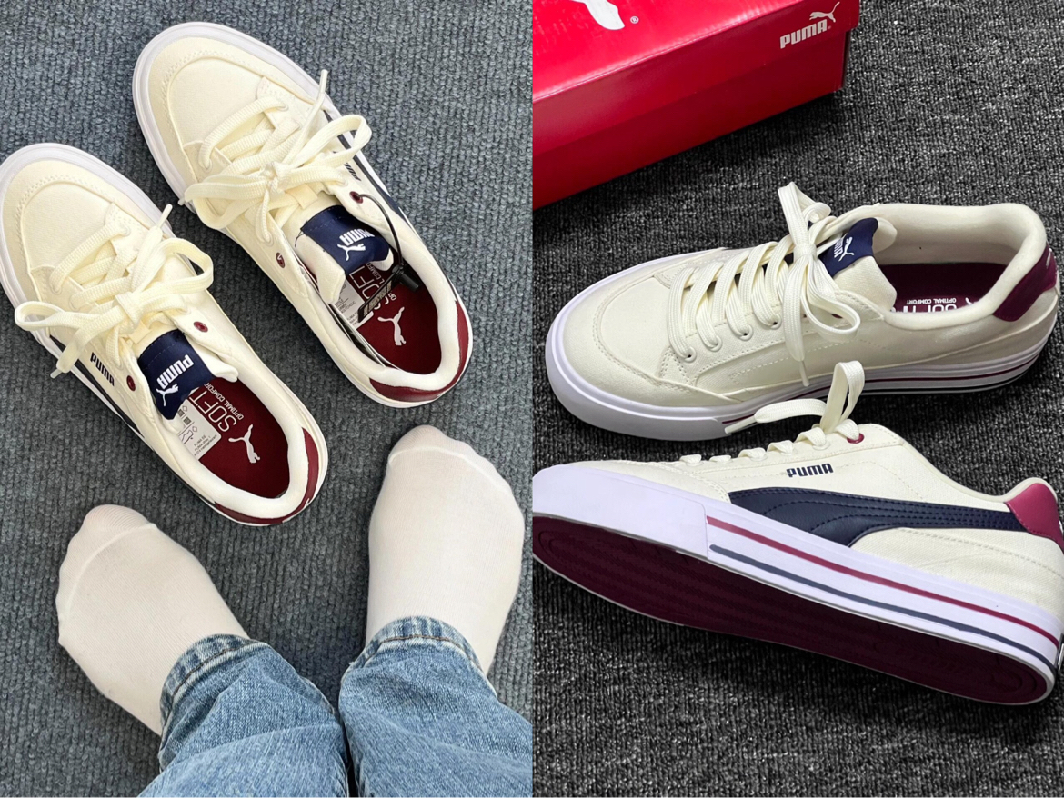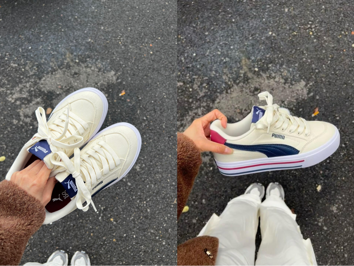新入的 PUMA 帆布鞋,米白配酒红、藏青,复古感拉满。帆布材质透气,上脚轻盈,日常配牛仔裤、短裙都适配。鞋型偏窄,宽脚穿久了会有点挤。整体是很有腔调的一双鞋,复古女孩可入~