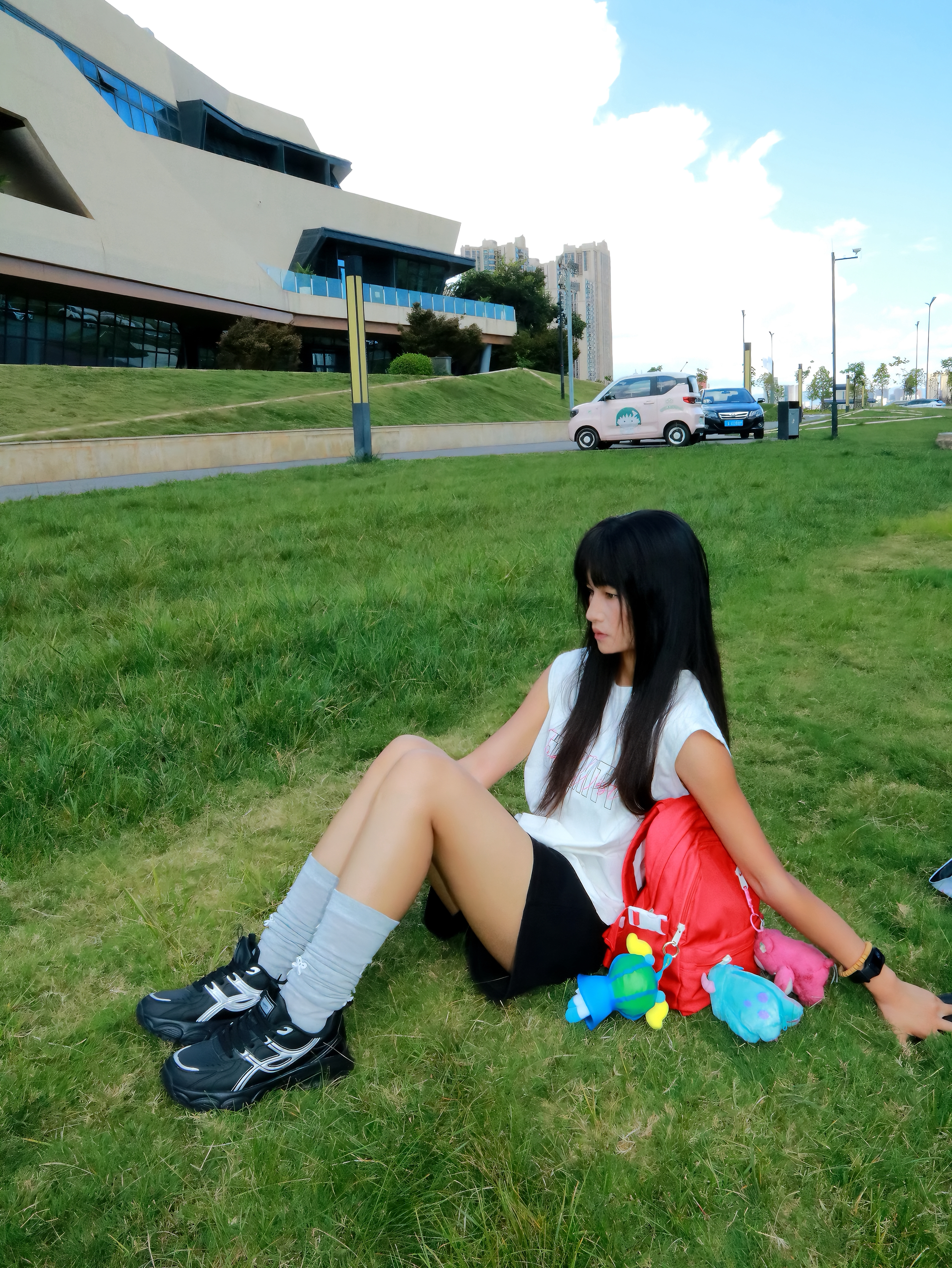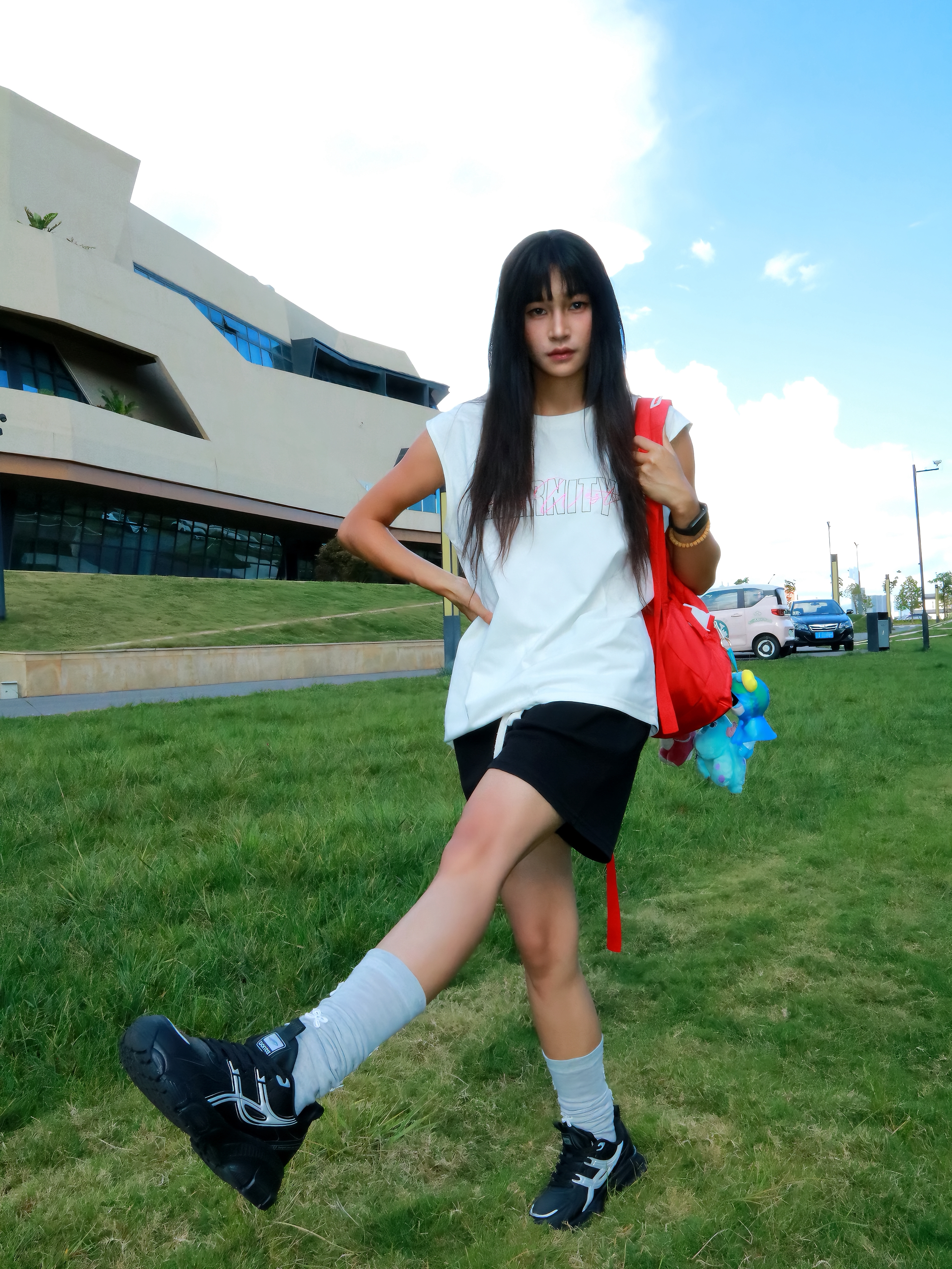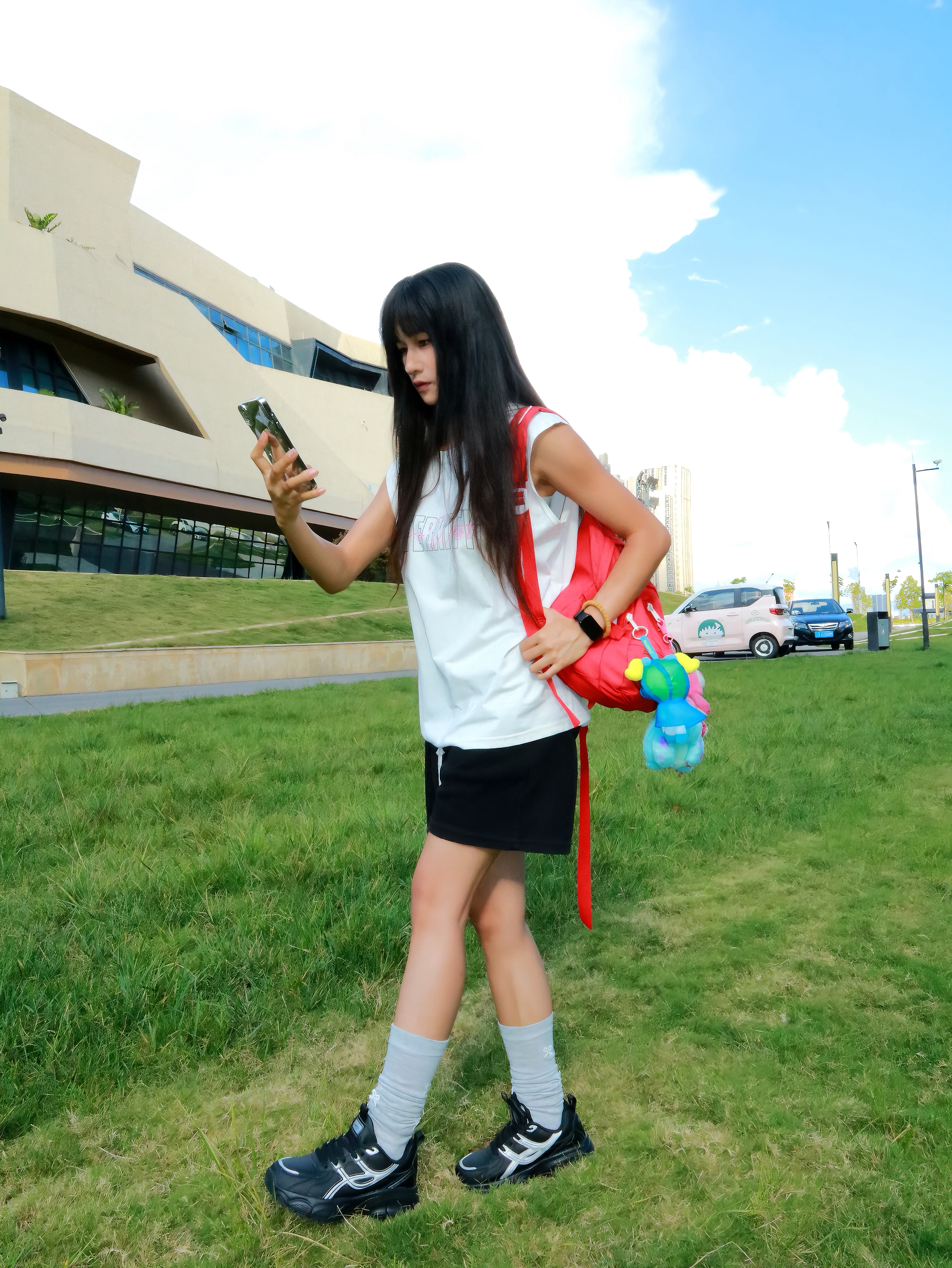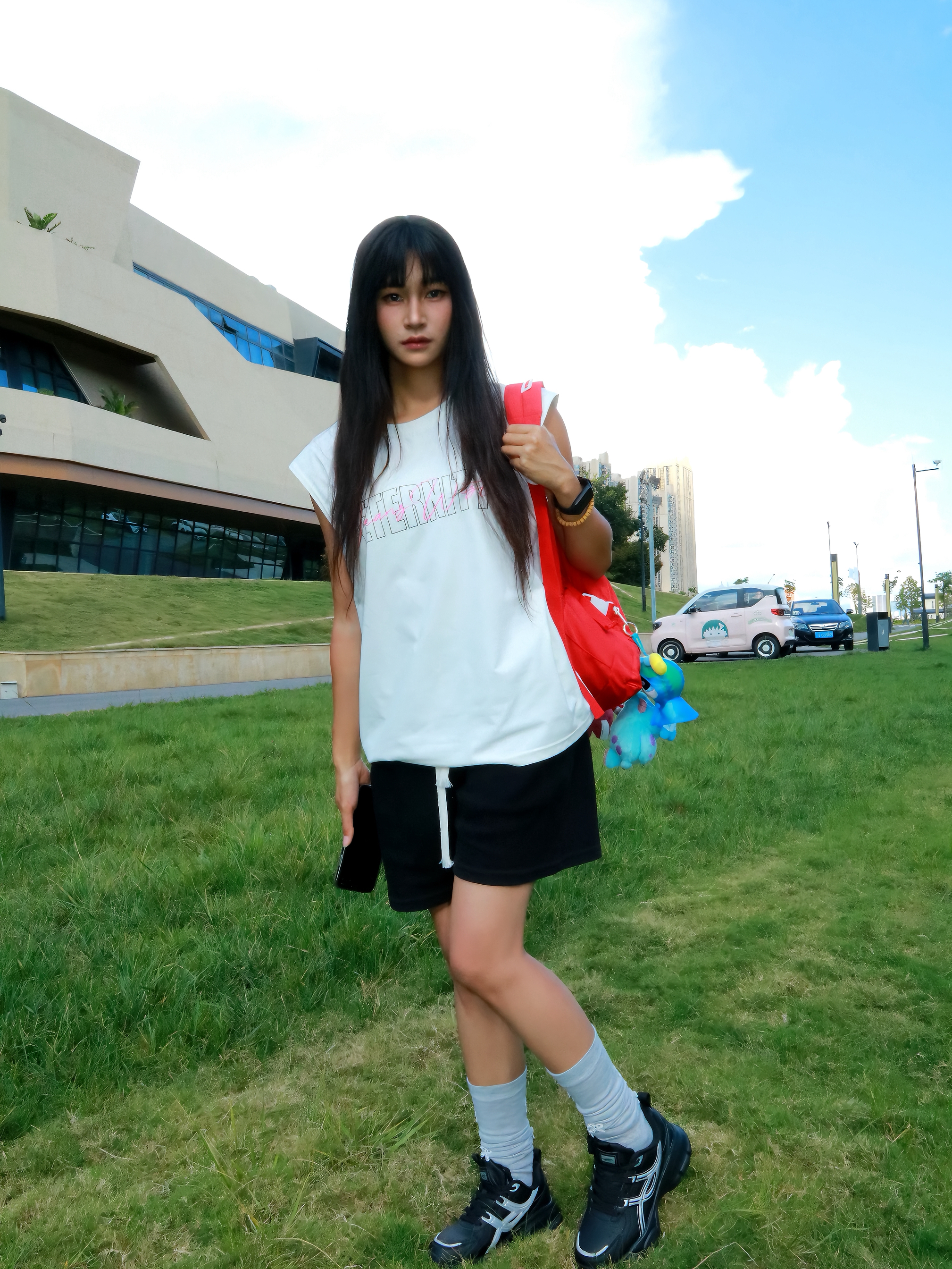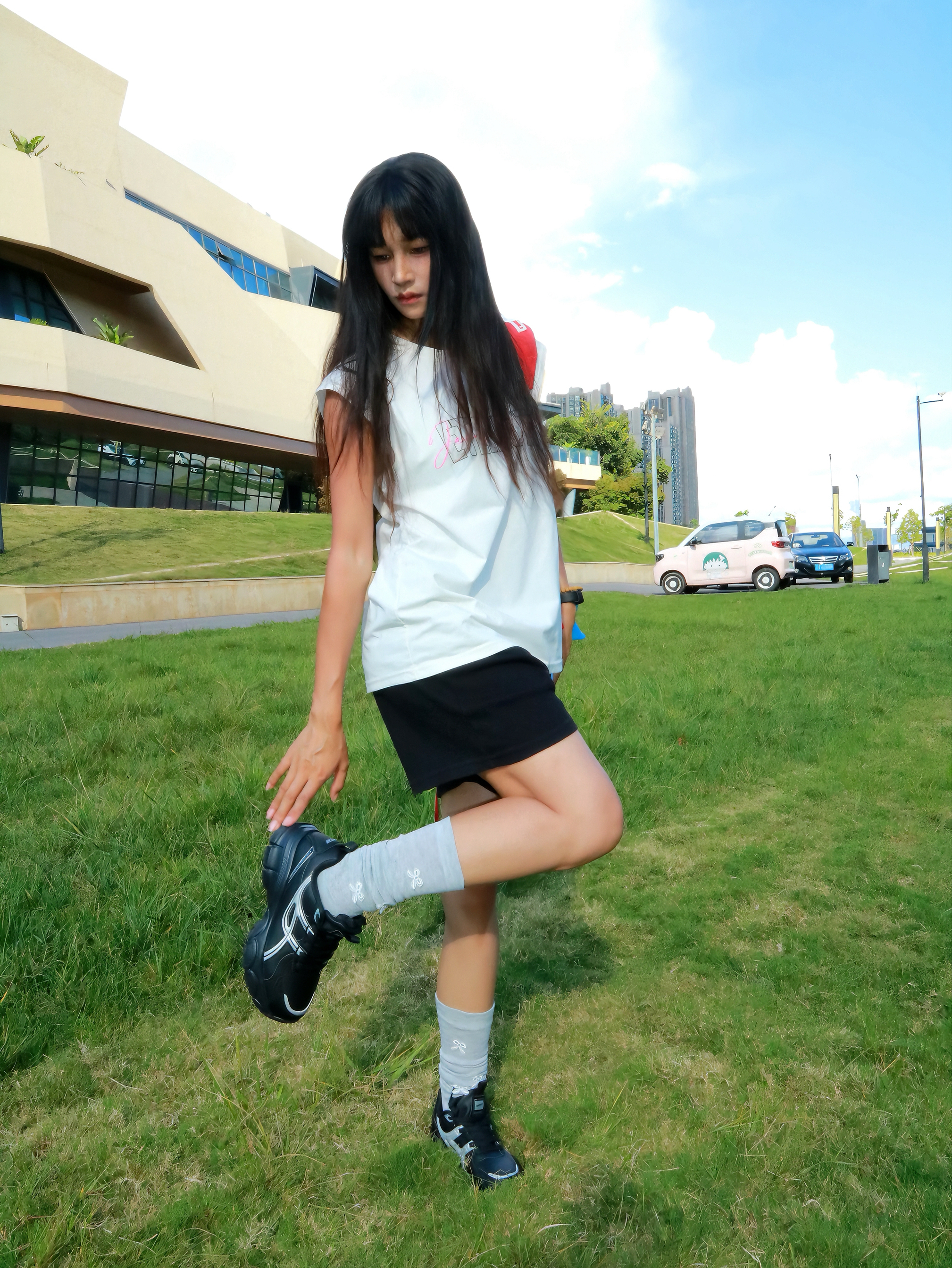 今日份课后ootd 下课后感觉累累的 刚好教室后面有草坪 也是和朋友一起来散散步放松一下 今天主要是以休闲感为主 白色坎肩搭配运动老爹鞋 鞋子整体还是比较轻便的不重 我穿起来感觉鞋头比较宽松舒适感也不错 感觉散步运动之类的穿也是可以的