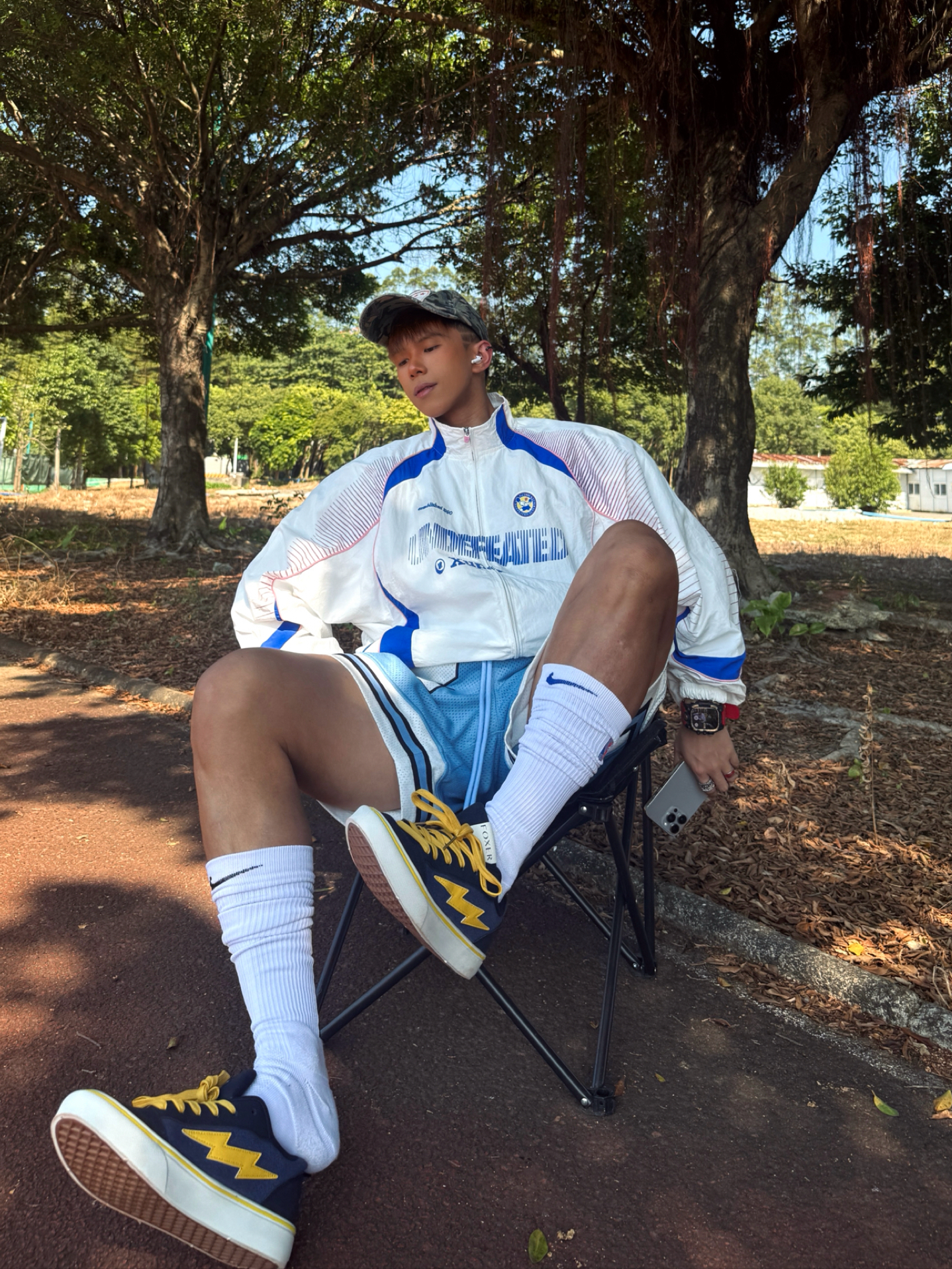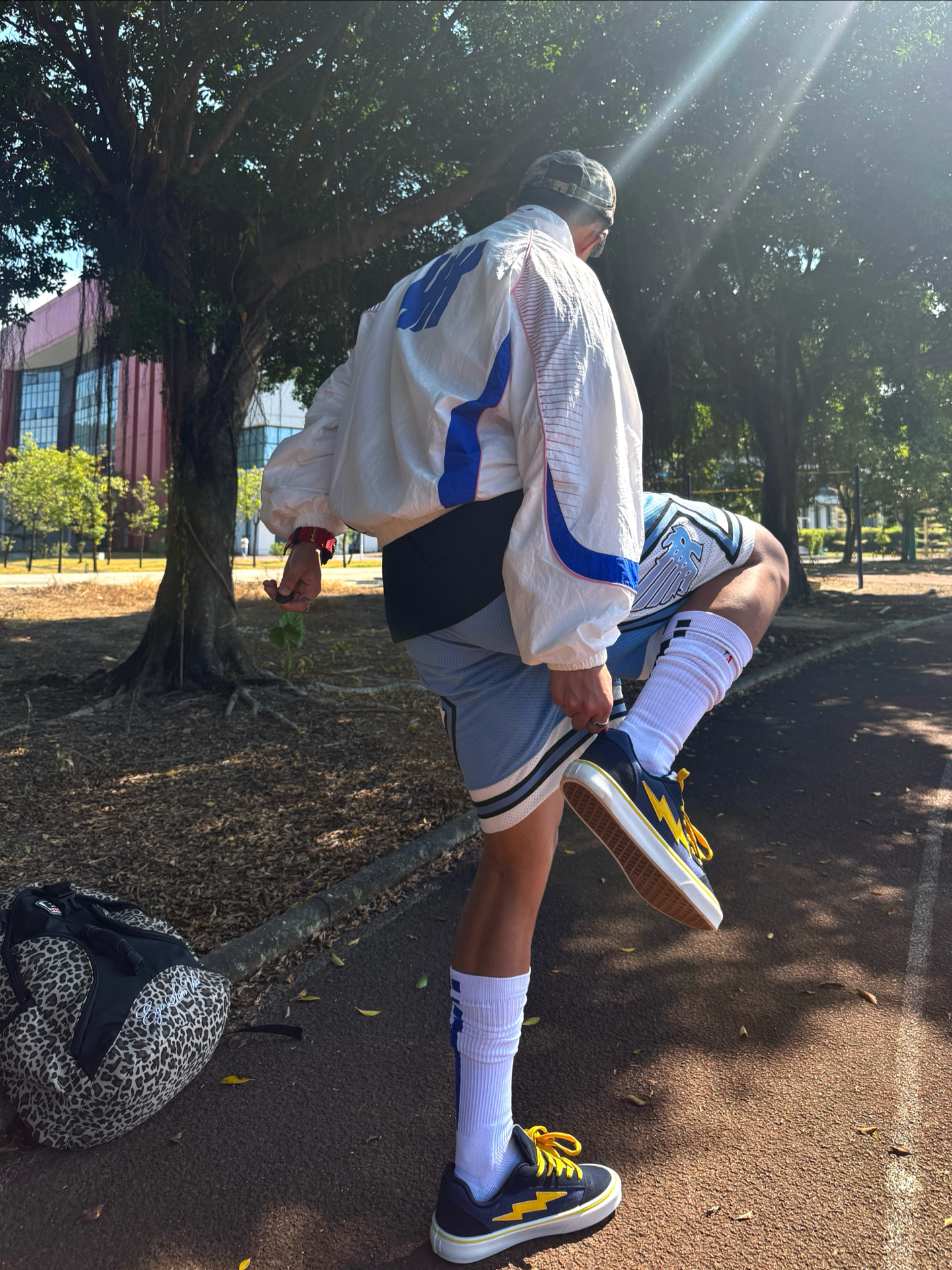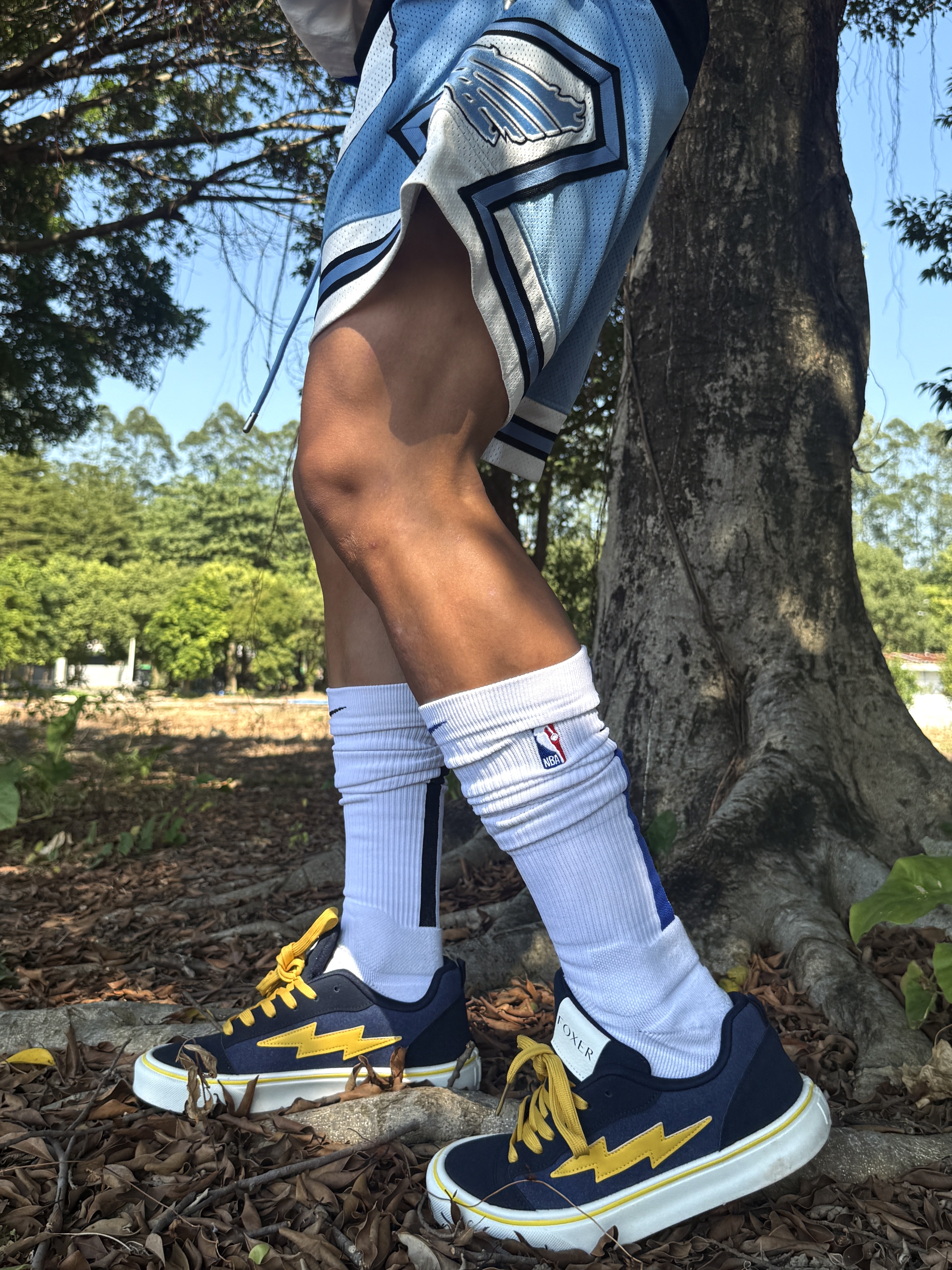 Hey bro‼️这里是小熊的穿搭日记 今天的颜色主题围绕blue进行💙 白蓝拼色夹克➕天蓝篮球短裤 撞色线条+品牌标识强化街头感 超长筒白袜+板鞋的下半身组合既修饰腿型又清爽 👟上脚这双联名款闪电板鞋 藏青+亮黄复古撞色拿捏 鞋侧闪电标美式街头味儿超冲⚡️ 轻便耐磨的脚感让我在户外走一下午都不累脚🚶🏻♂️ 不论是搭运动装还是日常通勤都很match 学生党/通勤族都可闭眼冲~ 你们觉得...