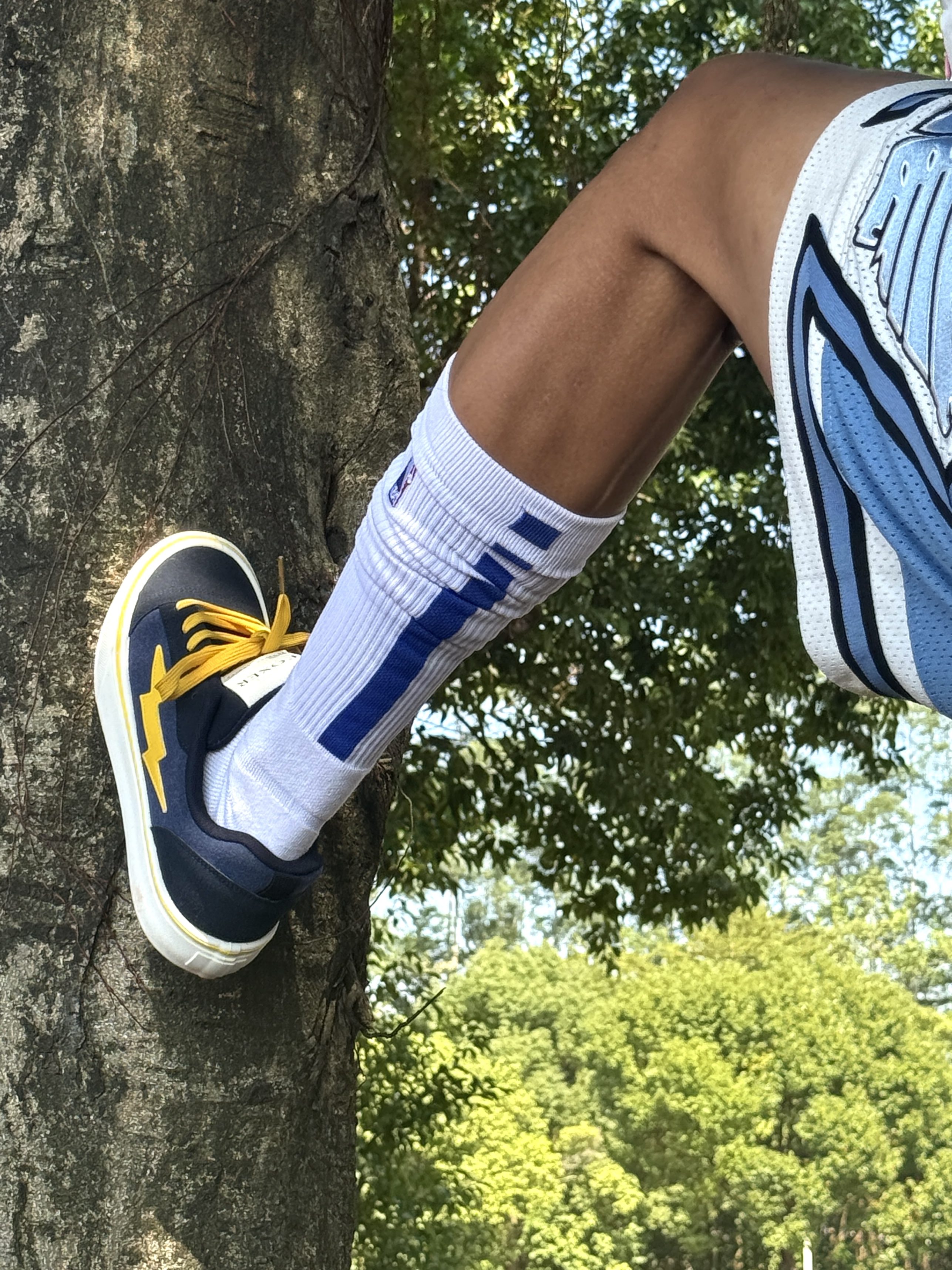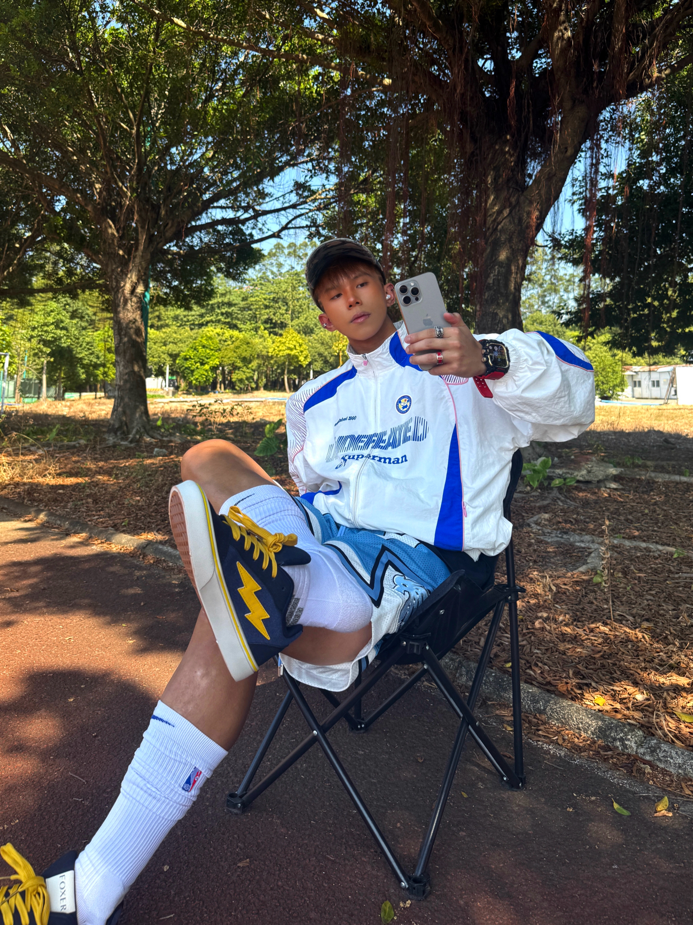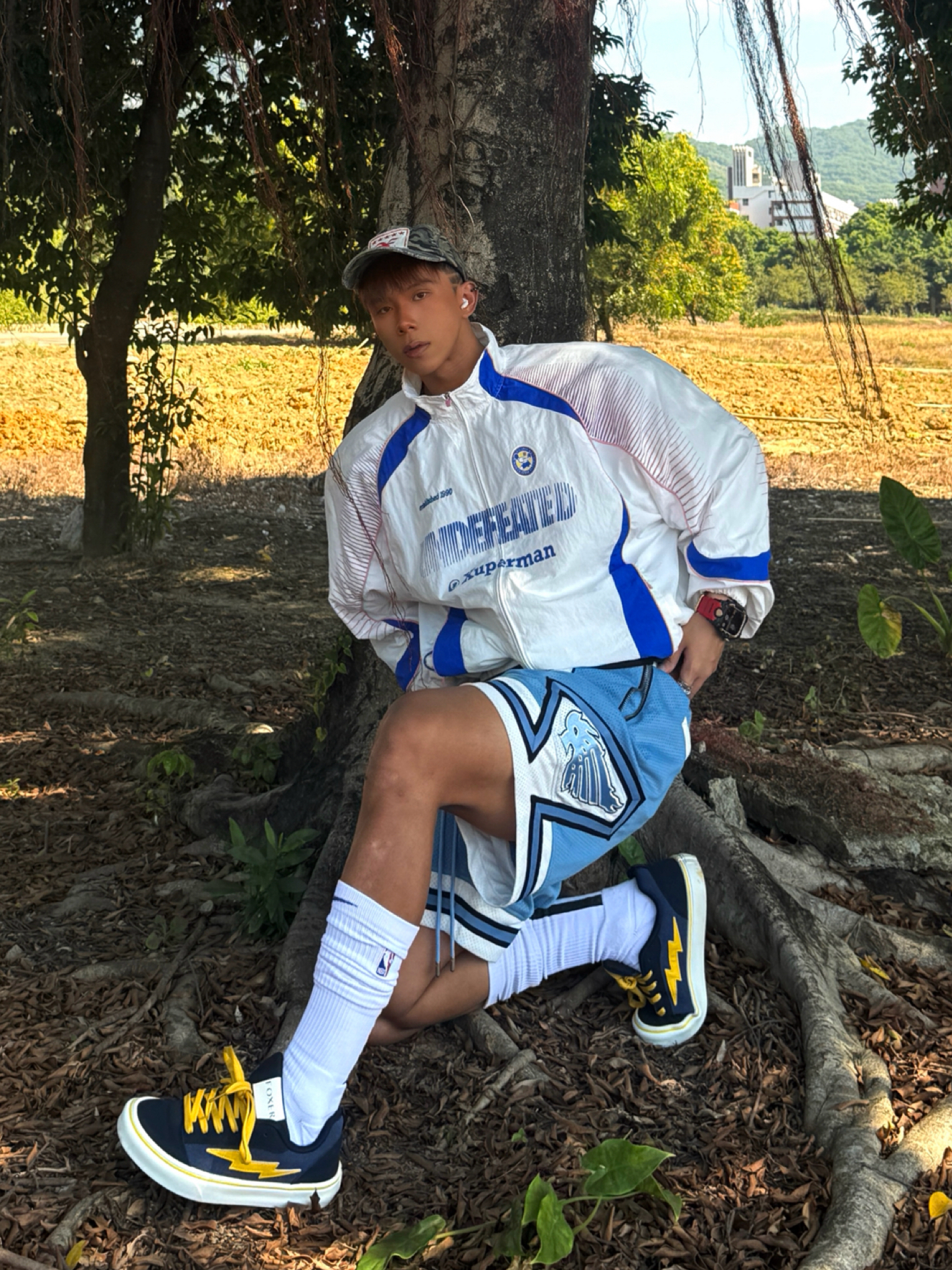 Hey bro‼️这里是小熊的穿搭日记 今天的颜色主题围绕blue进行💙 白蓝拼色夹克➕天蓝篮球短裤 撞色线条+品牌标识强化街头感 超长筒白袜+板鞋的下半身组合既修饰腿型又清爽 👟上脚这双联名款闪电板鞋 藏青+亮黄复古撞色拿捏 鞋侧闪电标美式街头味儿超冲⚡️ 轻便耐磨的脚感让我在户外走一下午都不累脚🚶🏻♂️ 不论是搭运动装还是日常通勤都很match 学生党/通勤族都可闭眼冲~ 你们觉得...