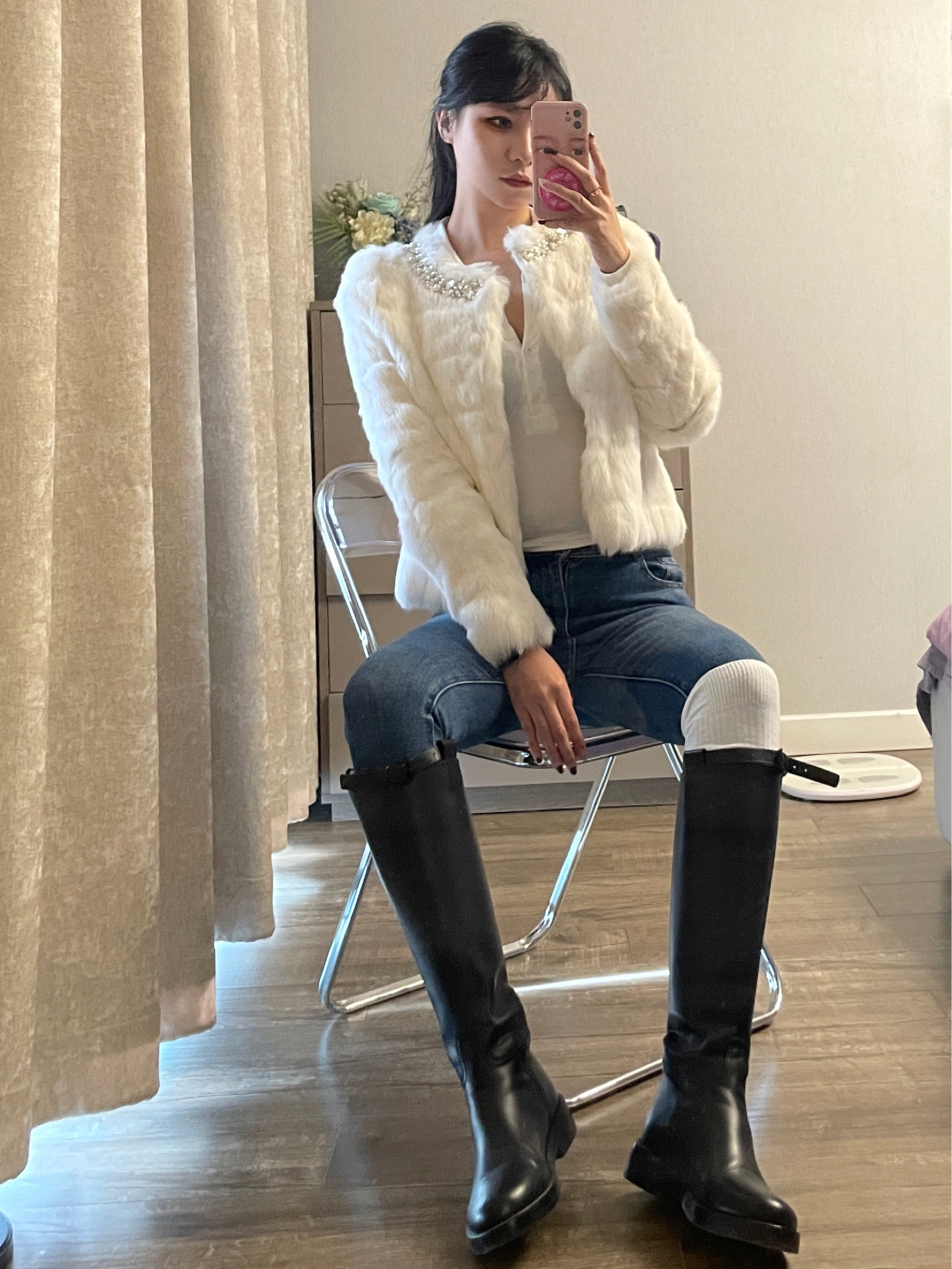 白色皮草搭配紧身牛仔裤和黑色过膝靴 一整个冬日氛围拿捏住啦~