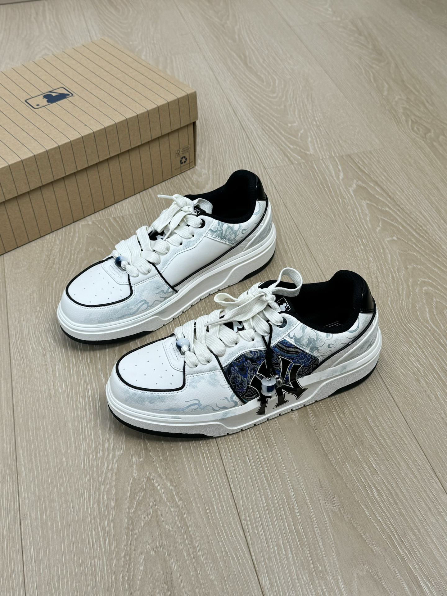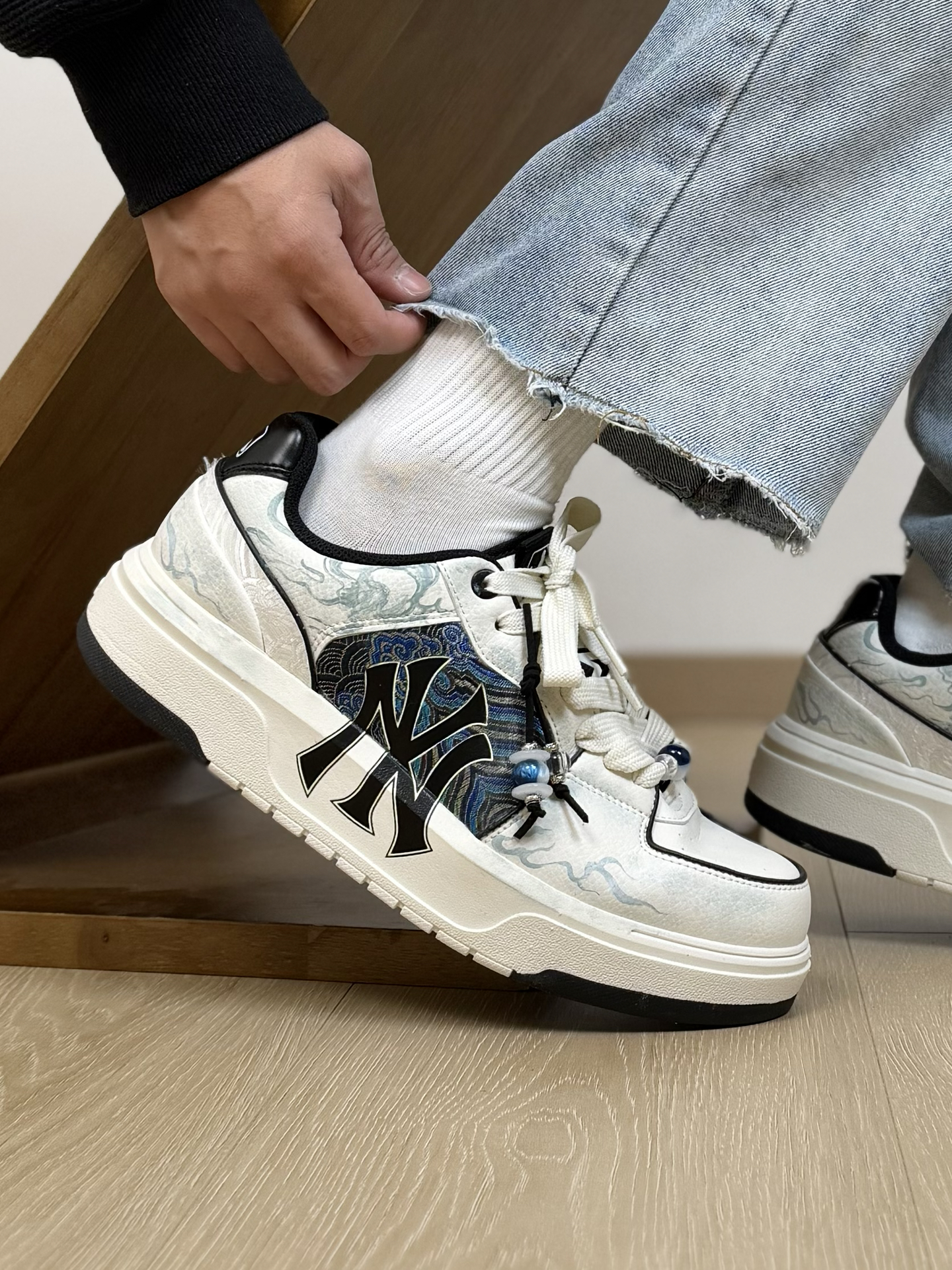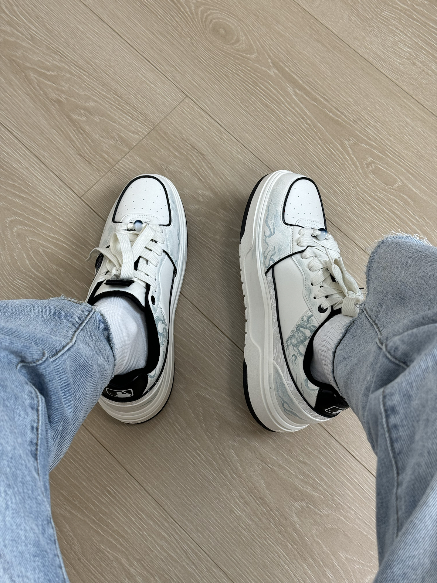 分享一双我觉得很适合通勤 而且特别有个性的一双MLB板鞋~ 虽然鞋身远看就是简约的黑白配色 其实细节做的很丰富 侧面像海流一样的抽象纹理 鞋带上还有一个小挂坠 设计上我觉得还是很用心的 重点是上脚真的好穿 蛮舒适的 而且还挺增高的 日常随便搭条牛仔裤就很好看 尺码我穿起来刚好合适 不偏码的 大家可以参考一下 #坡跟复古回潮 #韩系入冬穿这双 #鞋帽选对赢一半 #2025年年度鞋王 #万花弄
