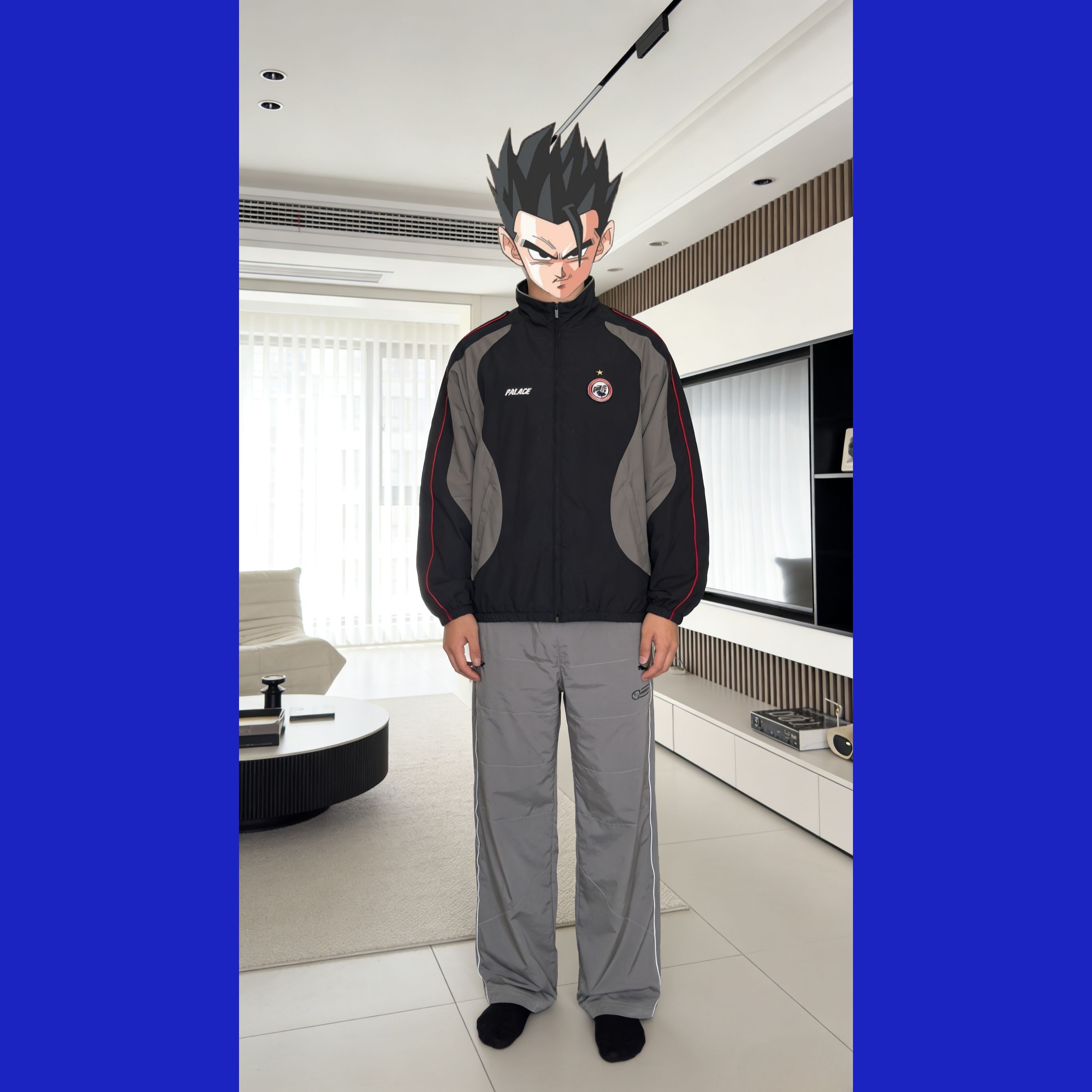 上衣:PALACE SS25 Drop7 PRO TEAM PALCO SHELL JACKET 胸前圆形logo图案拼接长袖夹克外套 男女同款 裤子:PUMA彪马 630135舒适亲肤柔软百搭休闲裤 男款 灰色