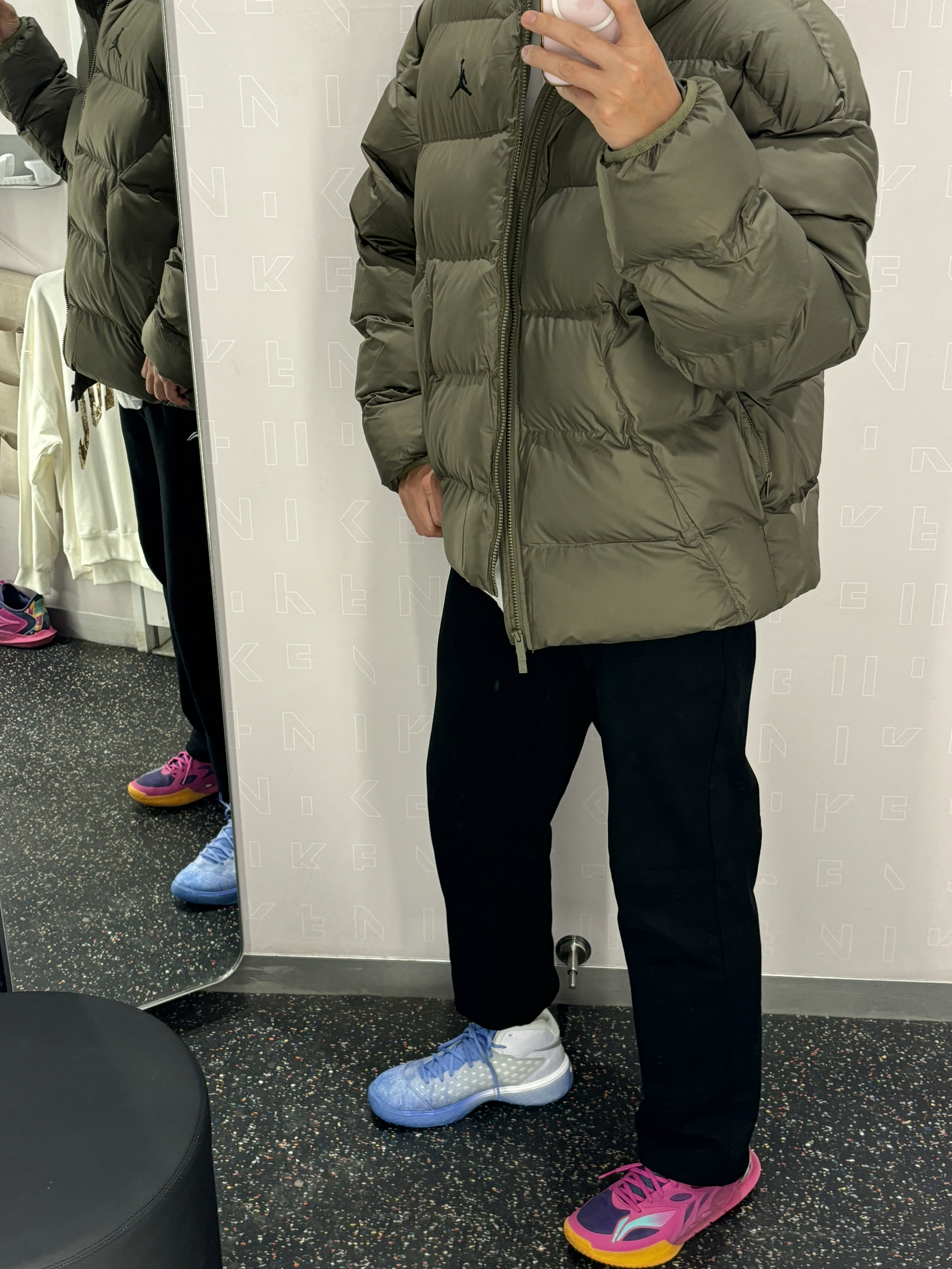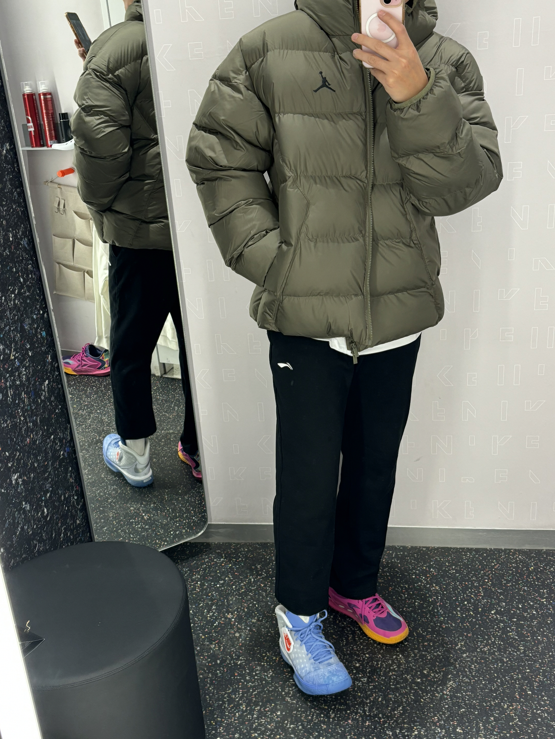 冬日叠穿法则 要想冬天穿出层次感就要这样穿 深绿色羽绒服选择大一点 长度刚好盖住屁股就行保暖还可以叠穿卫衣 里面搭配白色卫衣不戴帽子就行 搭配黑色加绒直筒裤 秋冬季节还是很有温度的 不会感觉很笨重的简单叠穿 搭配一双渐变蓝色圣诞节科比3就行 点缀一下整体不会显得颜色单调