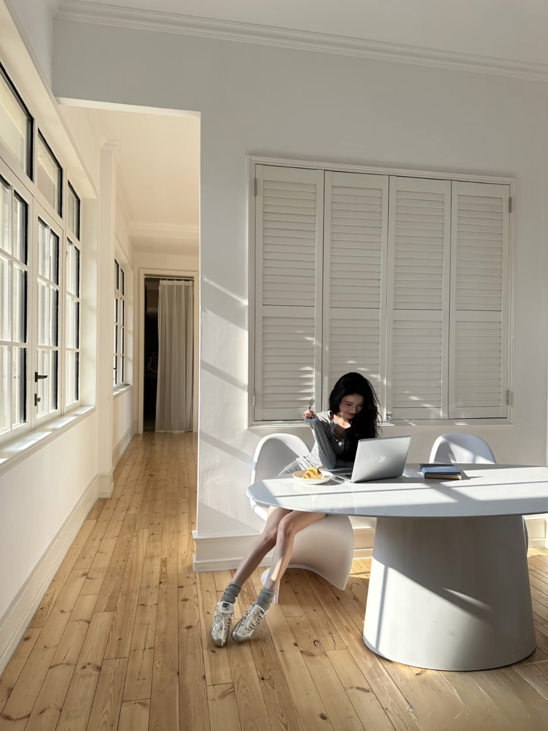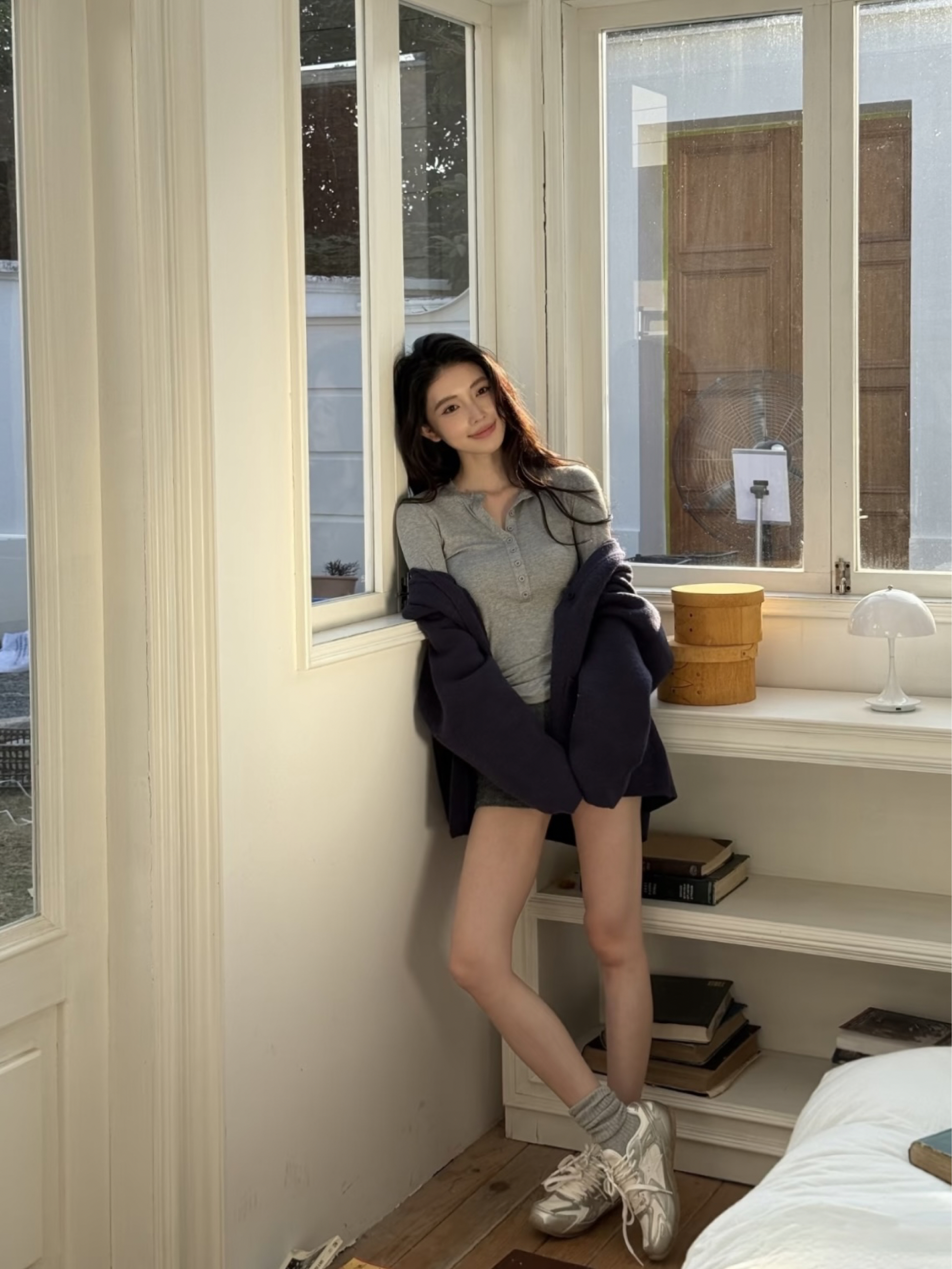 方圆这套穿搭走简约休闲的慵懒风,浅灰正肩针织衫勾勒身形,搭配深灰针织短裤形成深浅层次。 再踩上STARTER芭蕾鞋,柔媚又带点随性的运动感,适配居家、日常出街等场景,简约却不失时尚巧思。