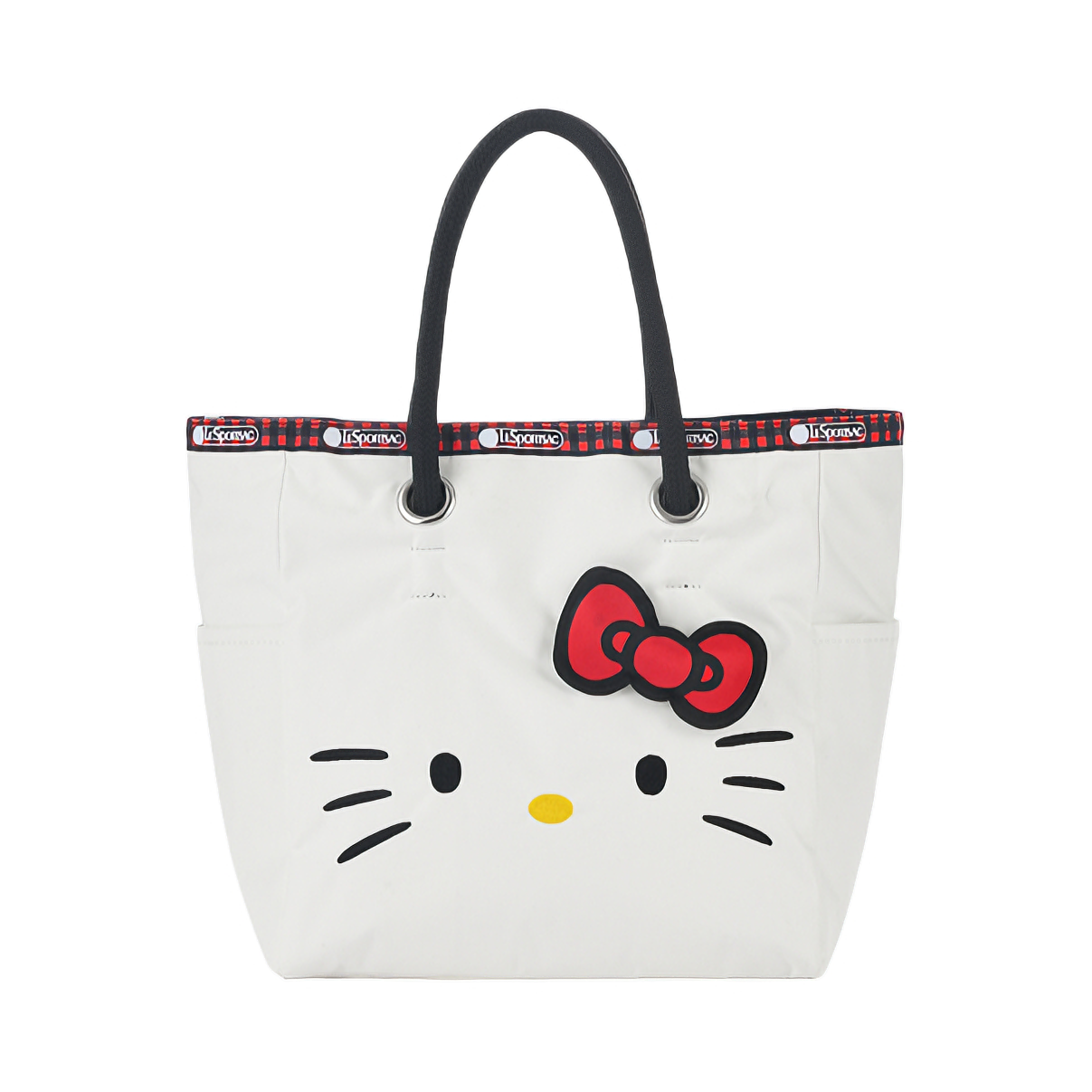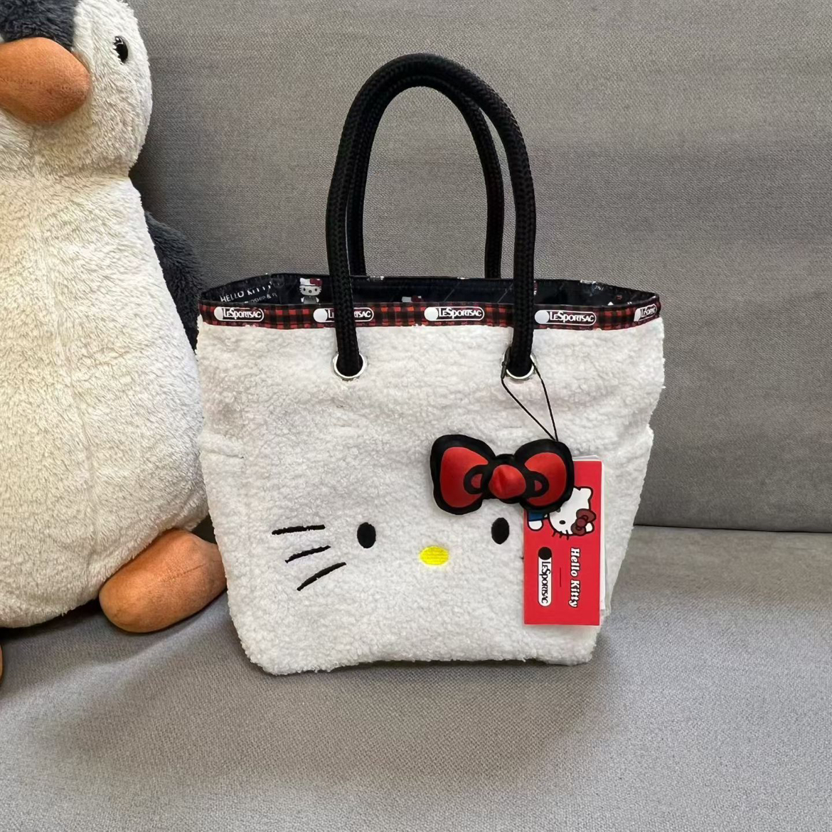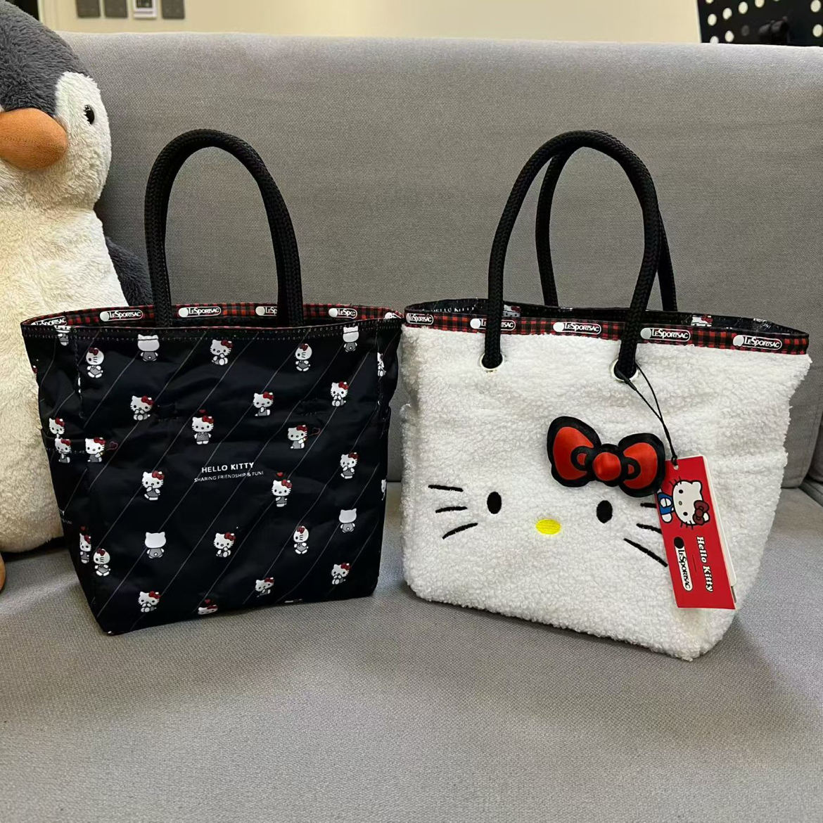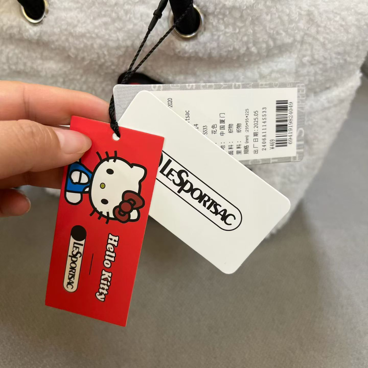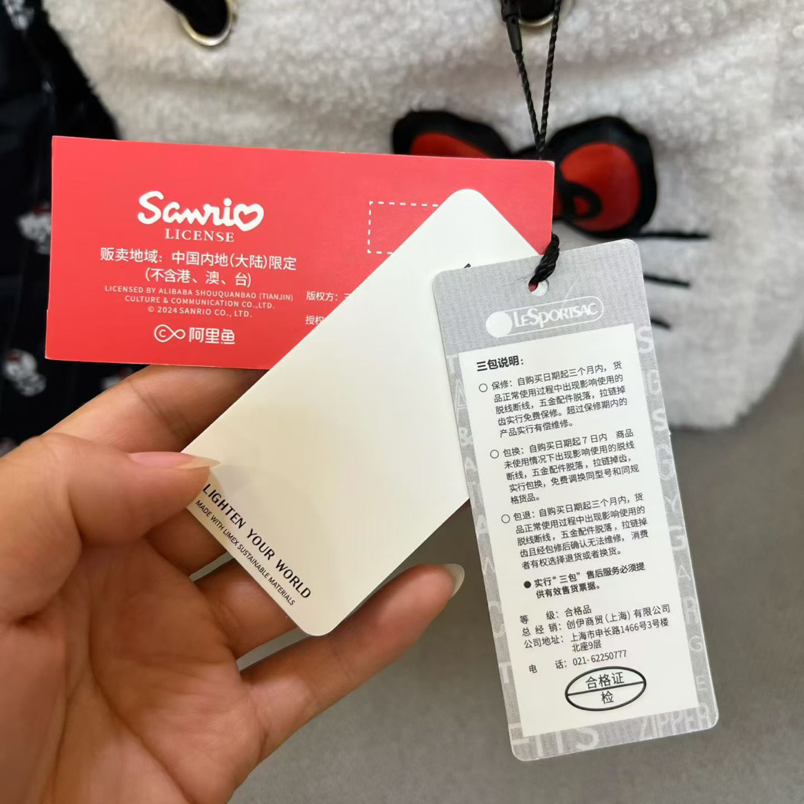 谁能拒绝Hello Kitty和LeSportsac的梦幻联动啊!红黑格纹包边搭配黑色编织提手,黑白两款各有特色:黑色款印满Kitty小图案,俏皮又百搭;白色款是软乎乎的毛绒质感,立体蝴蝶结和Kitty脸部刺绣超萌,摸起来手感巨好。吊牌上还标着中国内地限定,三丽鸥正版授权的细节拉满,妥妥的可爱与实用兼备