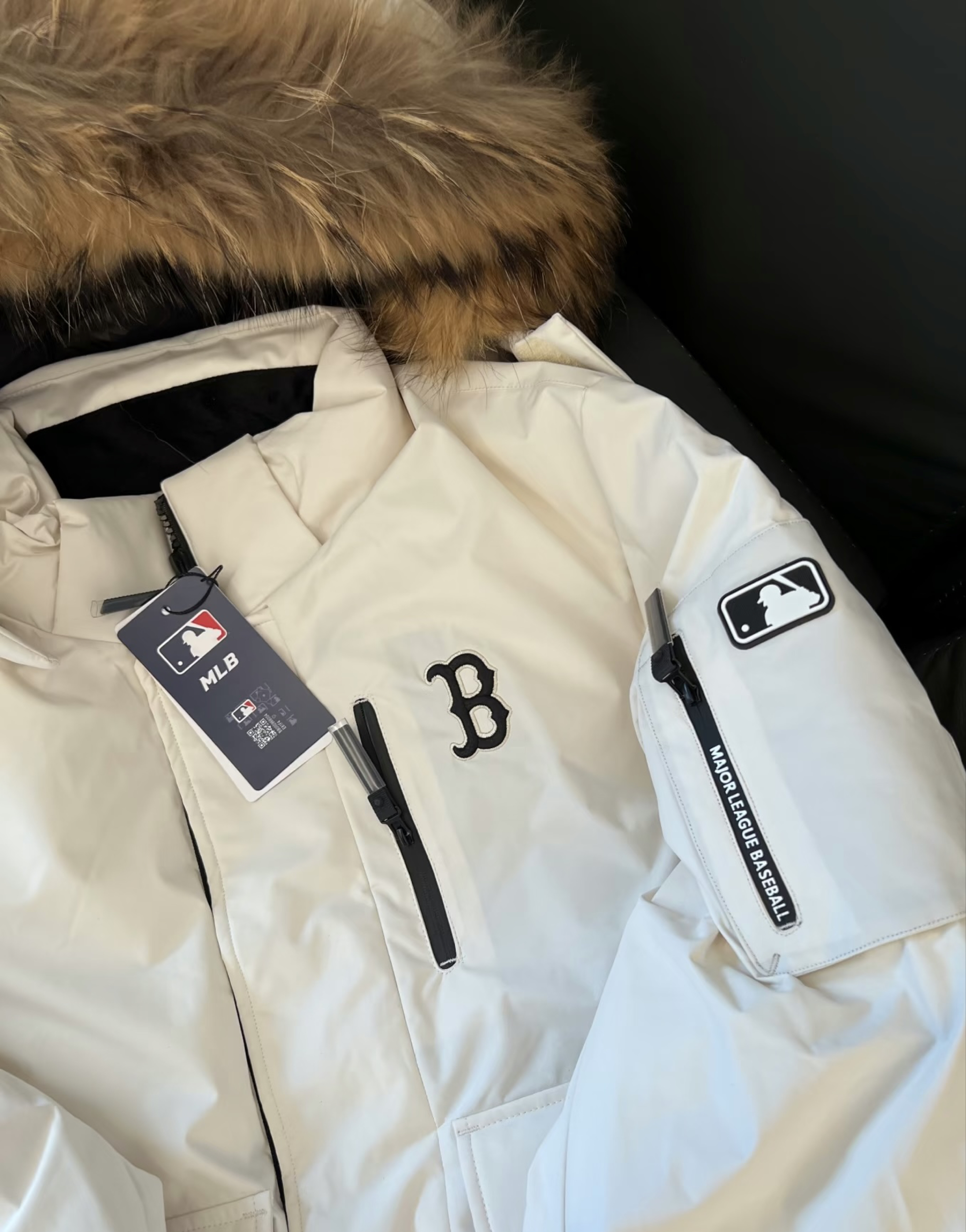 波士顿红袜队的“B”标自带美式复古感,毛领是真貉子毛!蓬松度直接把氛围感拉满,穿上秒变韩系欧尼~ 面料是防水防风的那种,下雪天穿也不怕脏,口袋巨能装,手机充电宝塞进去毫无压力! 白+黑撞色真的巨显白,配牛仔裤/鲨鱼裤都好看,这个冬天的本命外套锁死了🔒 “套上直接冲地铁!白鸭绒暖到不用裹围巾,黑标+大毛领素颜也能撑气场”