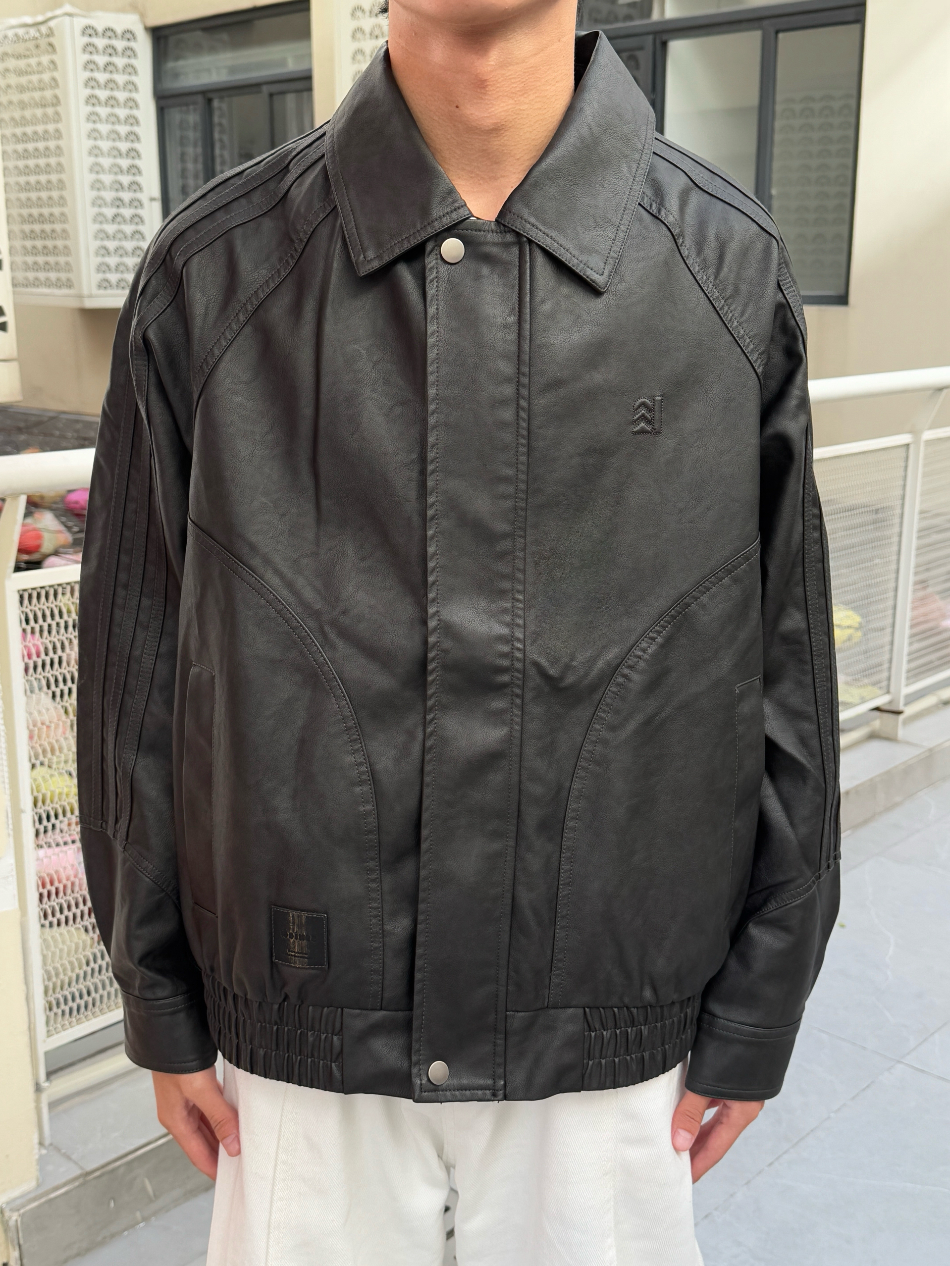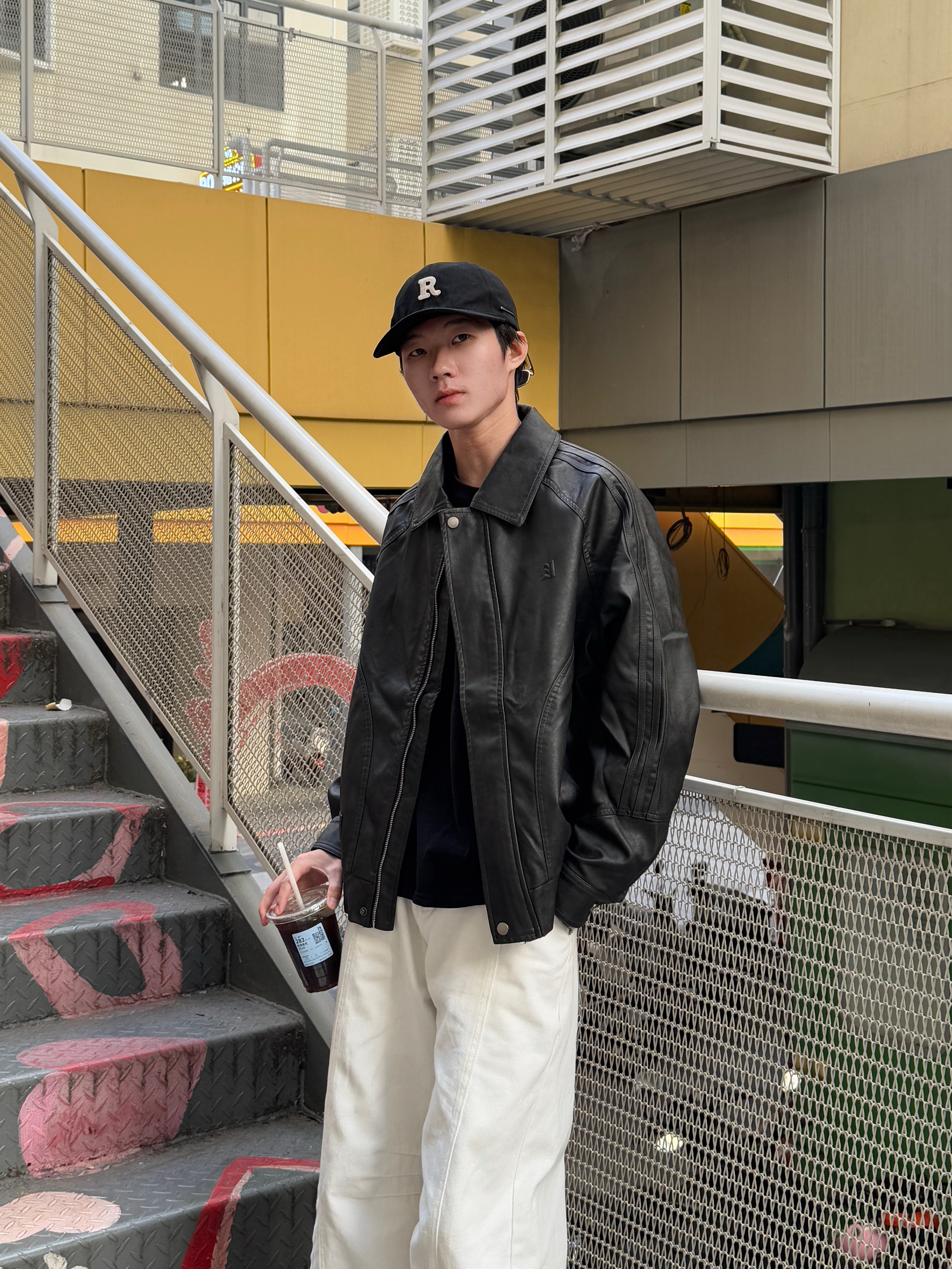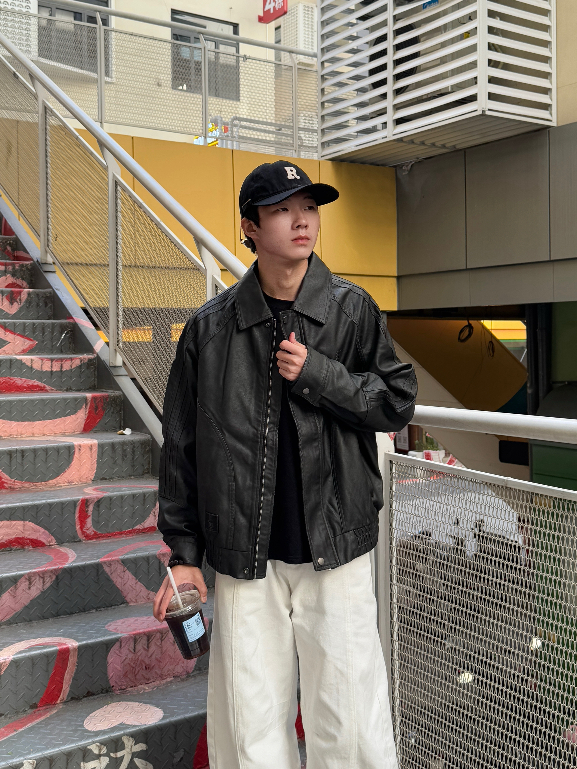 这身黑白色调穿搭太有型了 黑色美式复古飞行员PU皮夹克质感满分 光泽感皮质自带帅气buff~ 内搭黑色长袖T恤简约显瘦 下身搭配白色弯刀阔腿裤 流畅的剪裁完美平衡了上身的硬朗 走路带风气场全开 整套look复古又时髦 出街回头率稳了🕶️