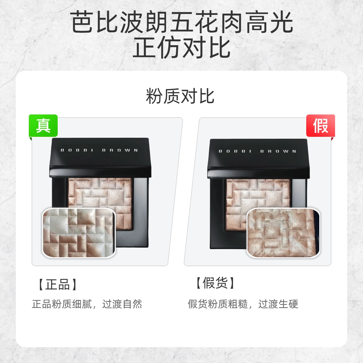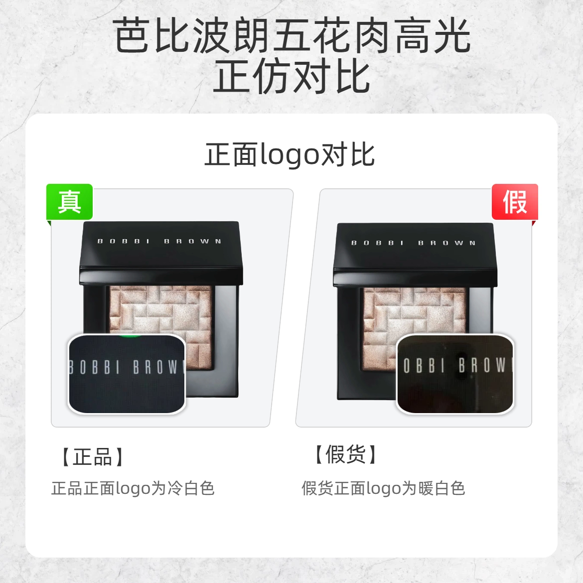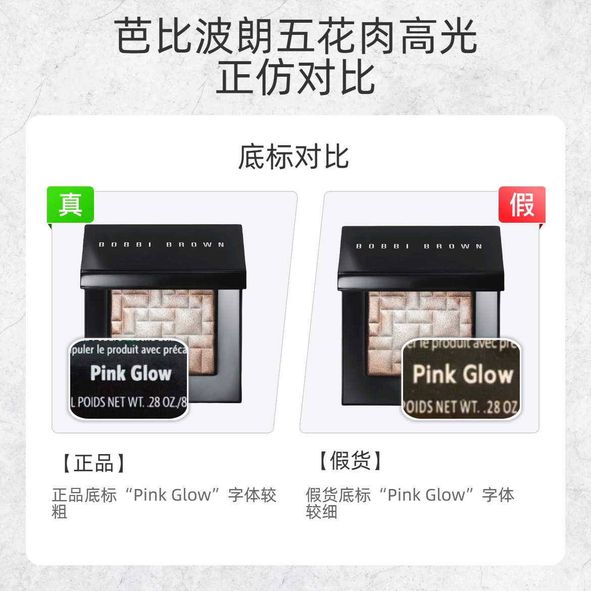 谁还没被芭比波朗的这盘五花肉高光美到过?但假货真的越来越像了!今天手把手教你辨真假👇 1️⃣ 正面 logo ✅ 正品:logo 是冷白色,字体清晰有质感 ❌ 假货:logo 偏暖白色,颜色发灰发暗 2️⃣ 底标 ✅ 正品:“Pink Glow” 字体偏粗,印刷清晰 ❌ 假货:字体纤细,边缘模糊 3️⃣ 粉质 ✅ 正品:粉压得实,纹理过渡自然,摸起来丝滑 ❌ 假货:粉质松散粗糙,纹理边界生硬...
