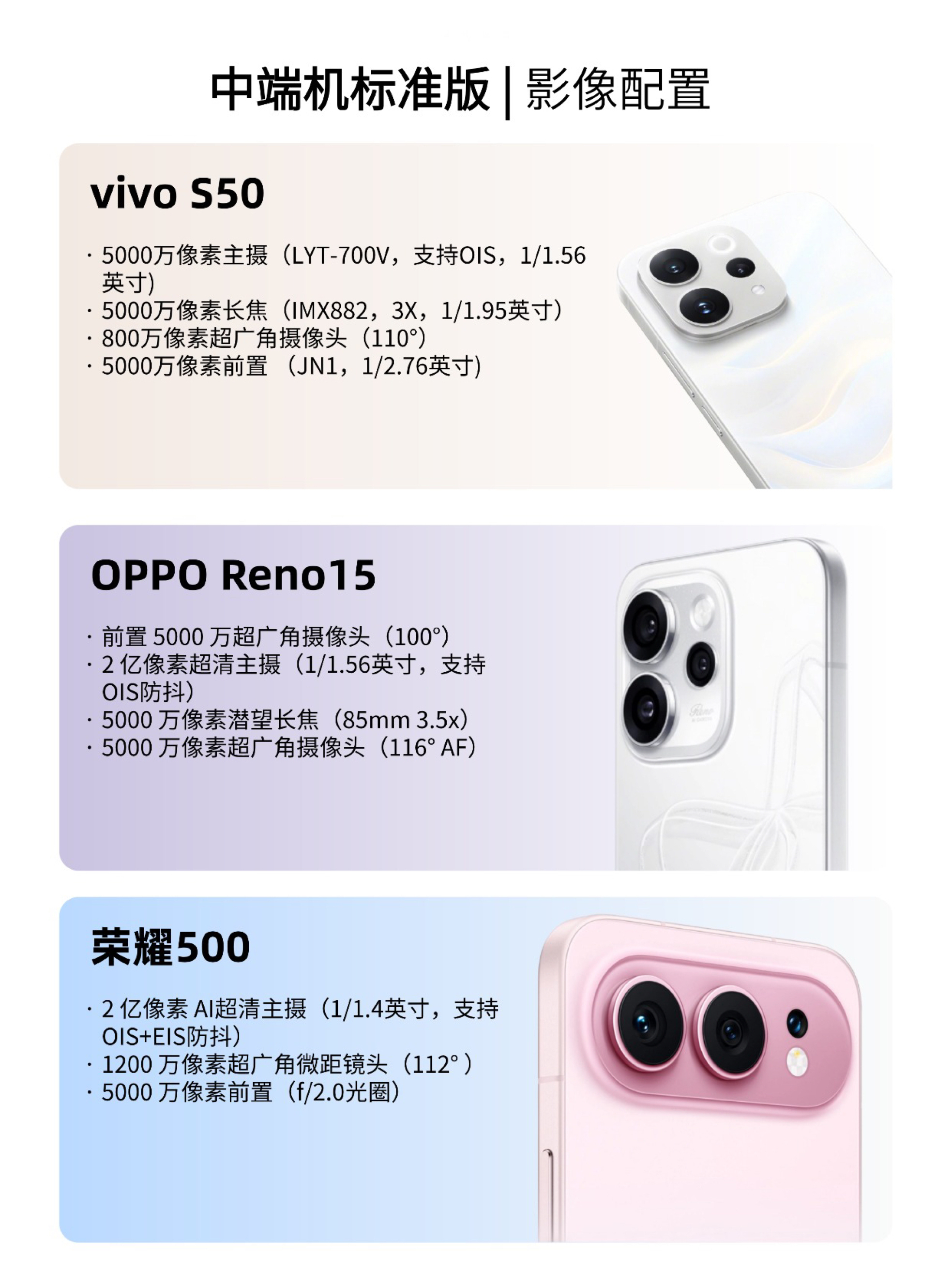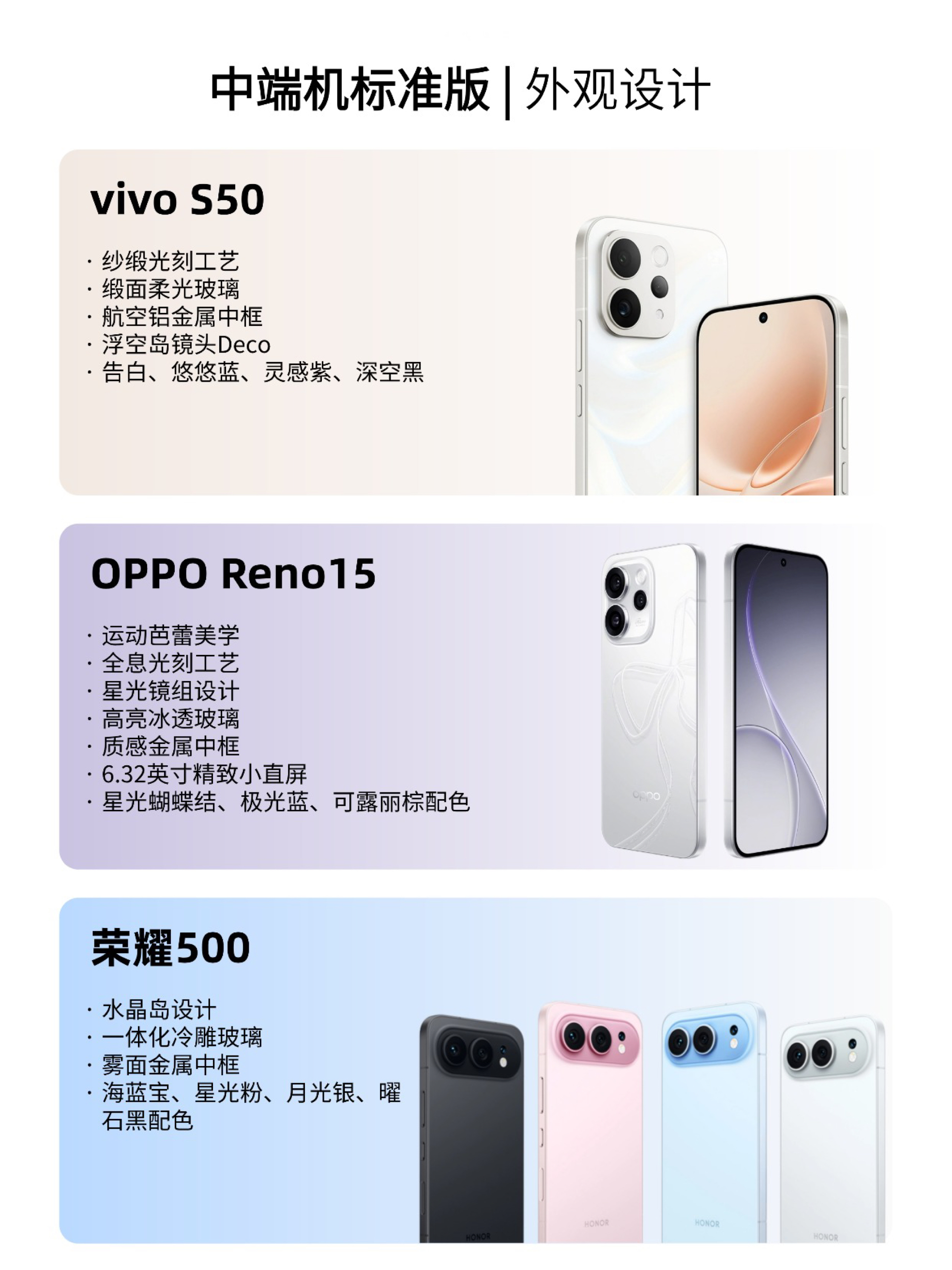 大学生购机别乱冲!推荐三款新出的中端机,OPPO Reno15、vivo S50和荣耀500,预算3K左右的宝子直接抄作业。 📱OPPO Reno15 Reno系列真的把“女大喜欢什么”刻进DNA里了,这次Reno15外观采用了运动芭蕾风,裸眼就能看到3D蝴蝶结。 镜头模组采用了一体化冷雕玻璃工艺,与背板之间过渡自然平滑,完全不像这个价位该有的质感。6.32英寸的精致小直屏握在手里刚刚好,单手回...